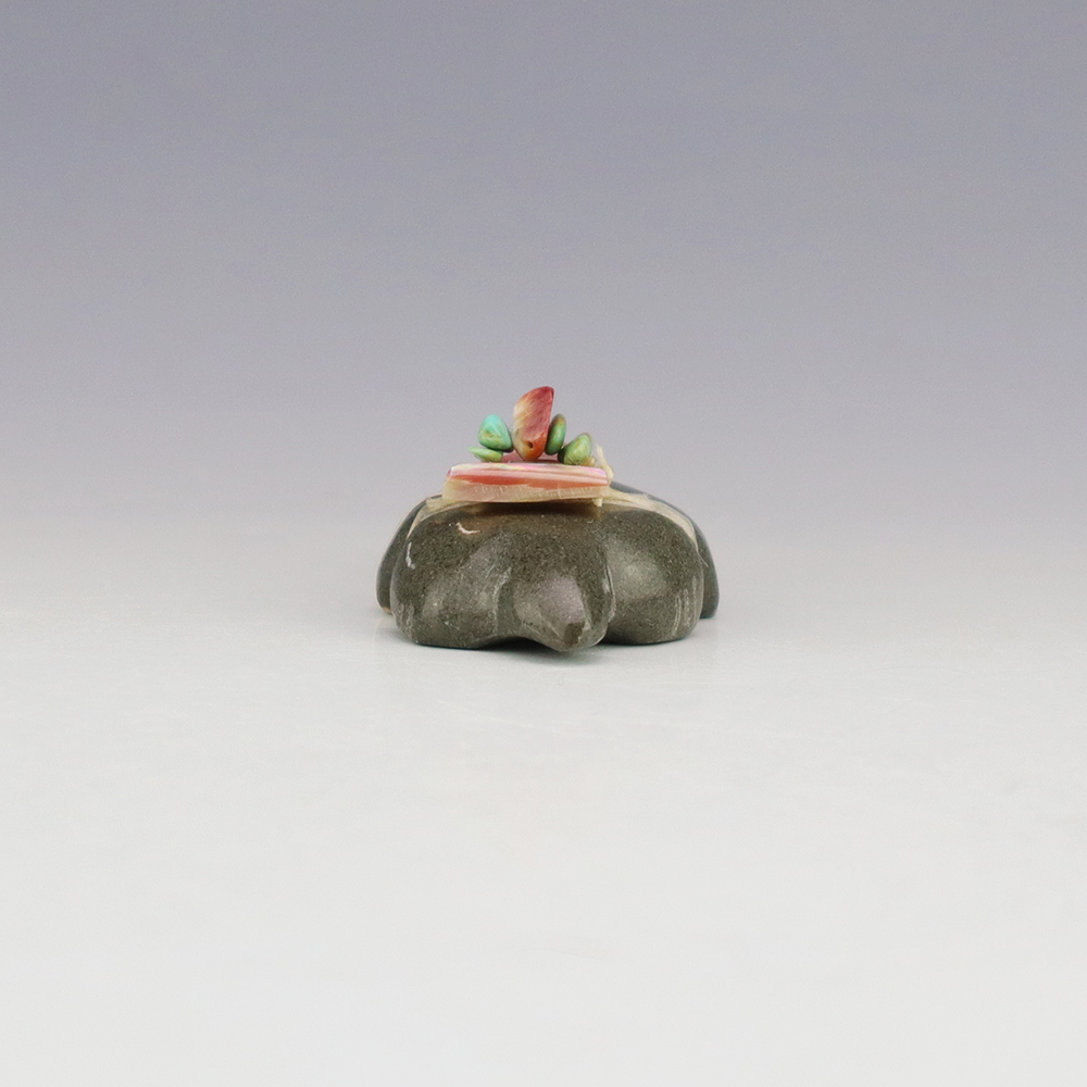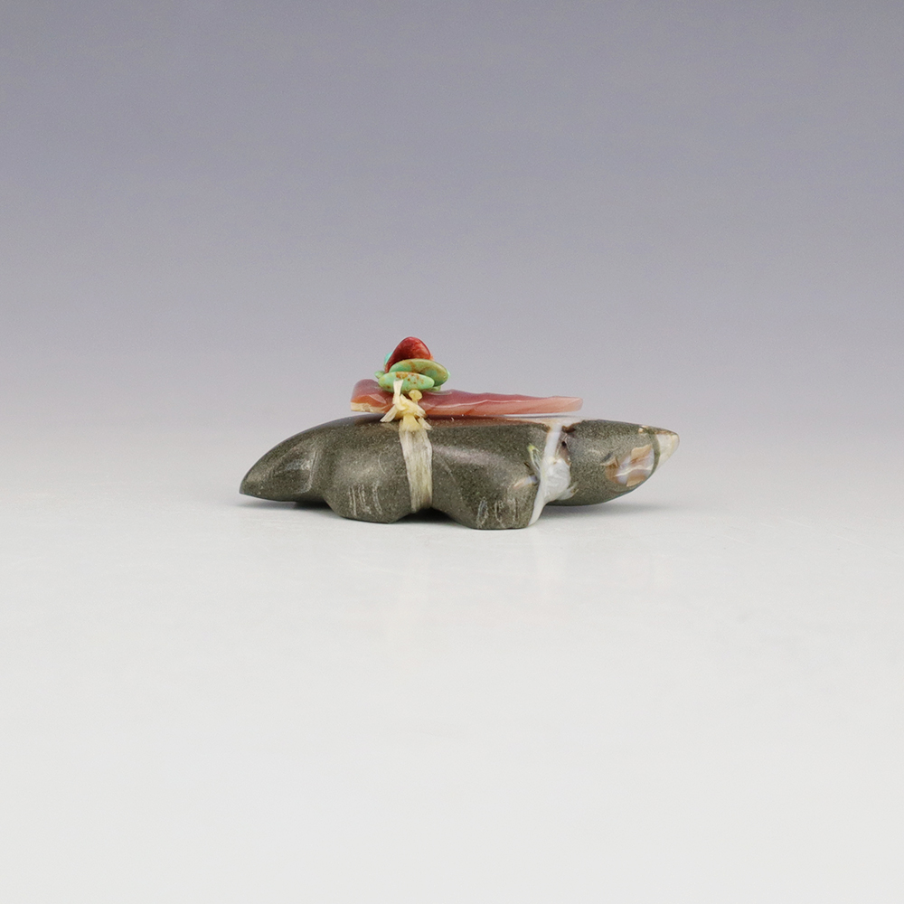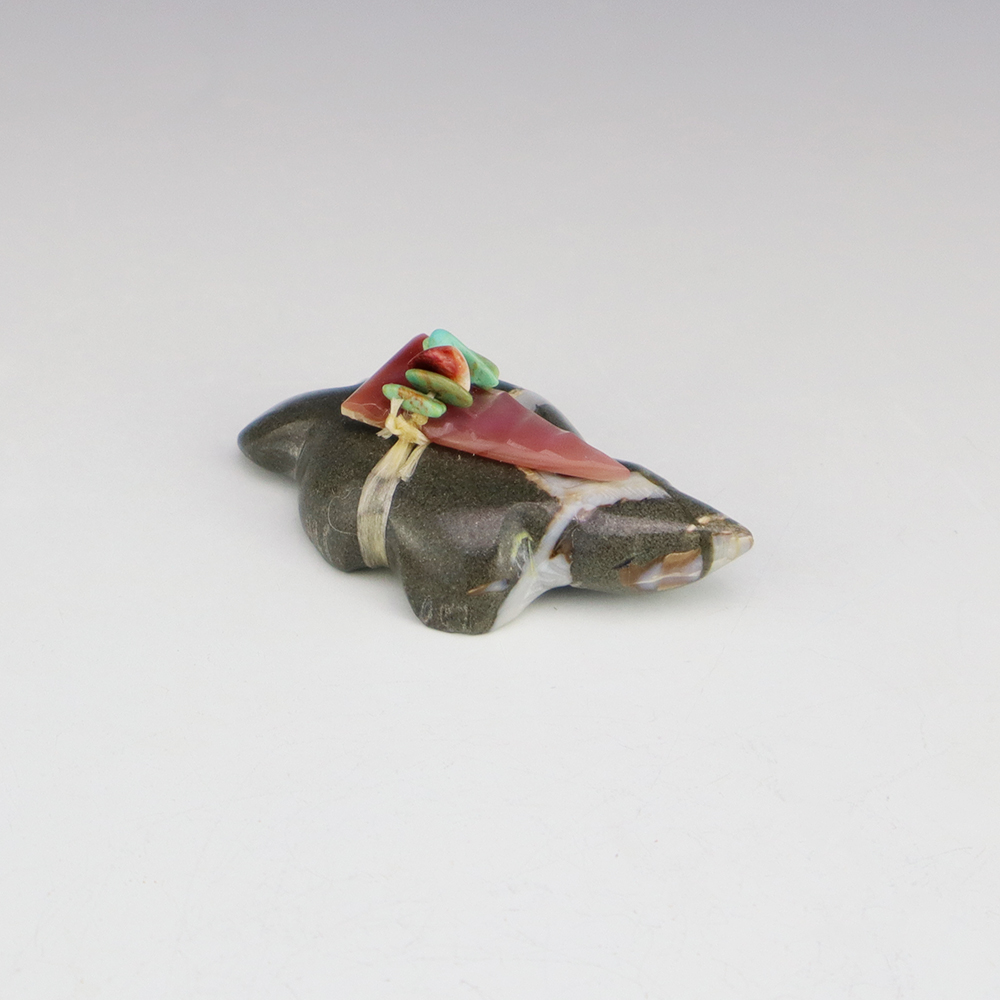Zuni Badger Fetishes represent the ability to reach a desired goal or aggressiveness and perseverance. Zuni fetish carver Evalena Boone hand crafted this fabulous badger out of Serpentine and bundled it with Pink Mussel, Shell, Coral, and Turquoise. 1 1/8” tall x 2 3/4” long x 2” wide Artist card...
