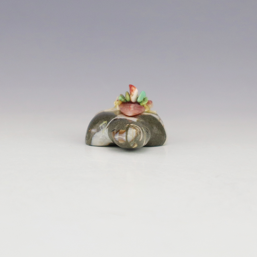 Zuni mole fetishes amplify the connection with the earth and are the protectors of the crops. The mole is also one of the six directional fetishes and represents the Underground. Zuni artist Evalena Boone made this stellar Mole fetish. Hand carved out of Purisima Stone and is bundled with Turquoise, Abalone, and Pink Mussel. This great carving would make a great addition to your Native American art or Zuni fetish collection. Signed