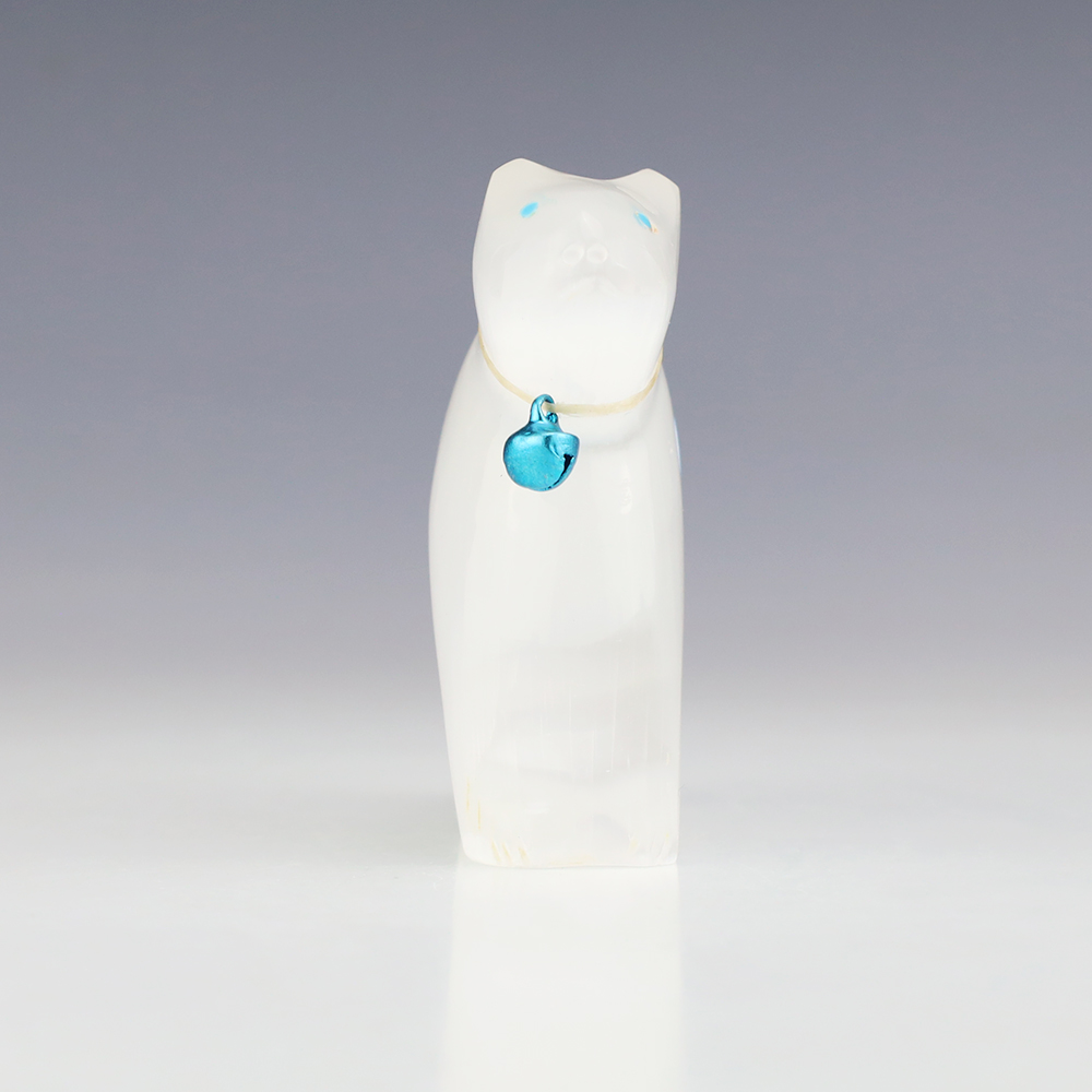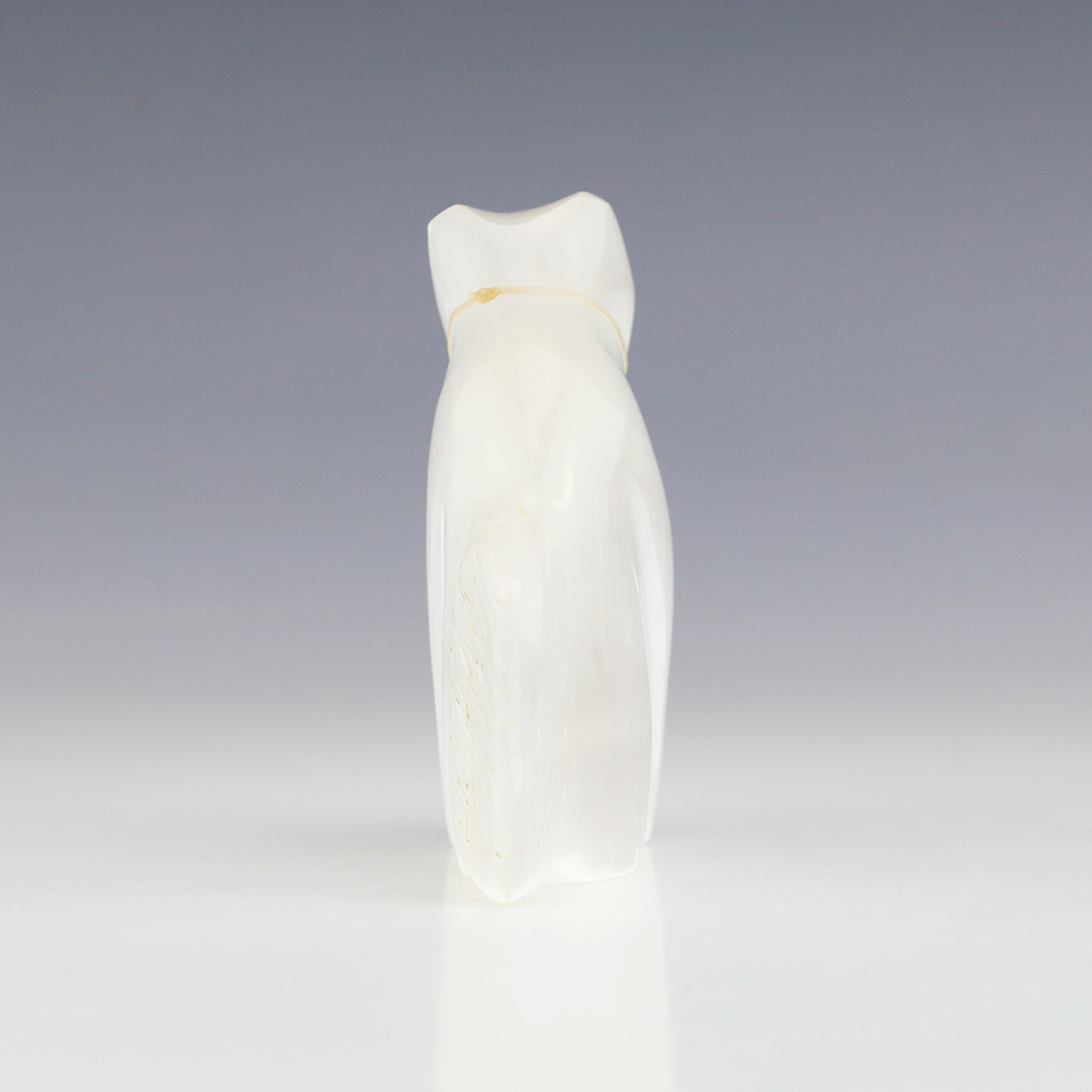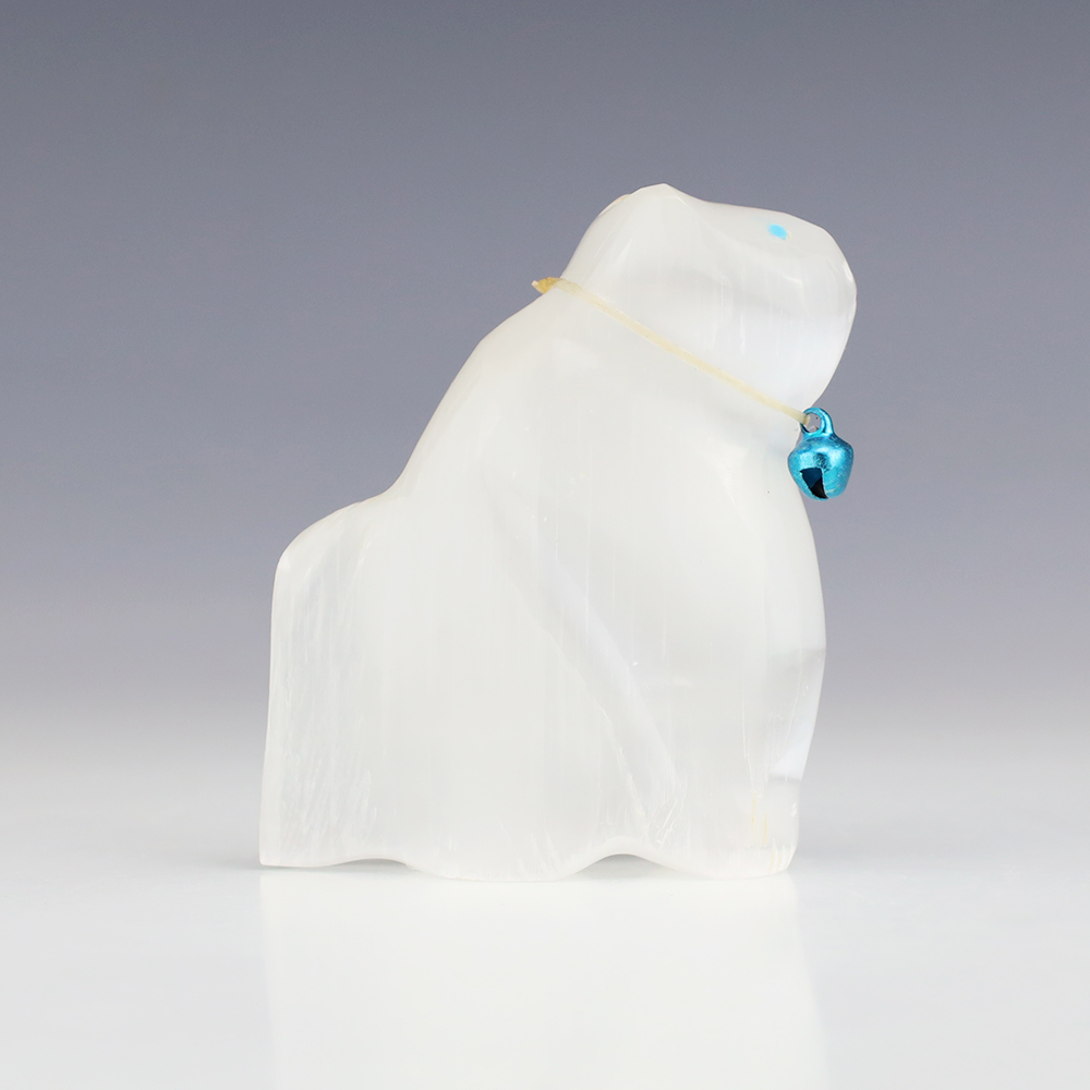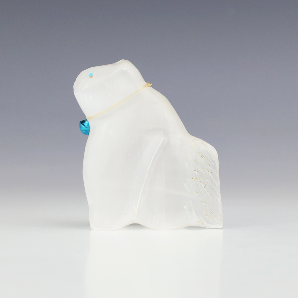 Zuni artists Leland Boone and Daphne Quam made this lovely cat fetish. Hand carved out of Selenite and his eyes are made out of Turquoise. This great carving would make a great addition to your Native American art or Zuni fetish collection. (note-there is natural pitting in the stone)