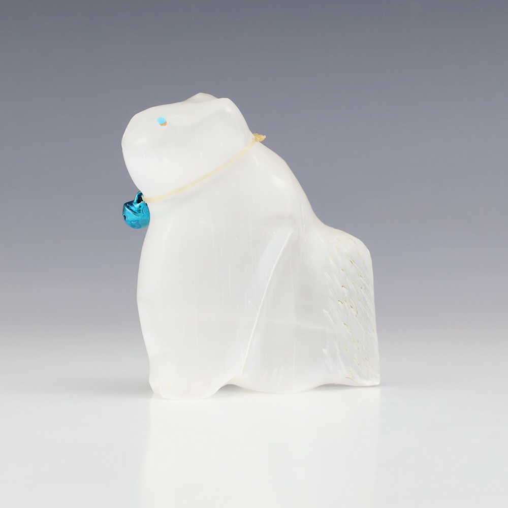 Zuni artists Leland Boone and Daphne Quam made this lovely cat fetish. Hand carved out of Selenite and his eyes are made out of Turquoise. This great carving would make a great addition to your Native American art or Zuni fetish collection. (note-there is natural pitting in the stone)