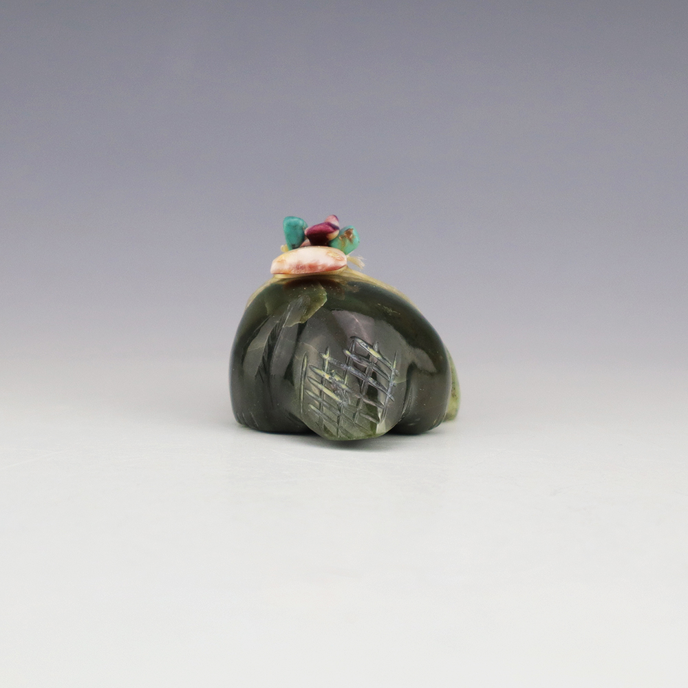 Zuni Badger Fetishes represent the ability to reach a desired goal or aggressiveness and perseverance. Zuni fetish carver Evalena Boone made this marvelous badger out of Serpentine and bundled it with Spiny Oyster and Turquoise. Signed