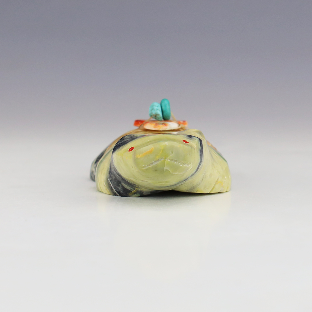Zuni fetish carver, Nelson Yatsattie hand crafted this marvelous turtle. Hand carved out of Onyx with Turquoise inlaid eyes. Zuni turtle fetishes are one of the oldest symbols of Mother Earth and they symbolize longevity. Signed 3/4” tall x 2 1/2” long x 2” wide Zuni fetishes are carvings made...