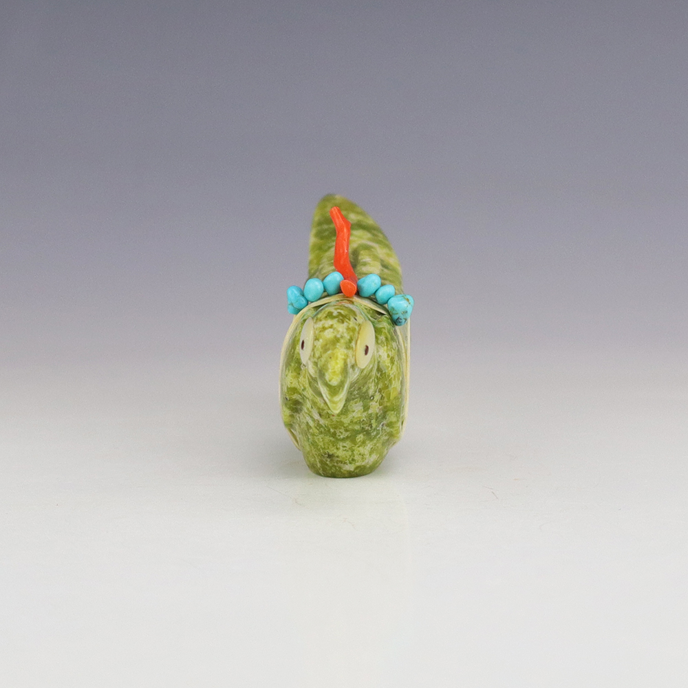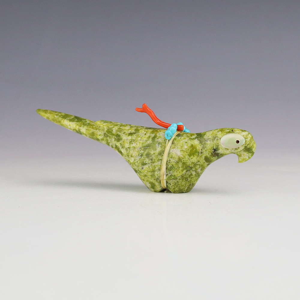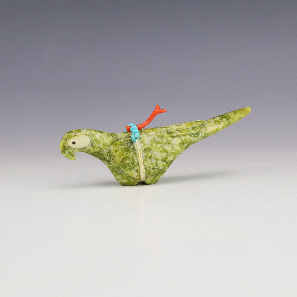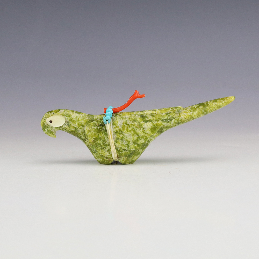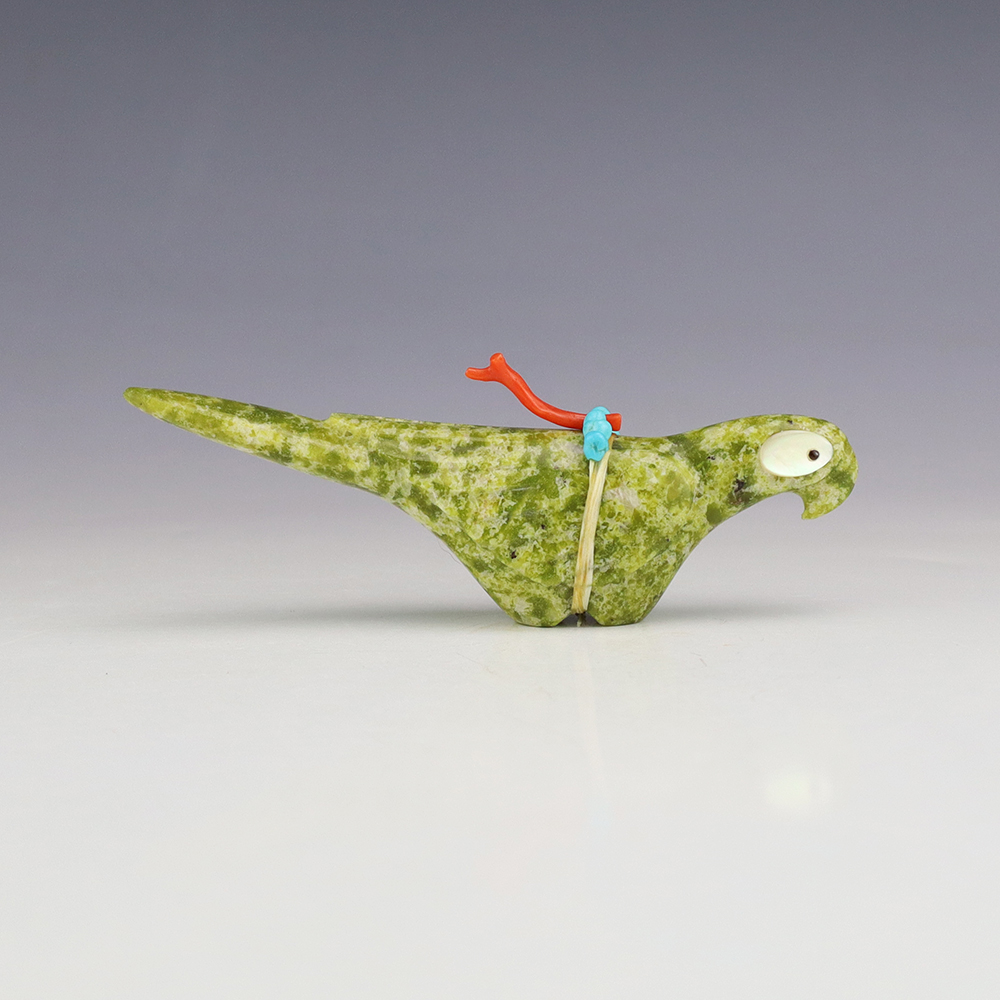 Zuni artist Gabe Sice hand crafted this exquisite Parrot fetish. The carving is made out of Serpentine and is bundled with natural Sleeping Beauty Turquoise and Coral. The Parrot’s eyes are made out of Mother of Pearl Shell and Jet. A great addition to your Native American or Zuni fetish collection. Signed