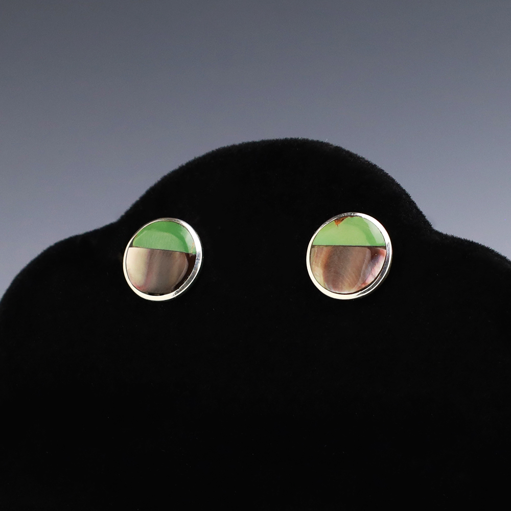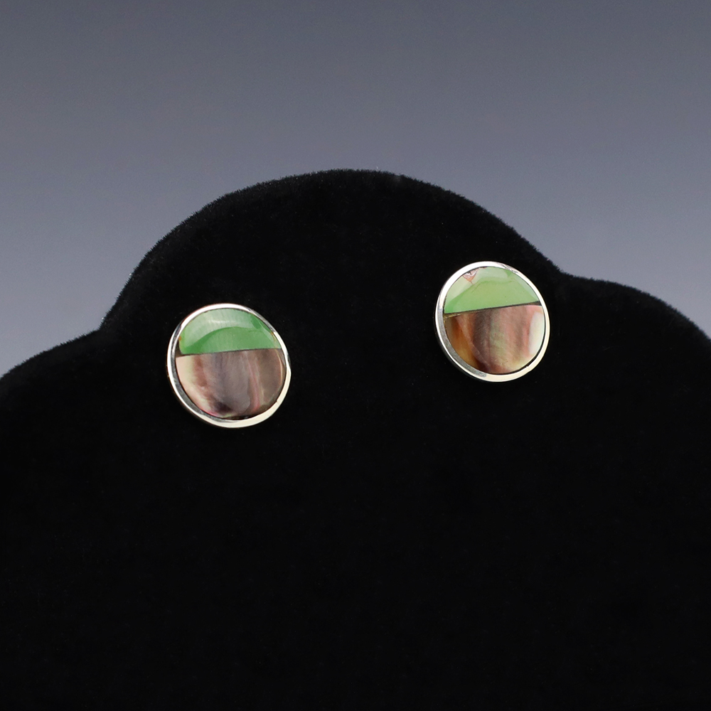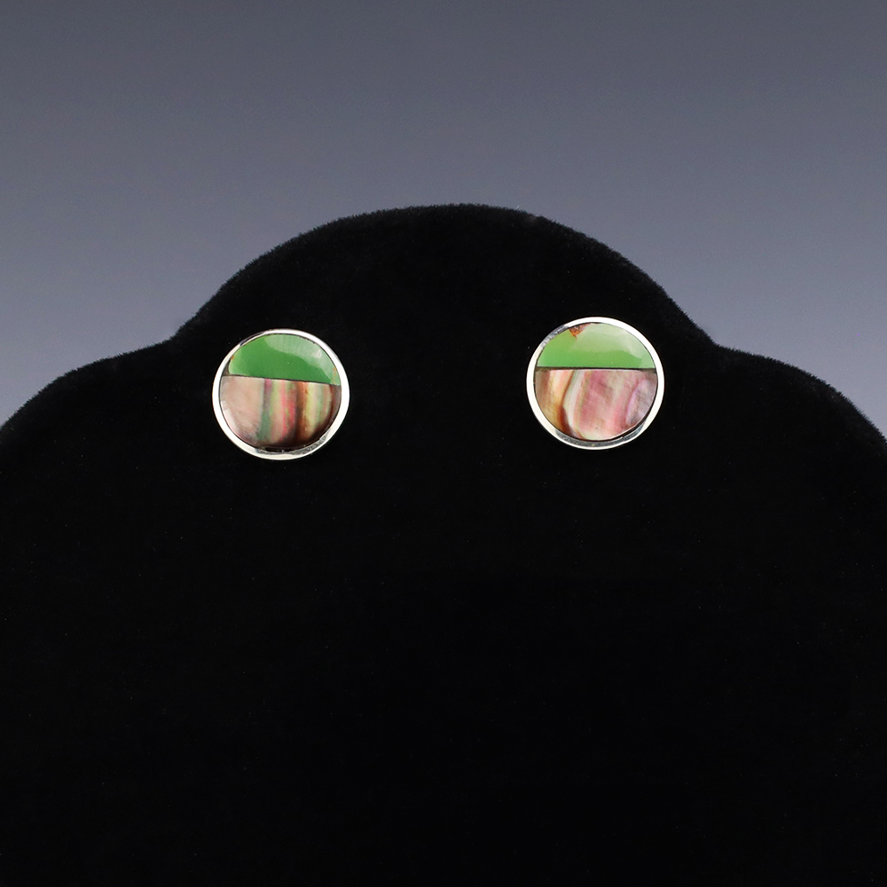 These exquisite earrings are created out of sterling silver and inlaid with Turquoise and black Mother of Pearl Shell. Hand made by Zuni artists, Nancy and Sheldon Westika. The Westikas are known for their fabulous inlay work, and these earrings are no exception. Weighs 2 grams. Signed