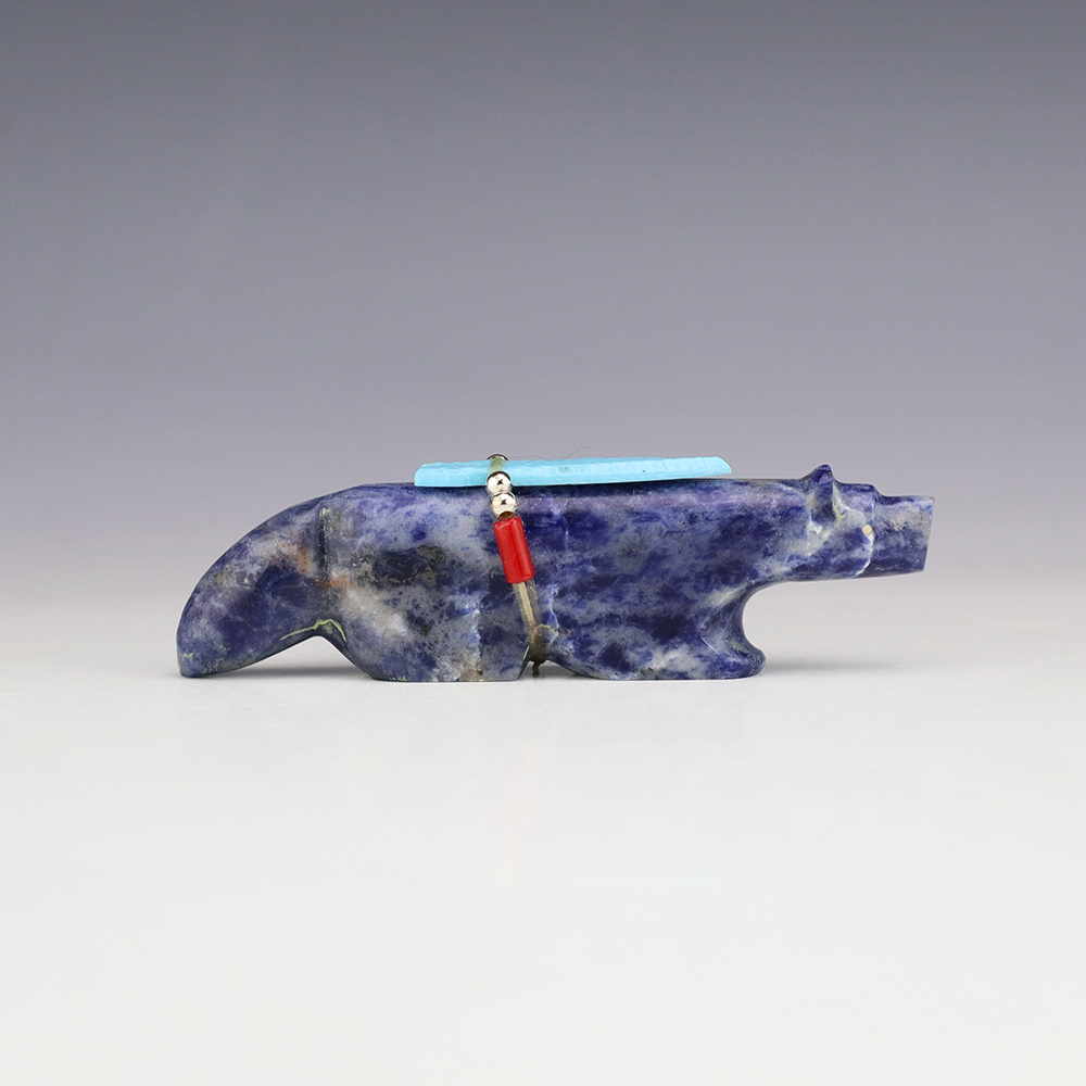 Zuni fetish carver Todd Westika carved this marvelous Wolf fetish out Sodalite and bundled with Turquoise, Coral, and silver. Wolves are the Guardian animal of the East and a powerful hunting fetish. They also represent teachers and pathfinders. A great addition to your Native American or Zuni fetish collection. Signed