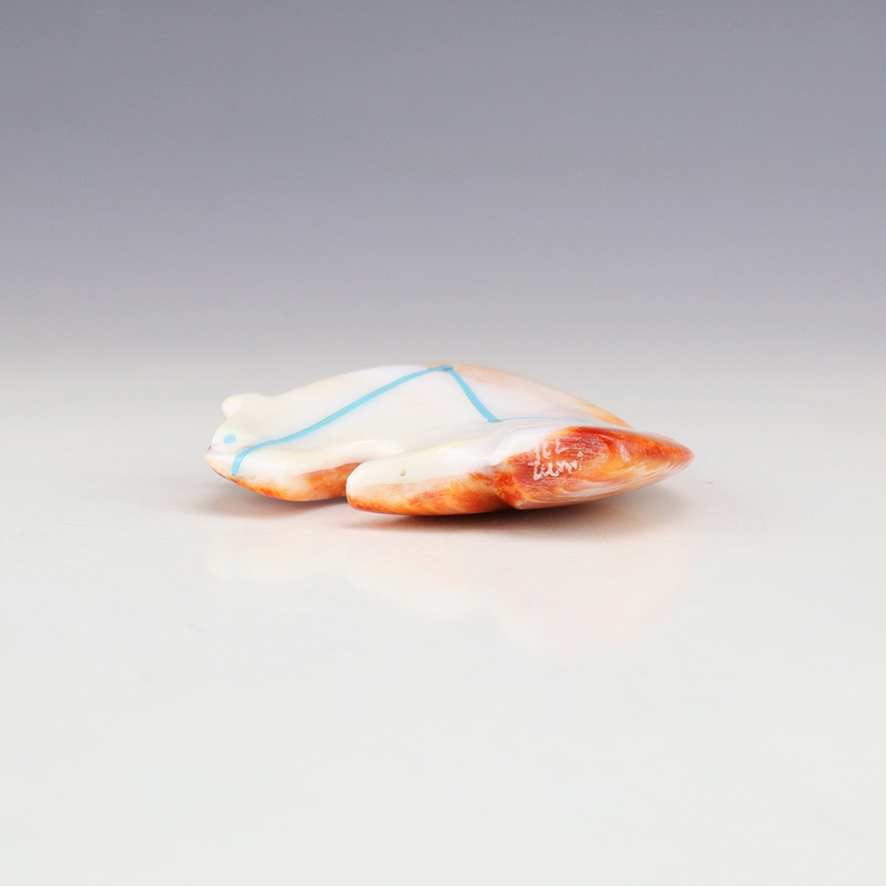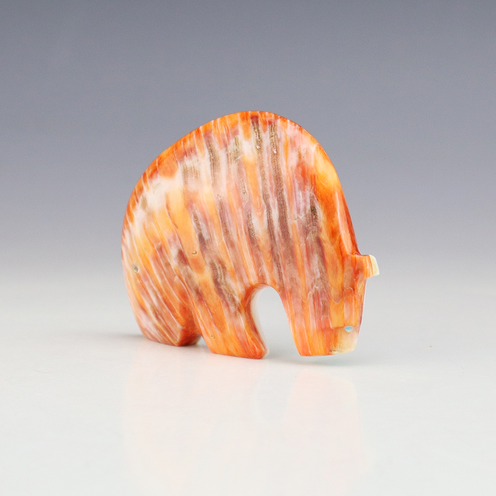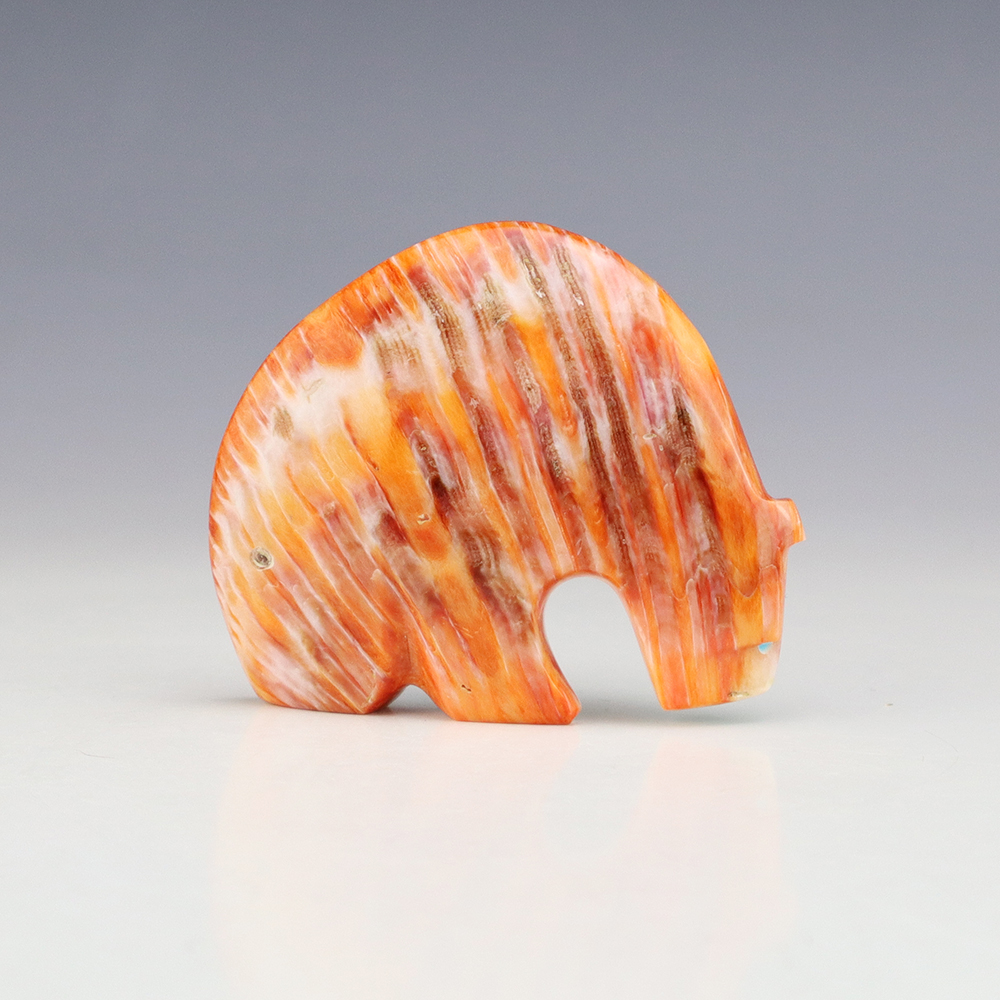 Zuni bear fetishes represent healing and strength. Zuni artist Kenric Laiwakete made this fabulous bear fetish. The bear carving is made out of Spiny Oyster, and has an inlaid Turquoise heartline. This great carving would make a great addition to your Native American art or Zuni fetish collection. Signed (note-the bear stands but is unsteady and would be best on a flat surface that won’t be moved)
