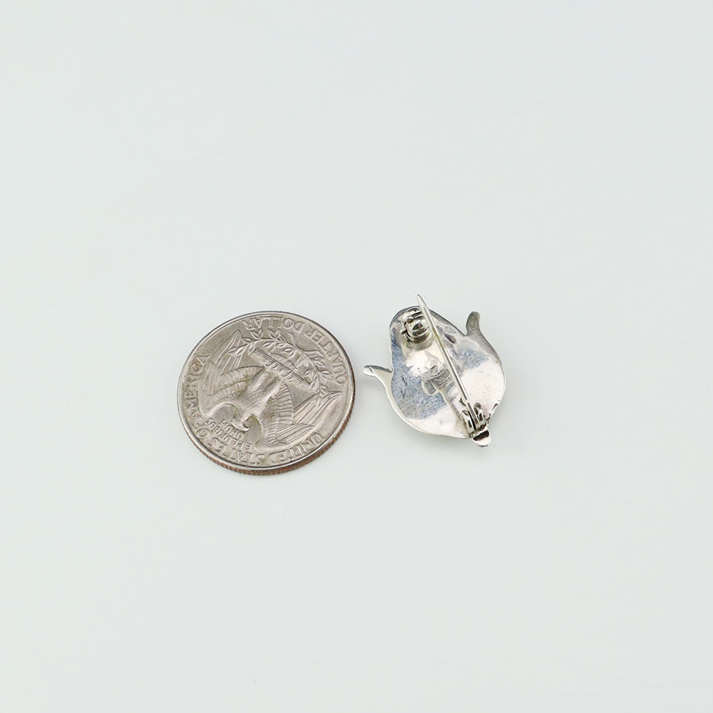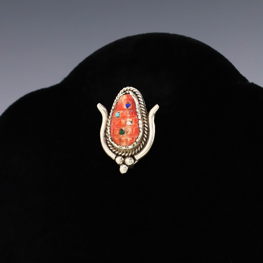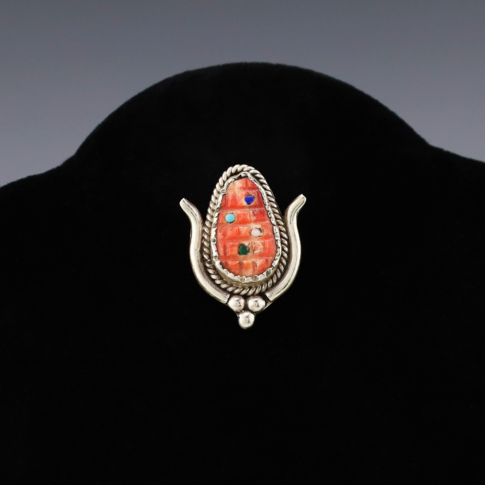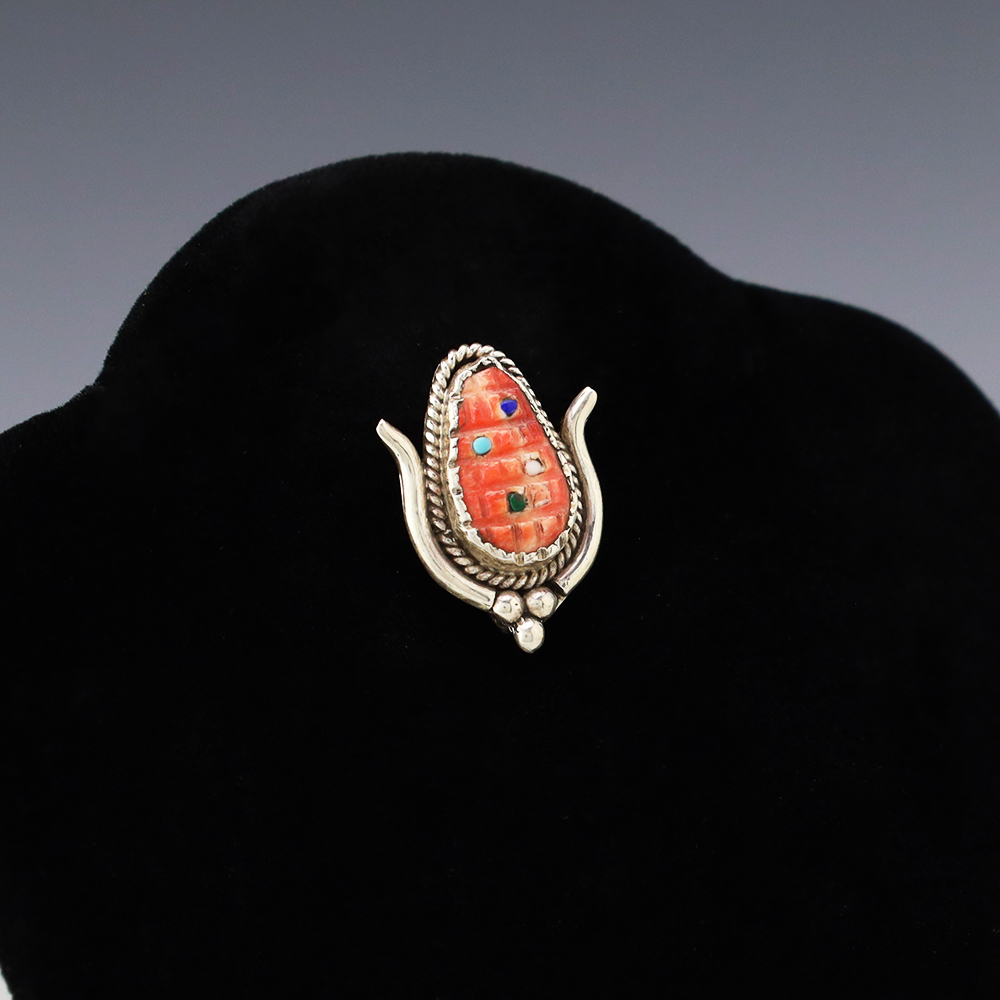 Zuni artist Tracy Bowekaty made this beautiful corn pin. Zuni artists are known for their fine lapidary skills. Each stone is hand cut, polished, and set into a sterling silver setting. The pendant is inlaid with Mother of Pearl Shell, Turquoise, Spiny Oyster, Malachite, and Lapis. Weighs 2 grams. Signed.