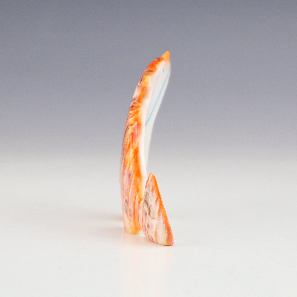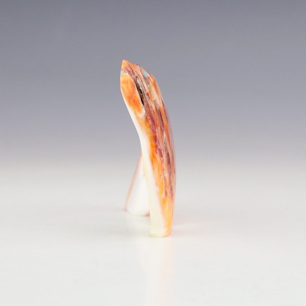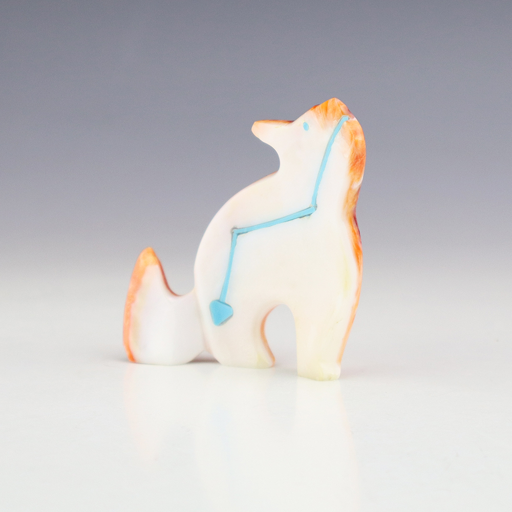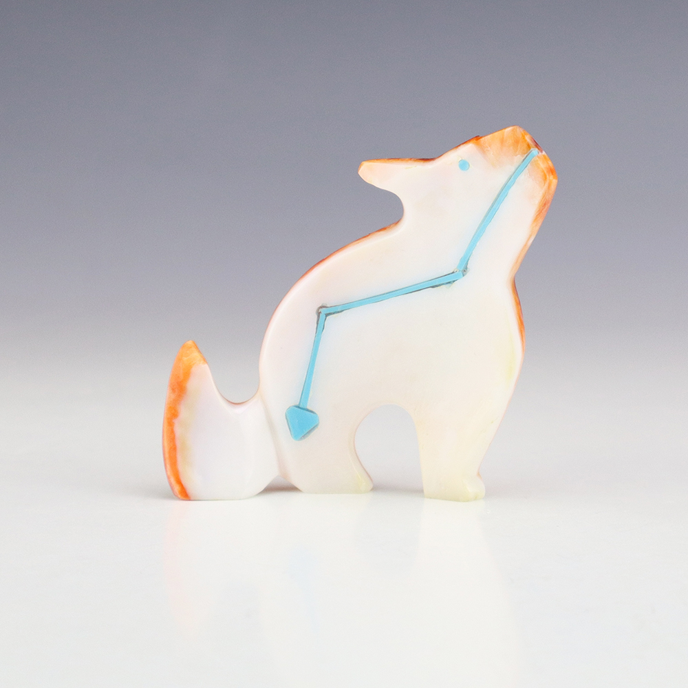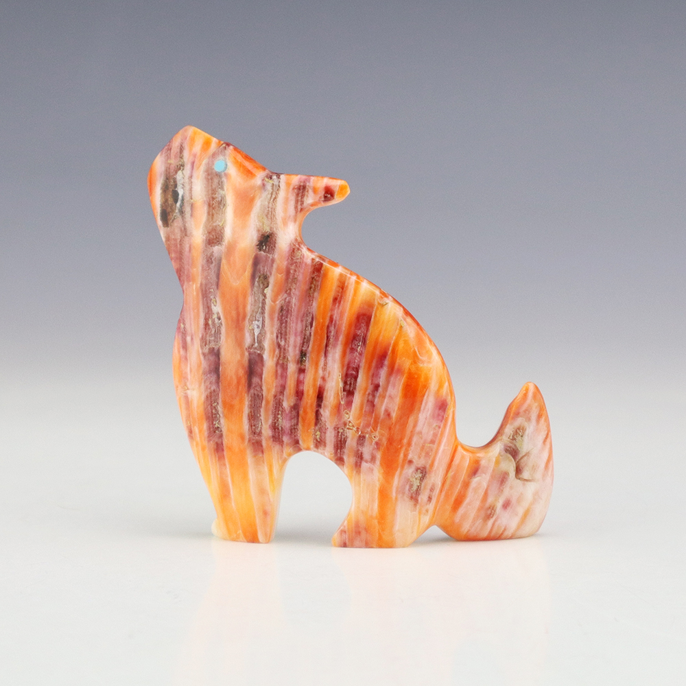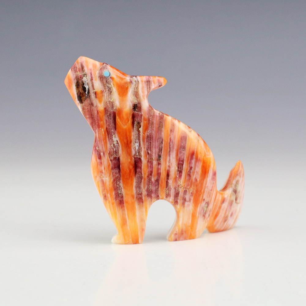Zuni artist Kenric Laiwakete hand carved this outstanding coyote fetish. The carving is made out of Spiny Oyster and has an inlaid Turquoise heartline. The coyote is the Hunter of the West. The coyote is respected for his knowledge and survival skills, if not for his actions. The master trickster who often tricks himself. He represents humor and the ability to laugh at one’s own mistakes. This great carving would make a great addition to your Native American art or Zuni fetish collection. Signed
