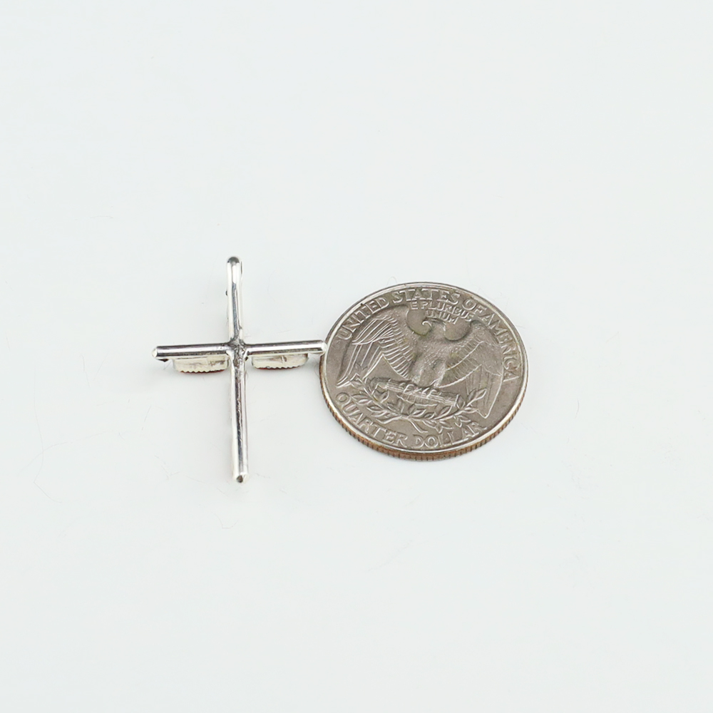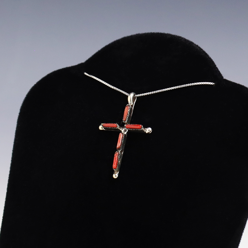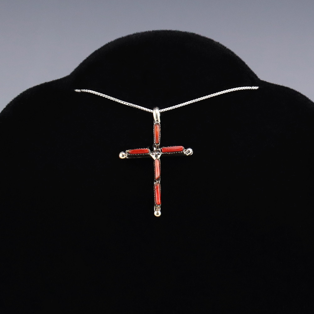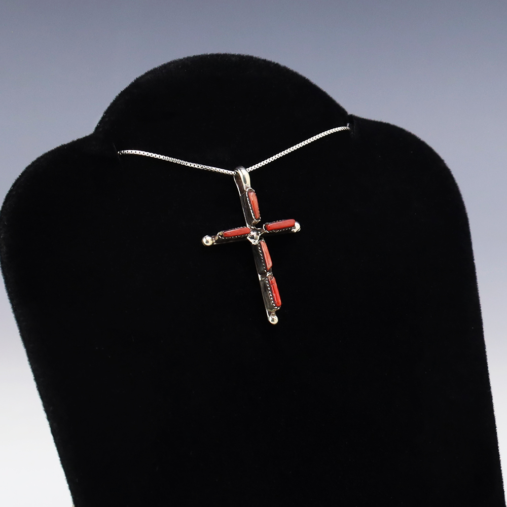 Lovely cross pendant made out of sterling silver and Coral by Zuni artist Jill Peywa. Zuni artists are known for their fine lapidary skills. Each stone is hand cut, polished, and set into a sterling silver setting. Weighs 2 grams. (Chain not included)