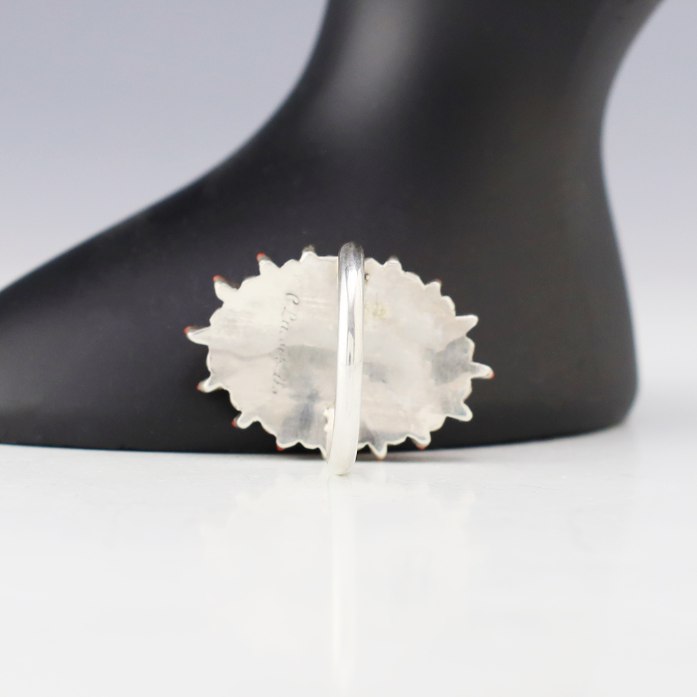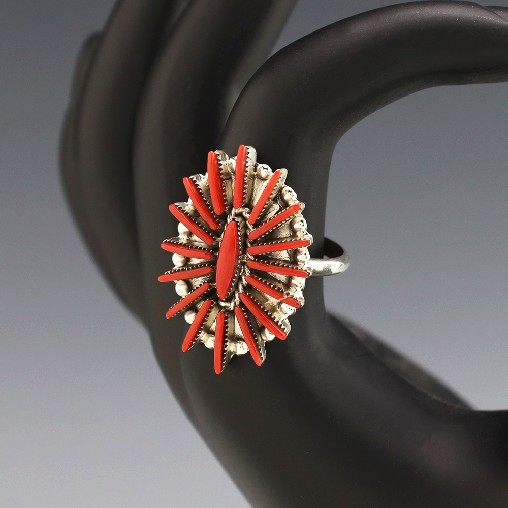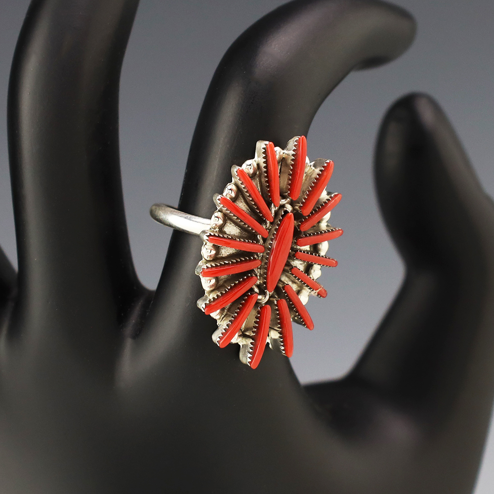 Zuni artists are known for their fine lapidary skills. Each stone is hand cut, polished, and set into a sterling silver setting. The ring is set with Coral stones. Hand made by Zuni artist Carla Laconsello . Weighs 4 grams. Size 8 3/4. Signed