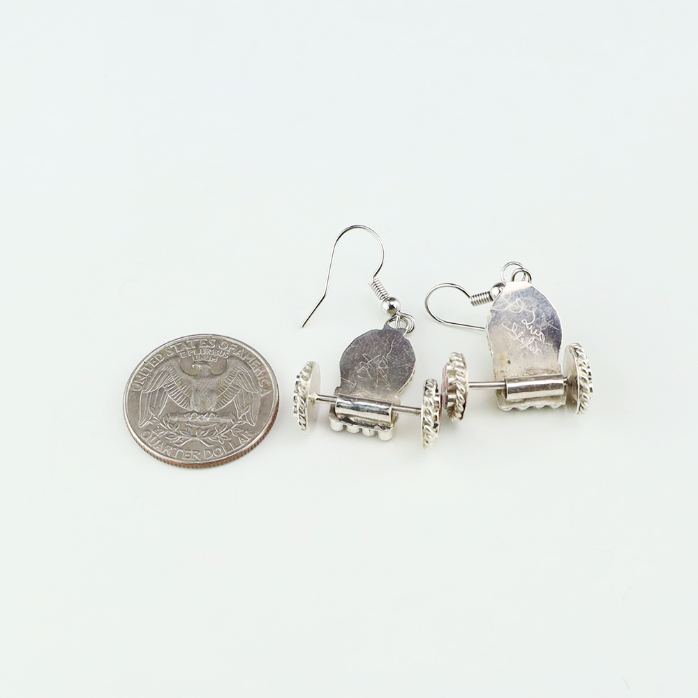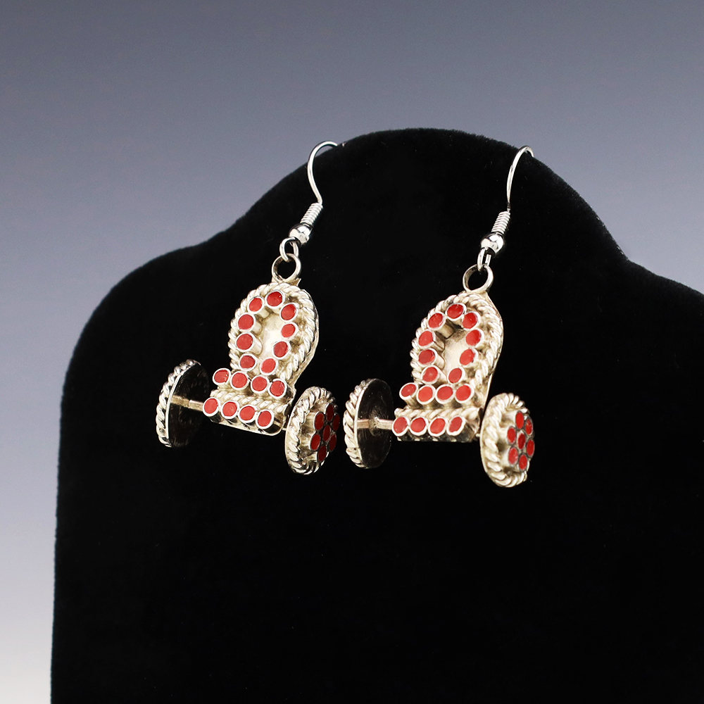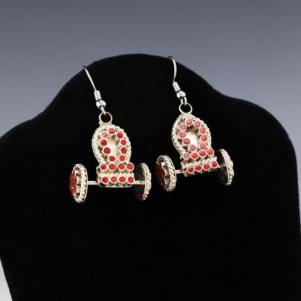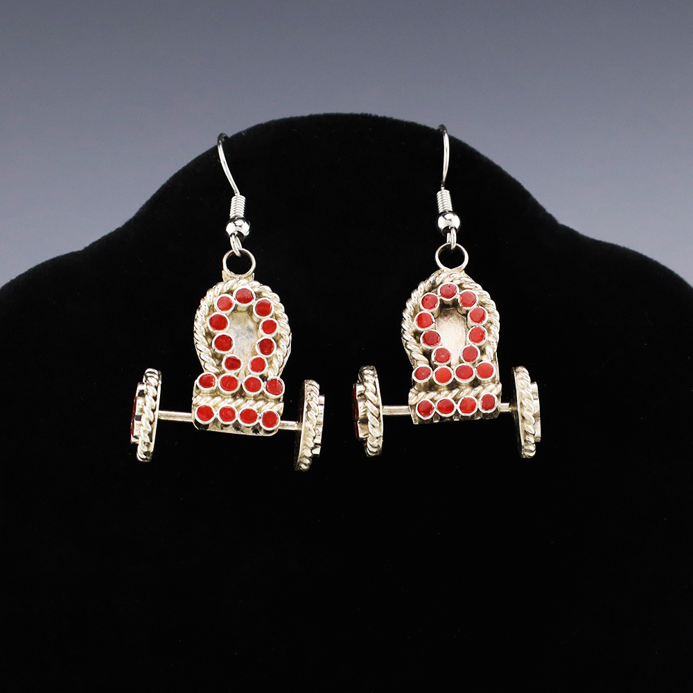 Zuni artist Devin Quam created these stellar wagon earrings. Made out of sterling silver and inlaid with Coral. Weighs 10 grams. Signed
