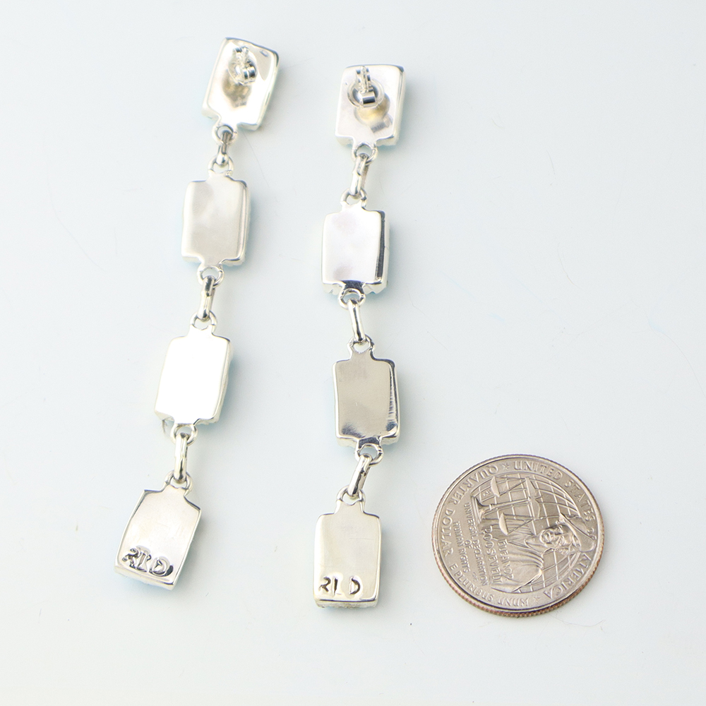 Gorgeous earrings hand made out of sterling silver and turquoise. Hand made by Navajo silversmiths Eva and Linberg Billah. These fabulous earrings will become a versatile accessory in your jewelry collection. Weighs 14 grams. Signed.    1 1/8″ x 1 3/4″    With ear wires are 2 1/4” in length. The Navajos...