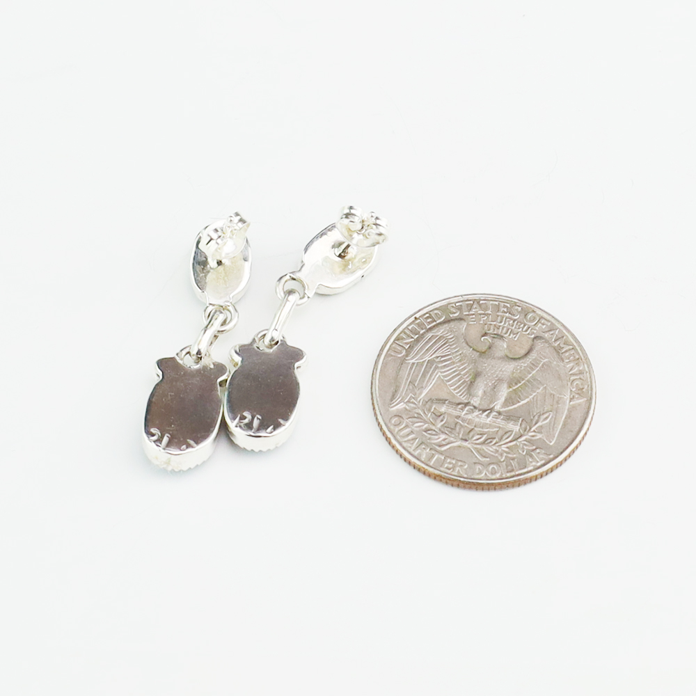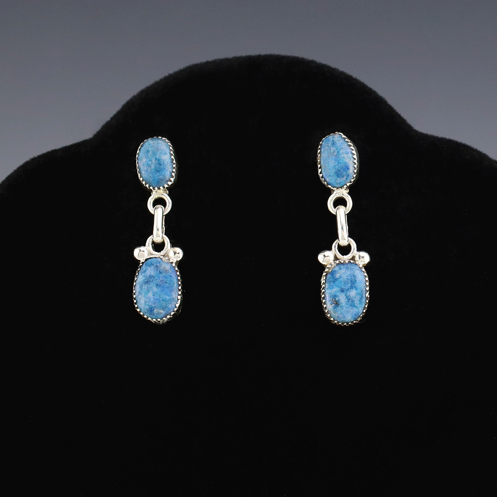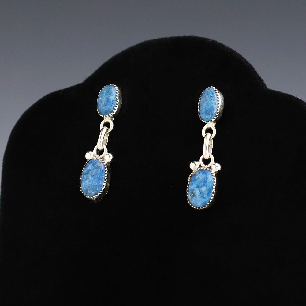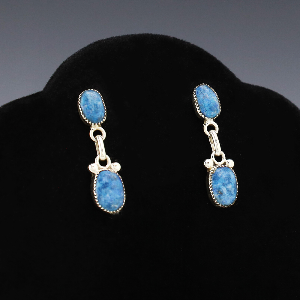 Zuni artist, Diane Lonjose made these beautiful earrings. Made out of sterling silver and set with natural Denim Lapis stones. The components are all hand fabricated, and the stones are all natural. Diane comes from a family of Zuni jewelers. She is the daughter of Alice and Duane Quam, and grandchild of Doris and Warren Ondelacy. Weighs 4 grams. Signed