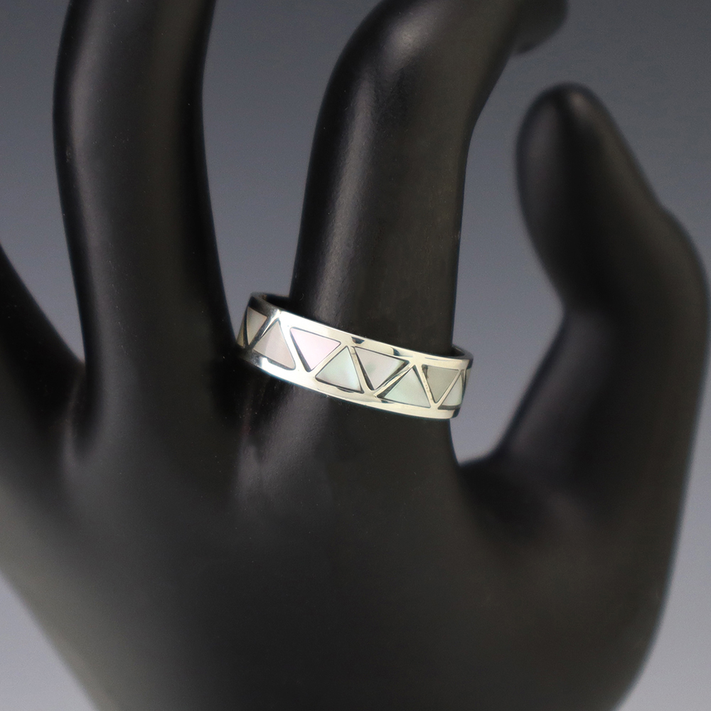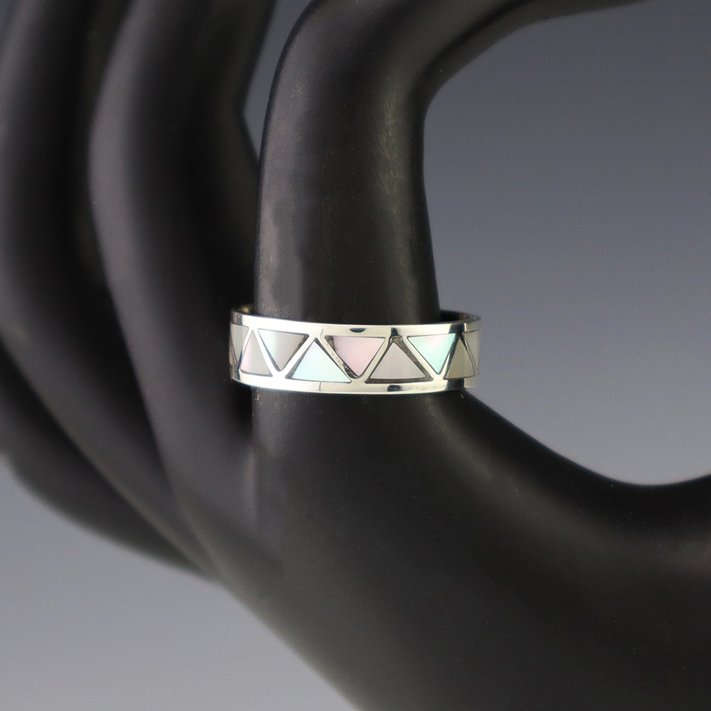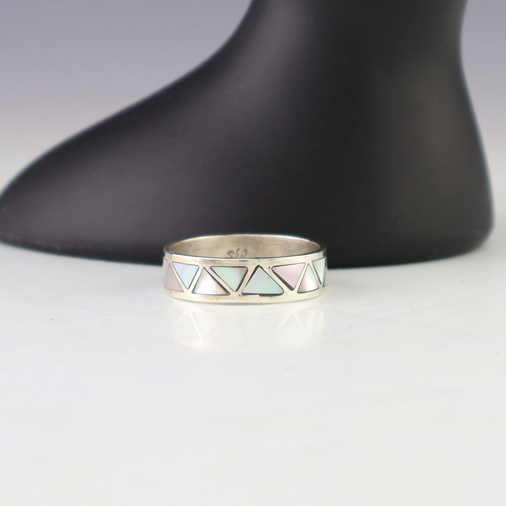 Zuni artists are known for their fine lapidary skills. Each stone is hand cut, polished, and set into a sterling silver setting. The ring is set with Green Snail Shell Hand made by Zuni artist Charlene Sice. Weighs 4 grams. Size 10. Signed