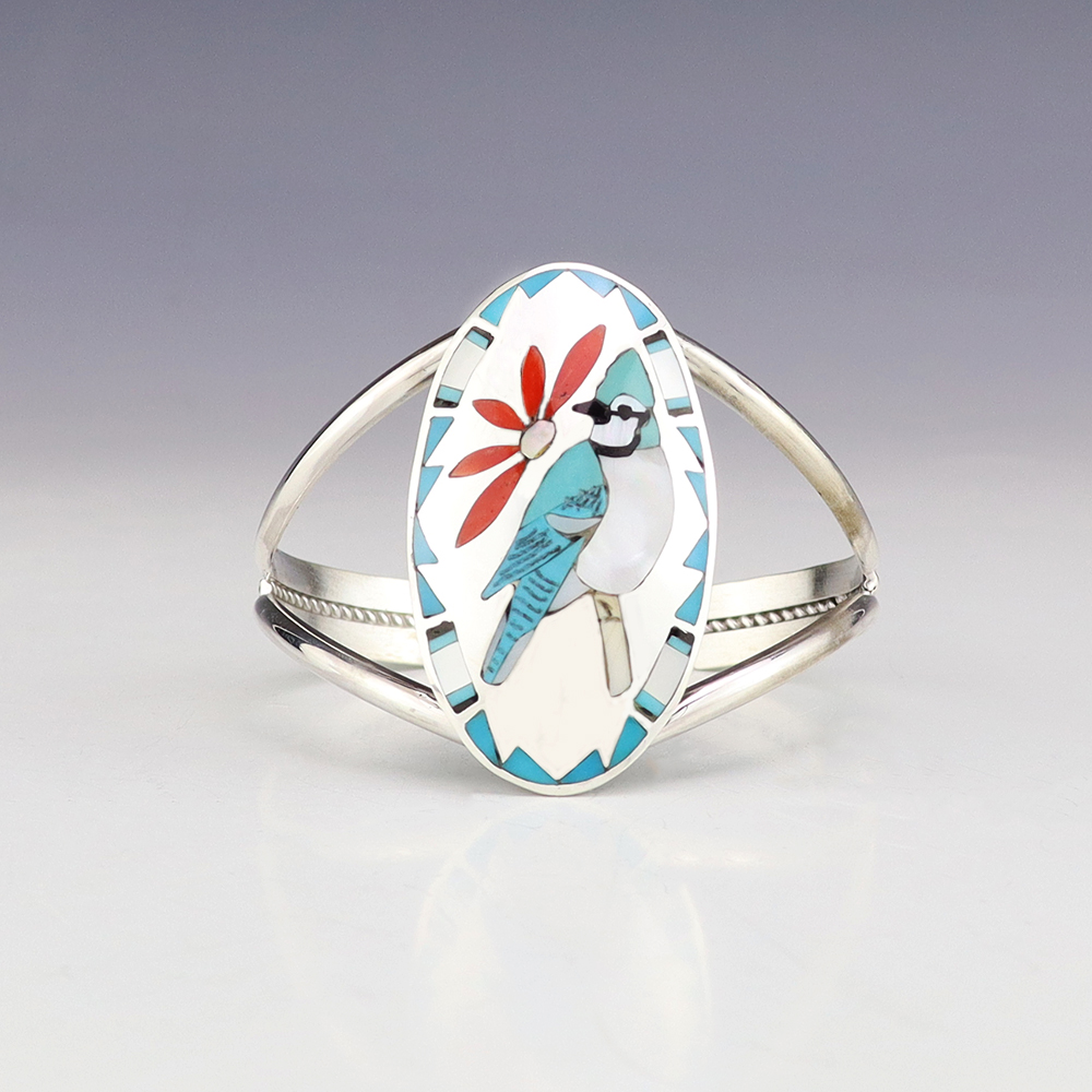 NATIVE AMERICAN ZUNI STERLING SILVER & INLAY BRACELET BY GLENDIS TSADIASI