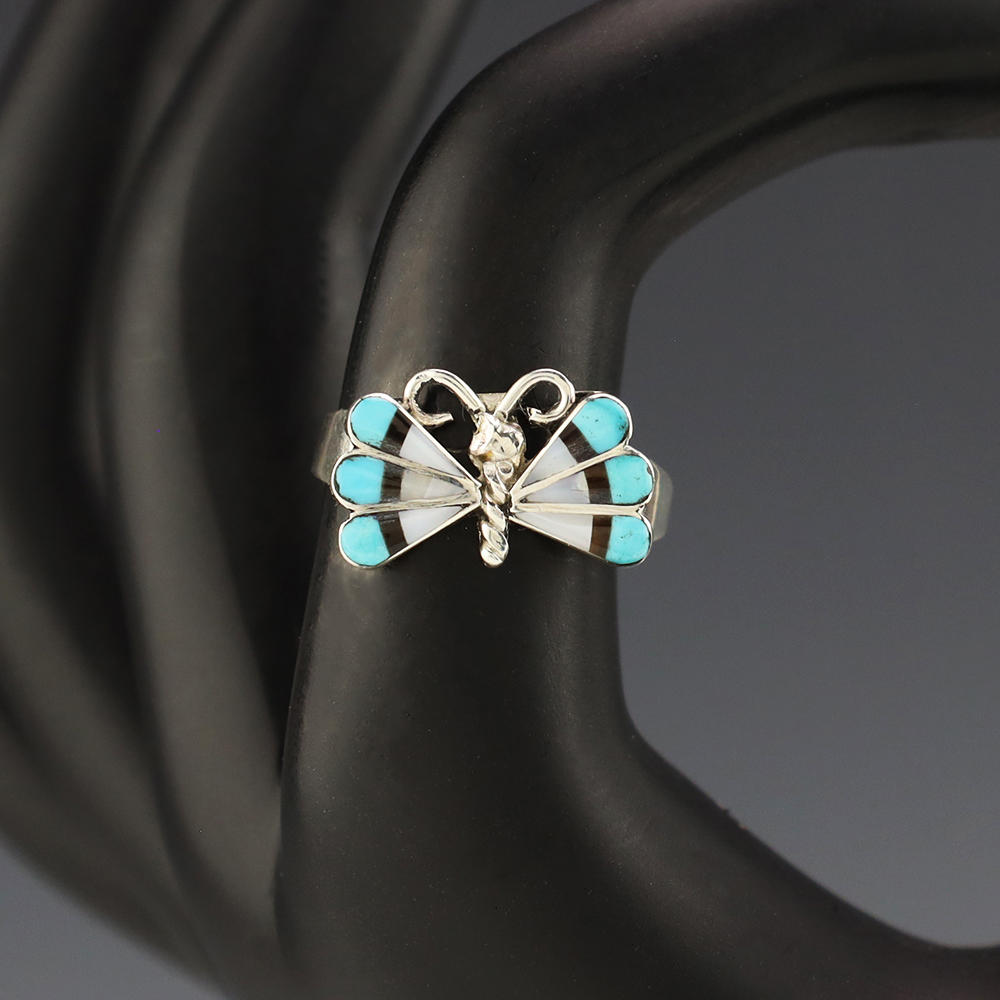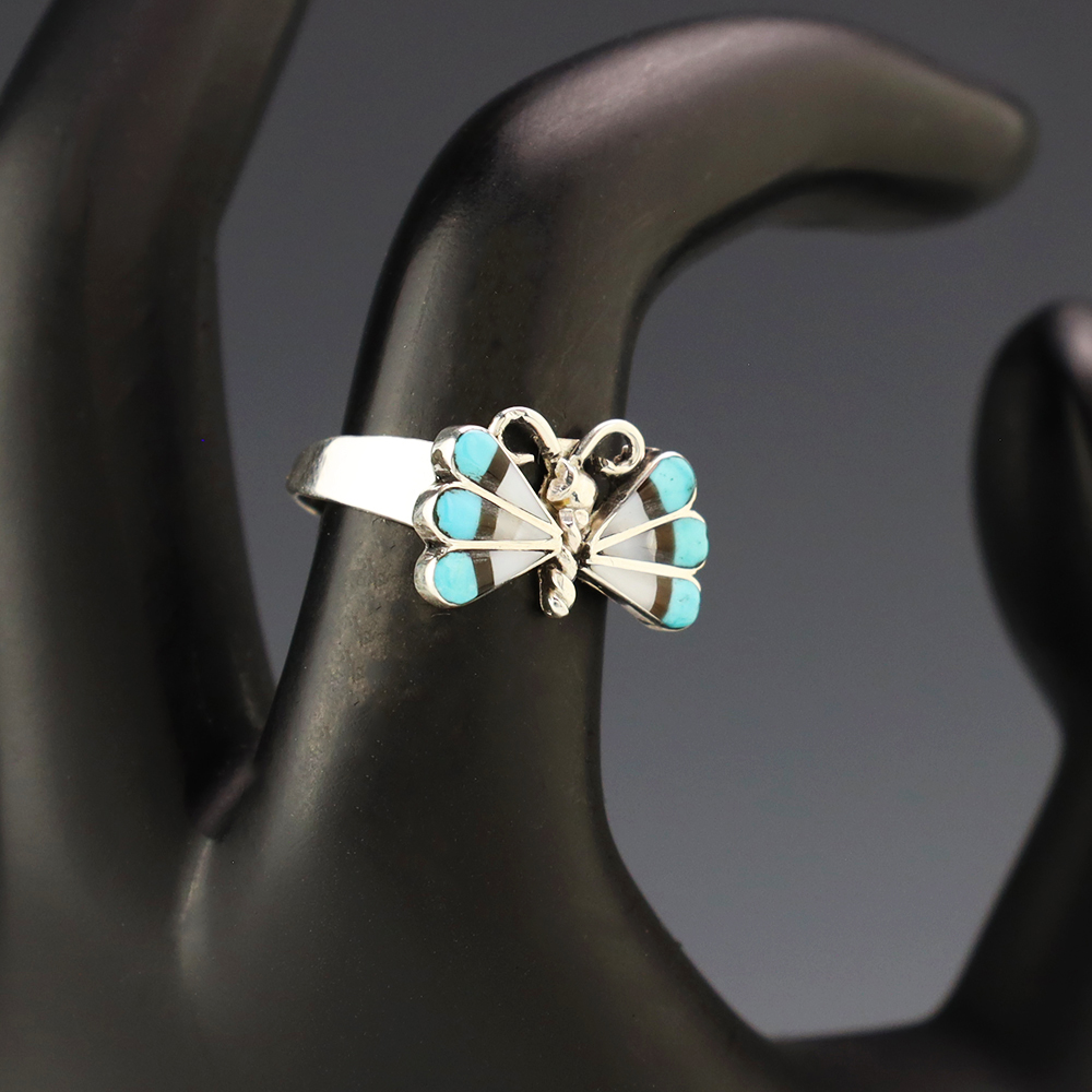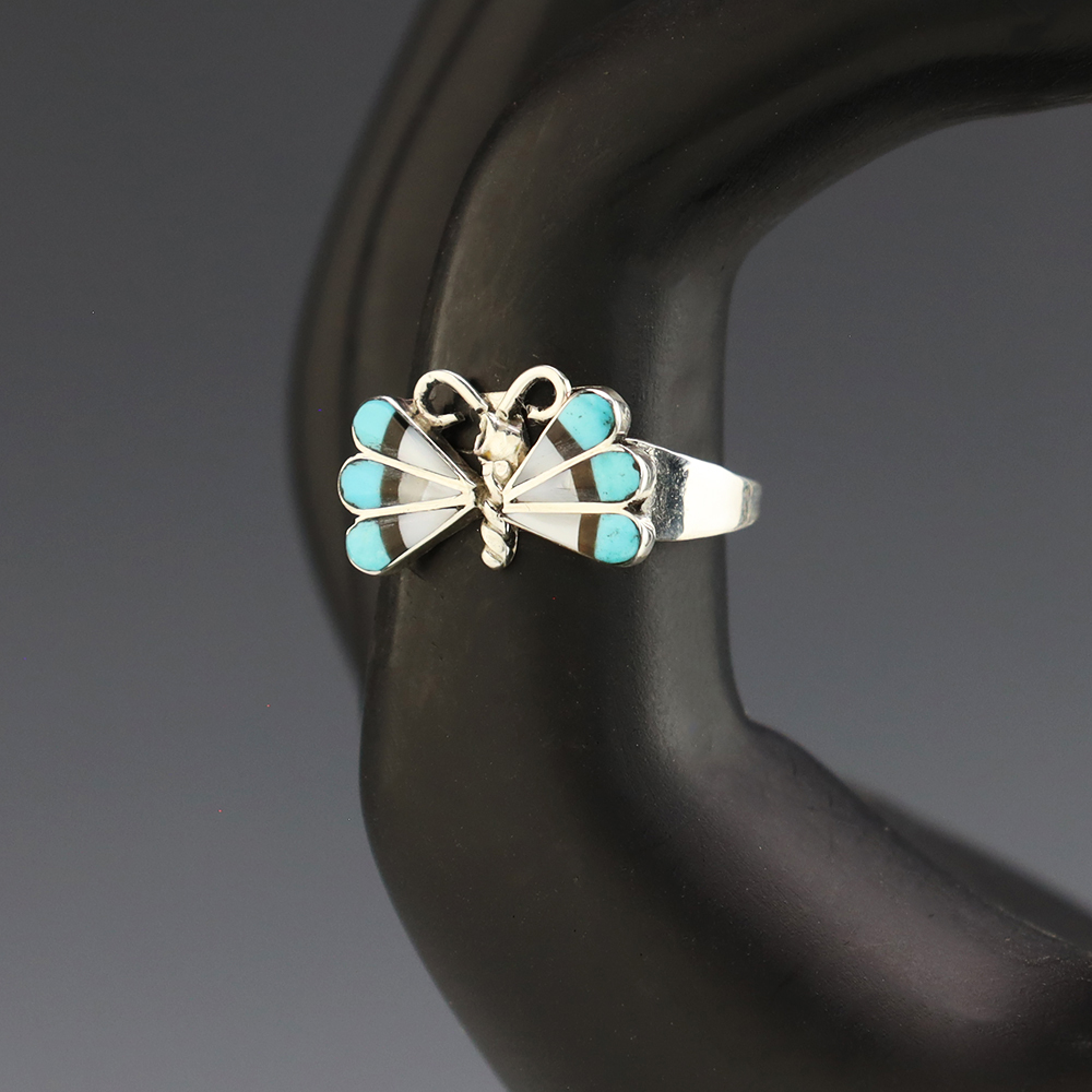 Zuni artists are known for their fine lapidary skills. Each stone is hand cut, polished, and set into a sterling silver setting. The ring is inlaid with Mother of Pearl Shell, Jet, and Turquoise stones. Weighs 2 grams. Size 7 1/4.
