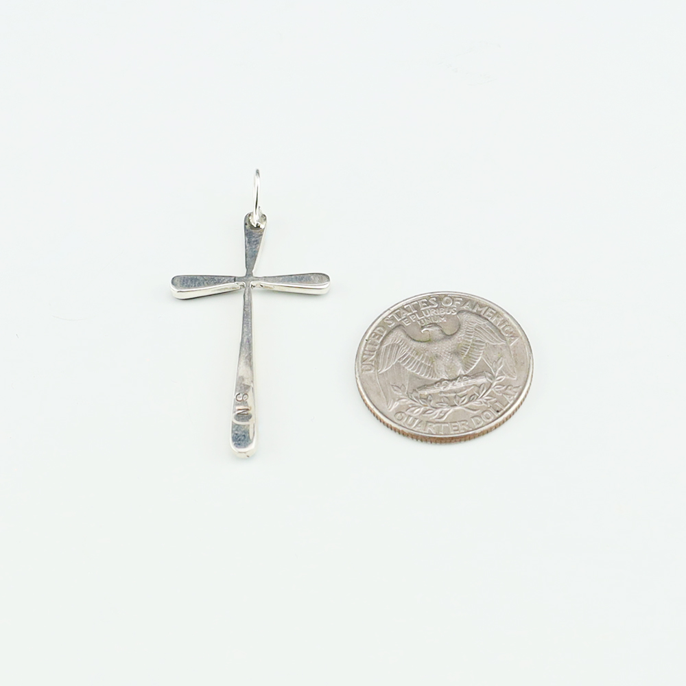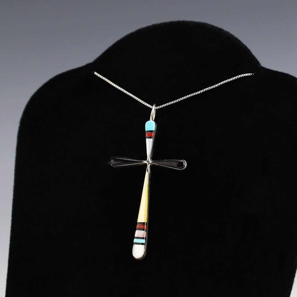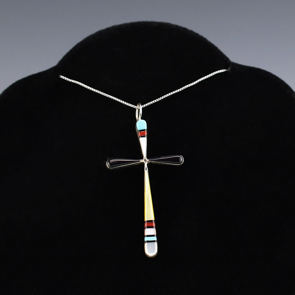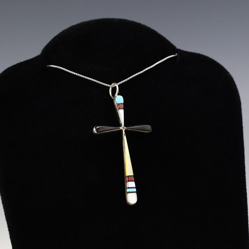 Zuni artists are known for their fine lapidary skills. This cross pendant is no exception. Zuni artist Sylvester Noche made this pendant out of sterling silver and inlaid it with Turquoise, Mother of Pearl Shell, Jet, and Coral. Weighs 2 grams. (Chain not included) Signed.