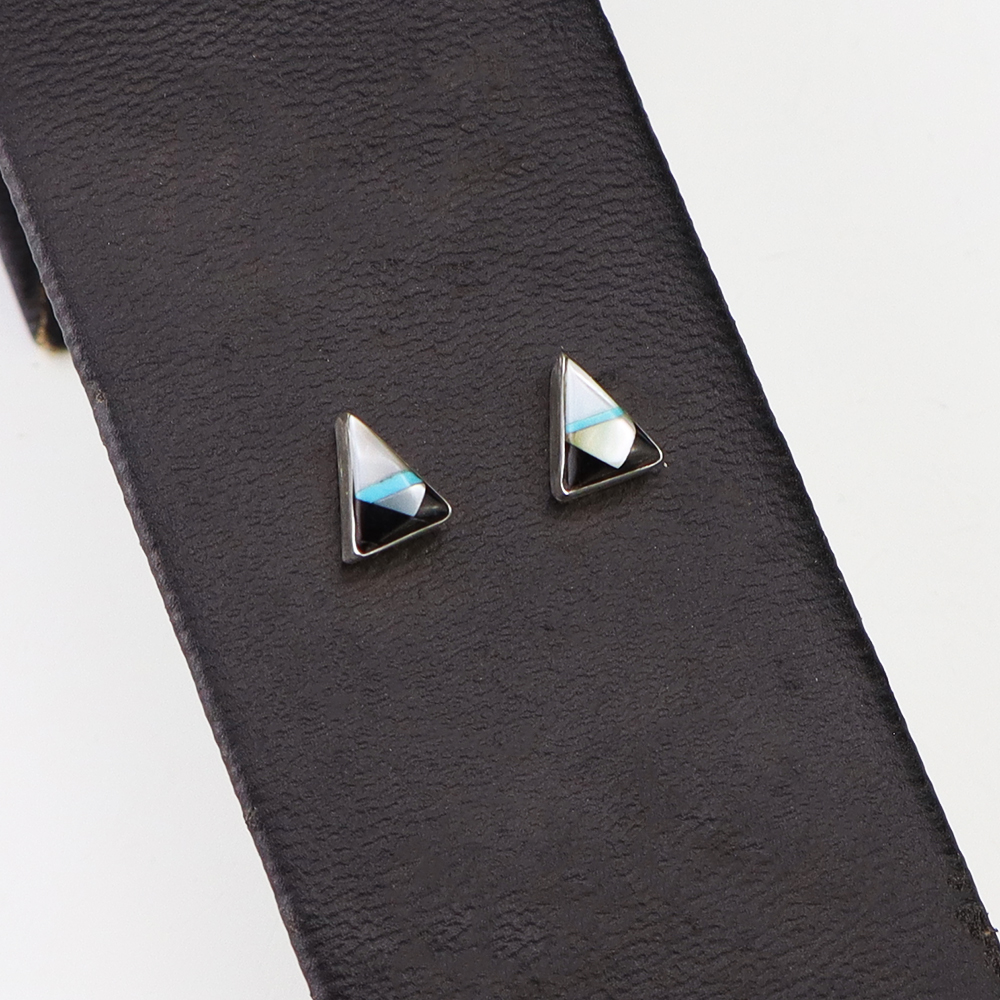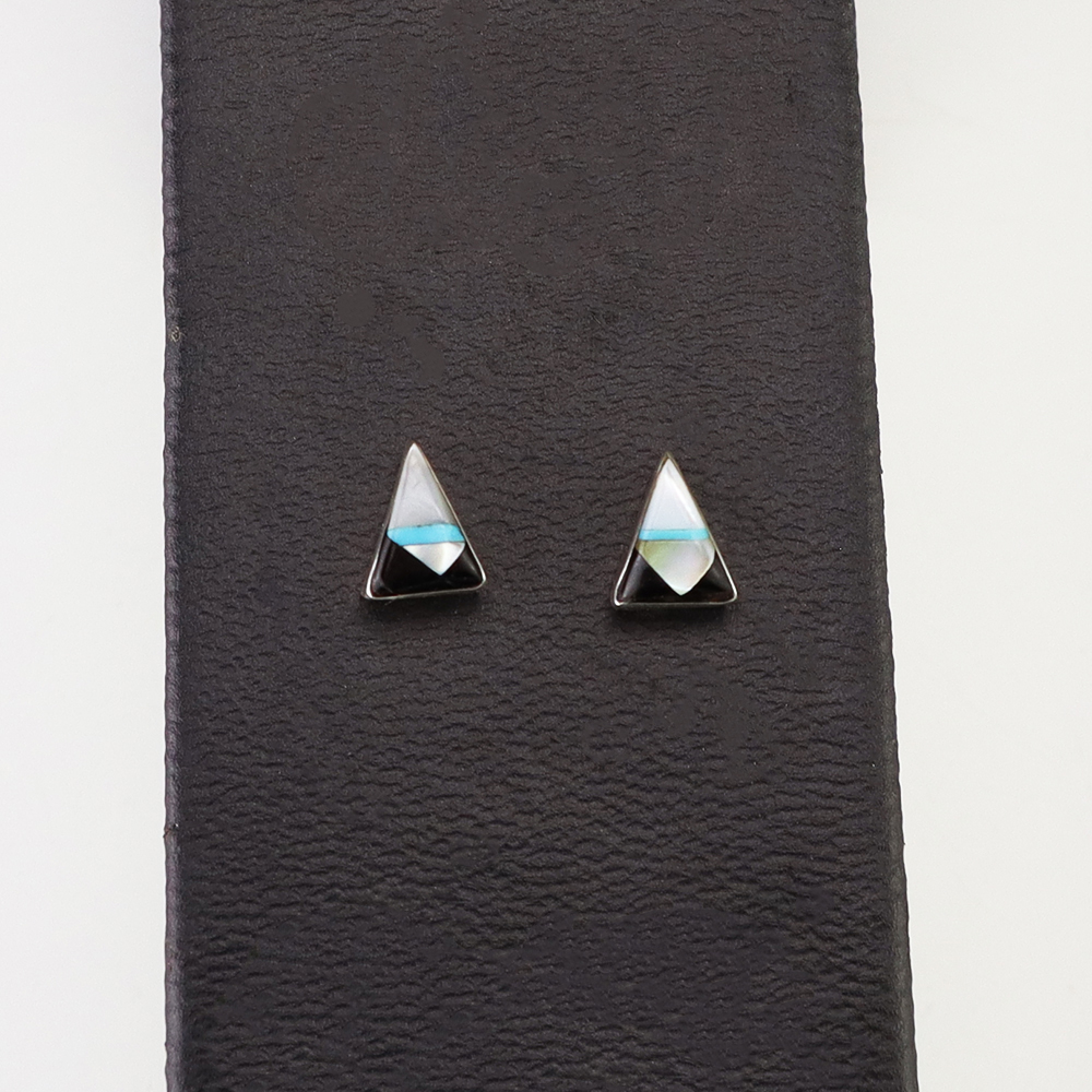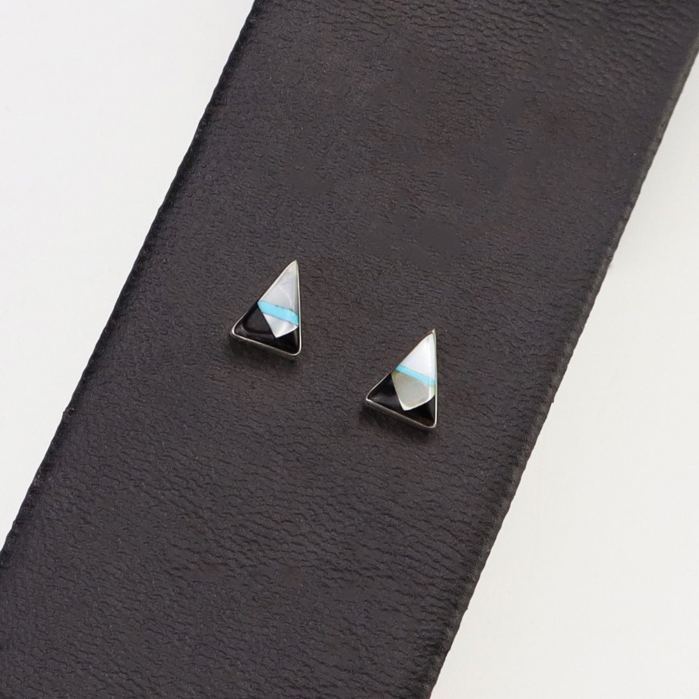 Each earring features Turquoise, Jet, and Mother of Pearl Shell set into a sterling silver setting. Hand made by Zuni artist Francine Chapito. These gorgeous earrings will become a versatile accessory in your jewelry collection.