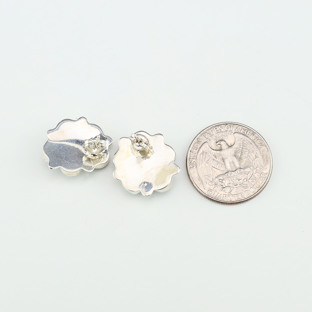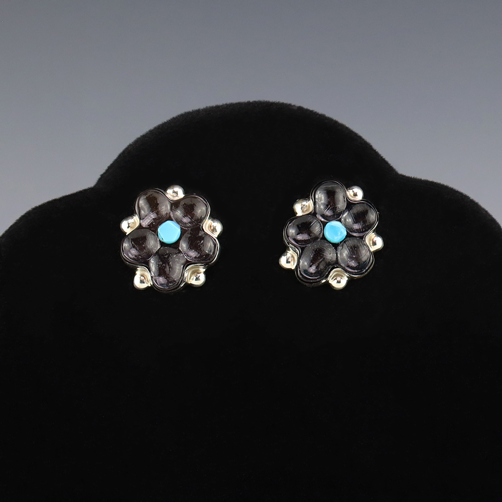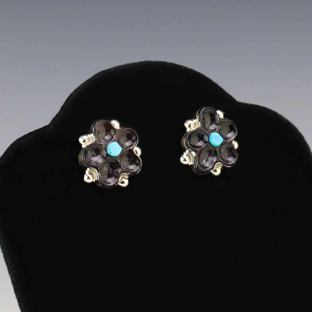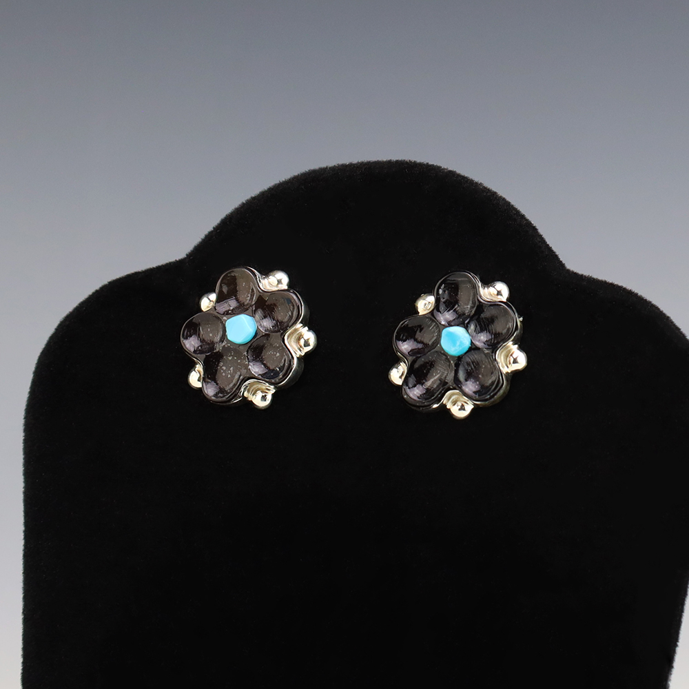 Zuni jeweler Tamara Pinto made these fabulous flower earrings. Zuni artists are known for their fine lapidary skills. Each stone is hand cut, polished, and set into a sterling silver setting. The earrings are inlaid with Turquoise and Jet. Weighs 4 grams.