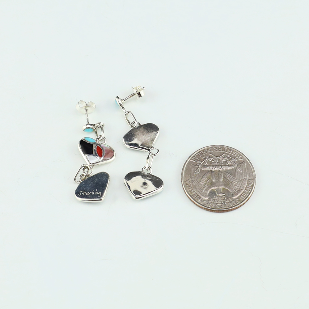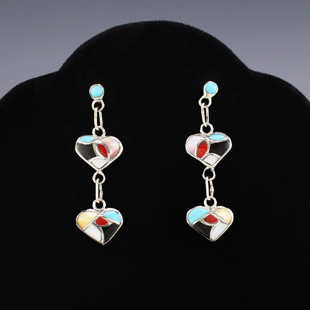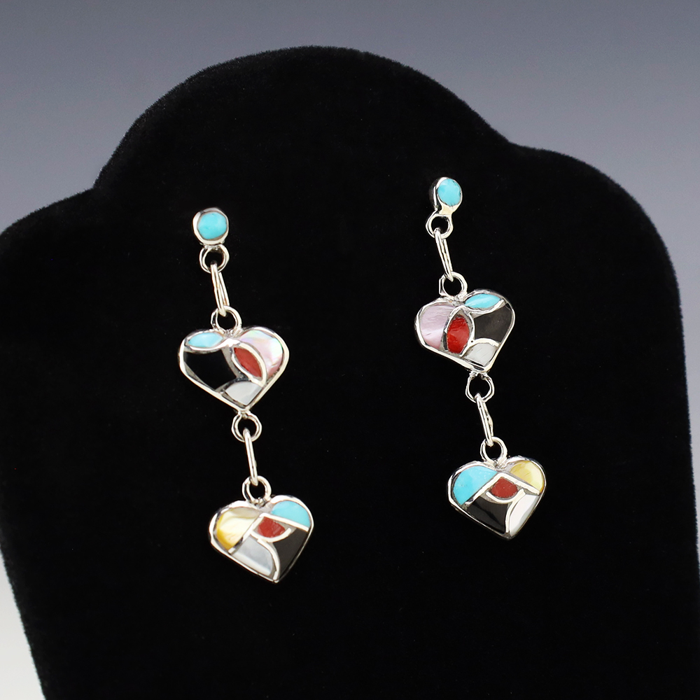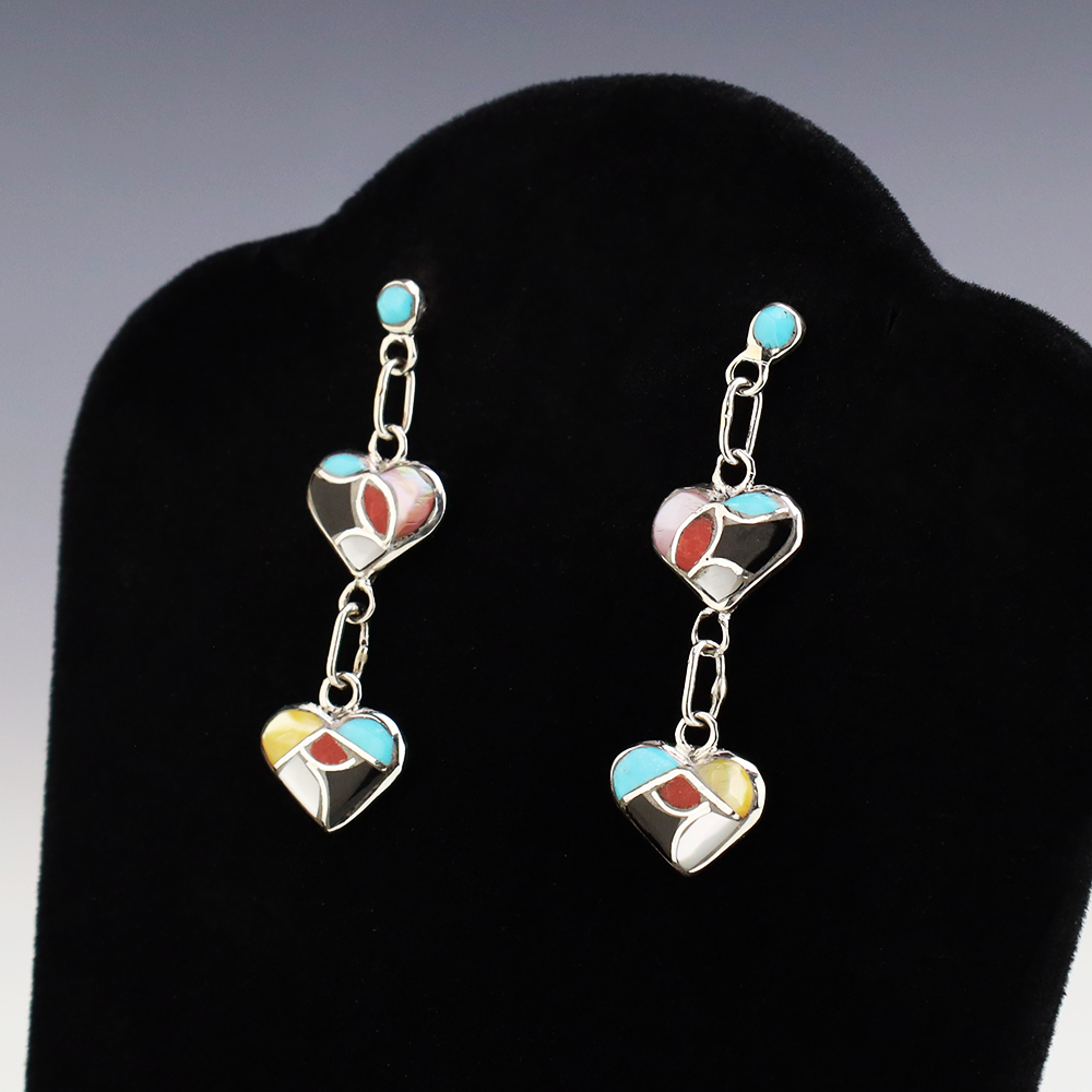 Zuni artist Orena Leekya hand made these lovely heart earrings. Made out of sterling silver and inlaid with Turquoise, Jet, Coral, Mother of Pearl Shell, and Pink Mussel. Weighs 4 grams. Signed