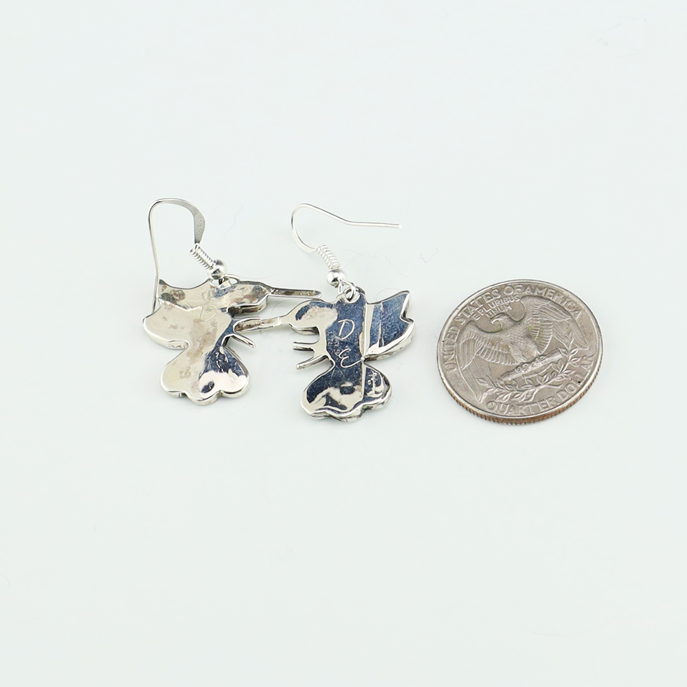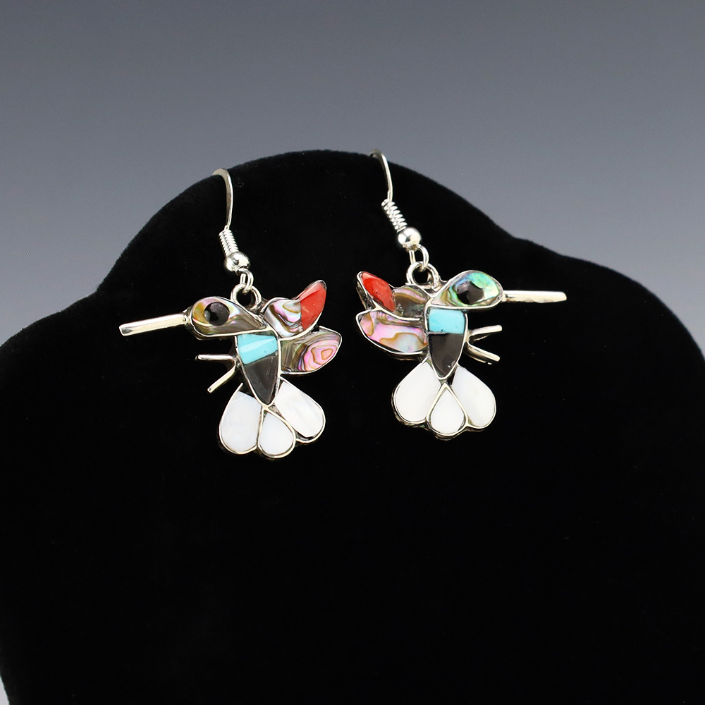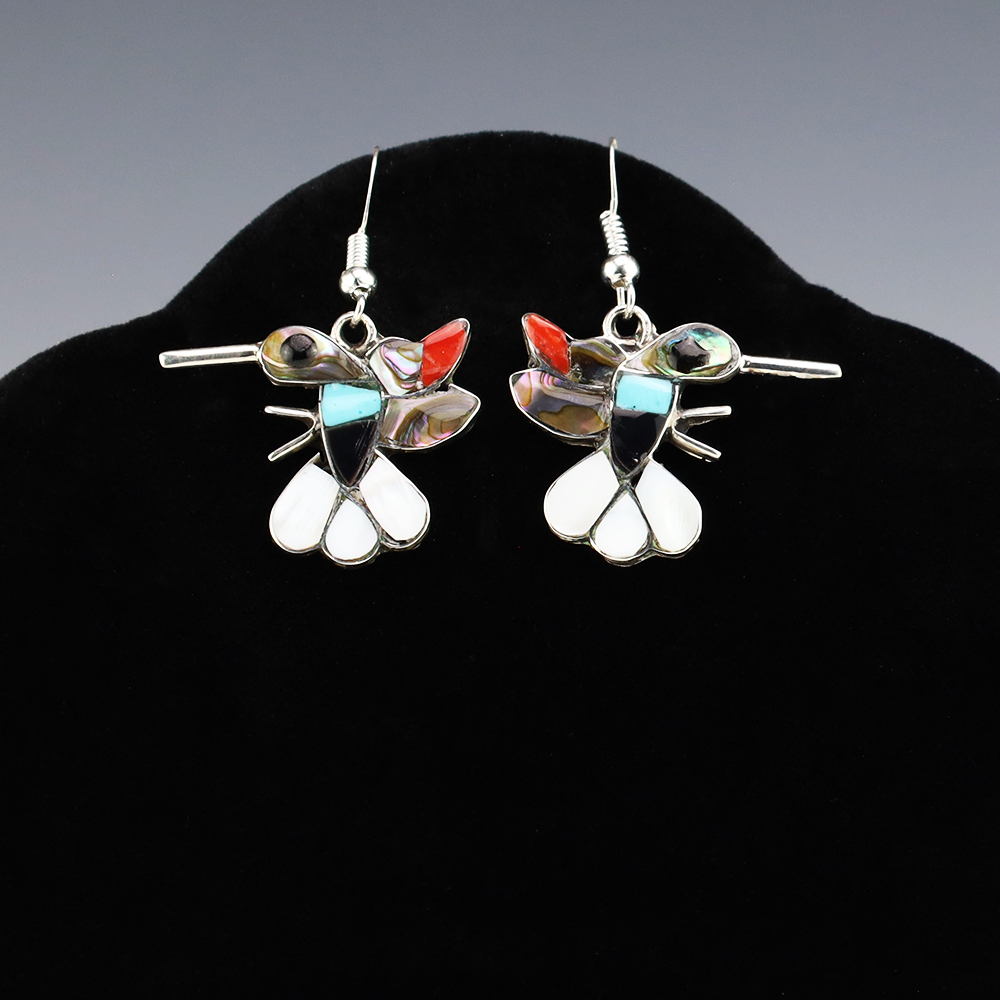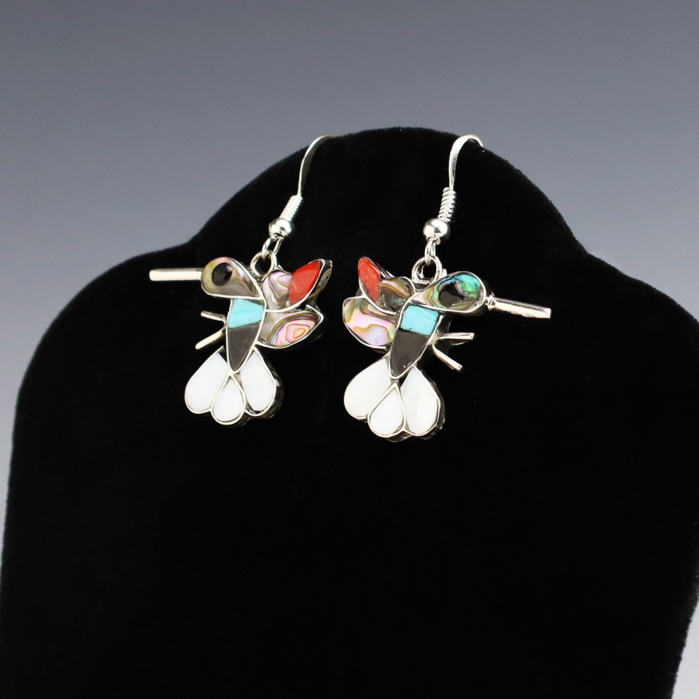 Zuni artist Deanna Edaakie made these lovely hummingbird earrings. Zuni artists are known for their fine lapidary skills. Each stone is hand cut, polished, and set into a sterling silver setting. The earrings are inlaid with Turquoise, Coral, Jet, Abalone,and Mother of Pearl Shell. Weighs 6 grams. Signed