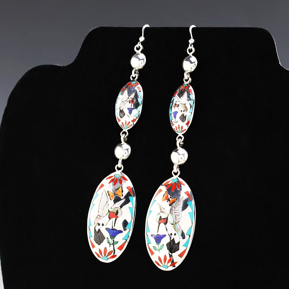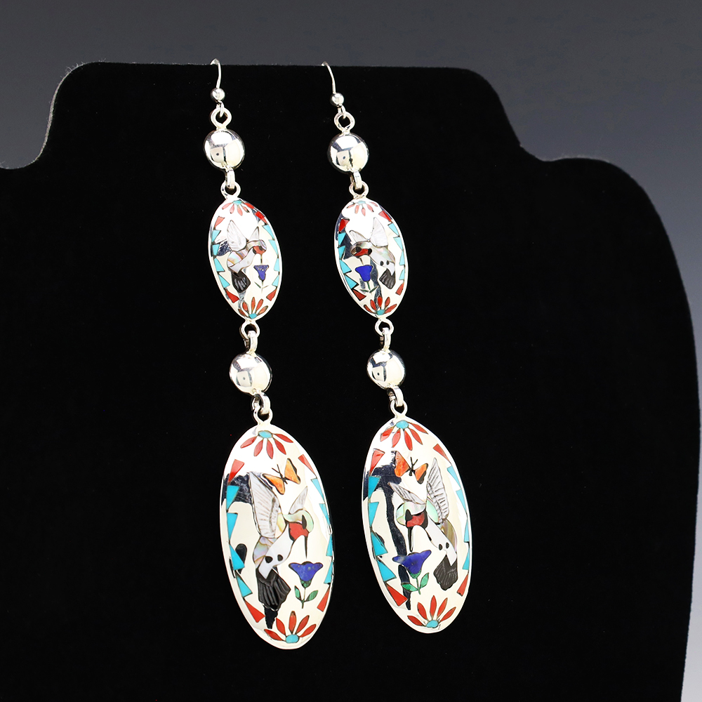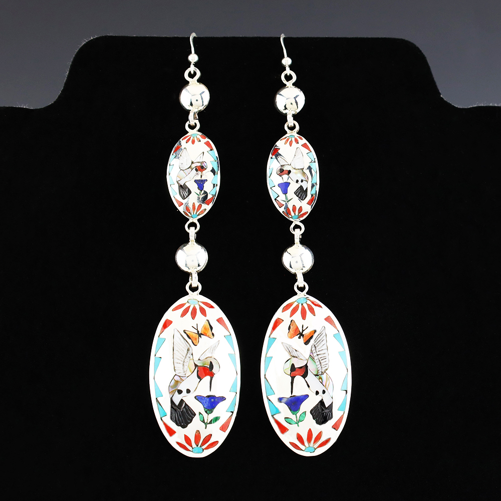 Zuni jeweler Quintin Quam made these gorgeous hummingbird earrings. Zuni artists are known for their fine lapidary skills. Each stone is hand cut, polished, and set into a sterling silver setting. The earrings are inlaid with Coral, Mother of Pearl Shell, Penn Shell, Turquoise, Abalone, Spiny Oyster, Malachite, Lapis, and Jet. Quintin domed these earrings, giving them a great shape. Weighs 28 grams. Signed