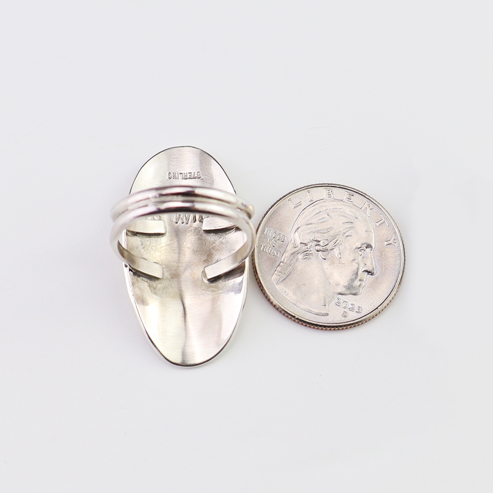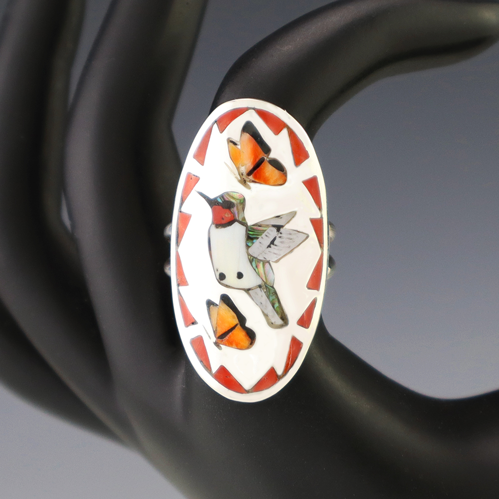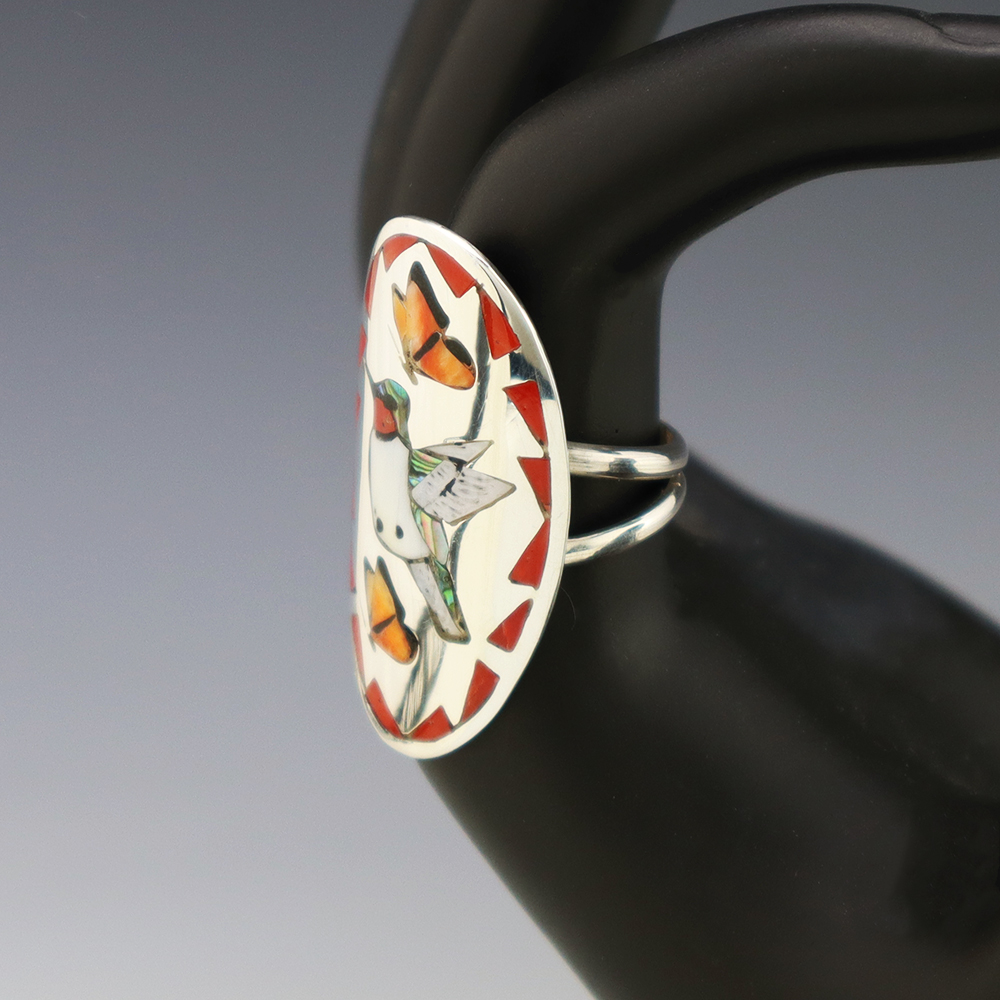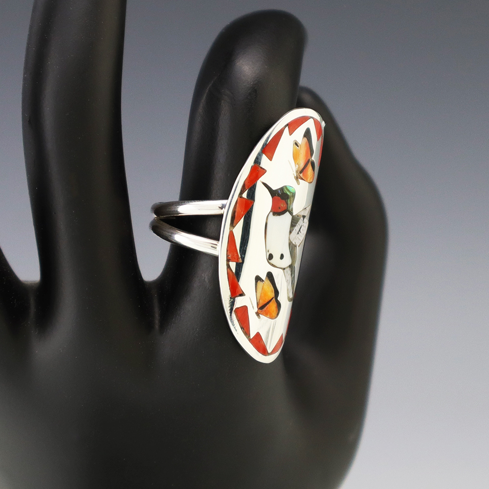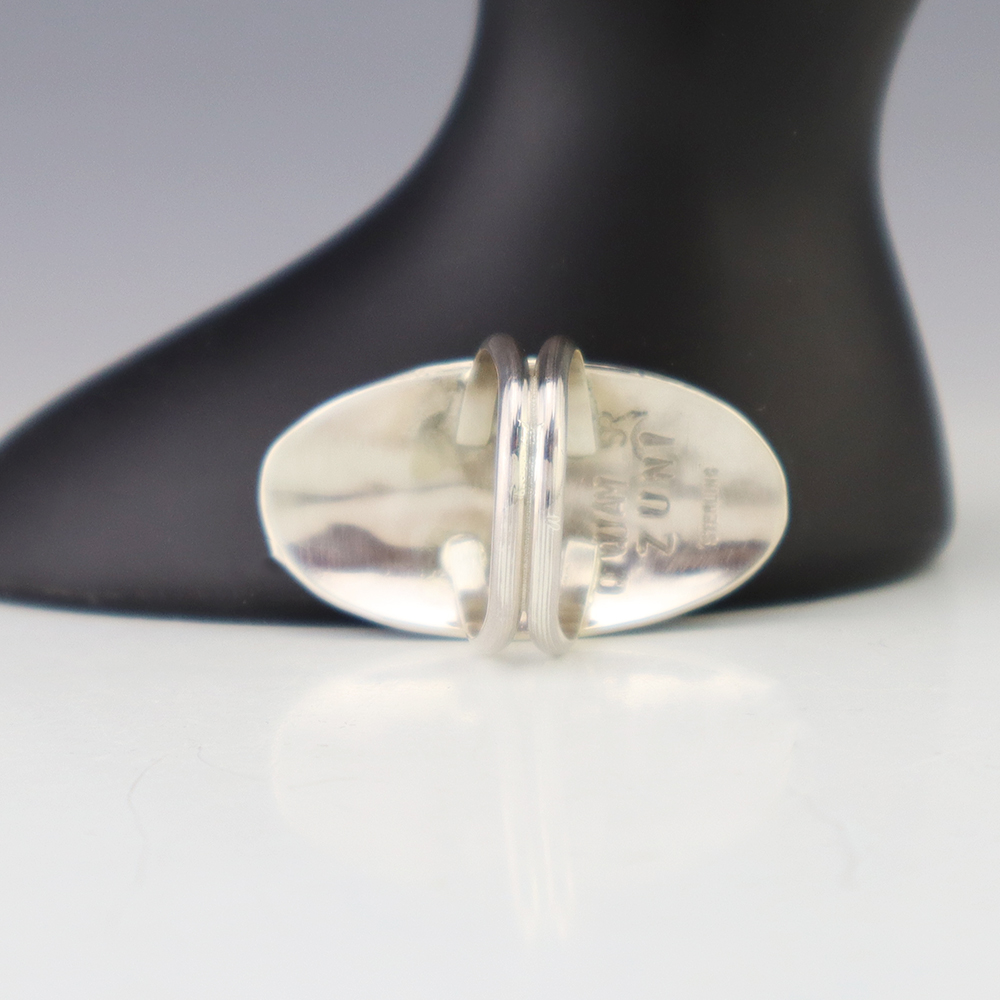 Amazing inlay work! Zuni jewelry makers, Nancy and Sheldon Westika created this magnificent ring. Made out of sterling silver and inlaid with Kingman Turquoise and Jet. Zuni artists are known for their lapidary work. The Westikas have been making jewelry since the 1970’s and they are known for their fine...