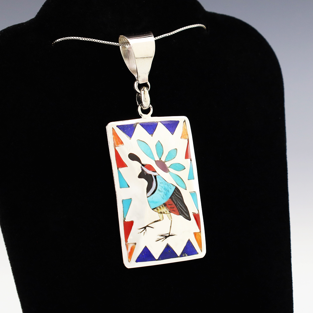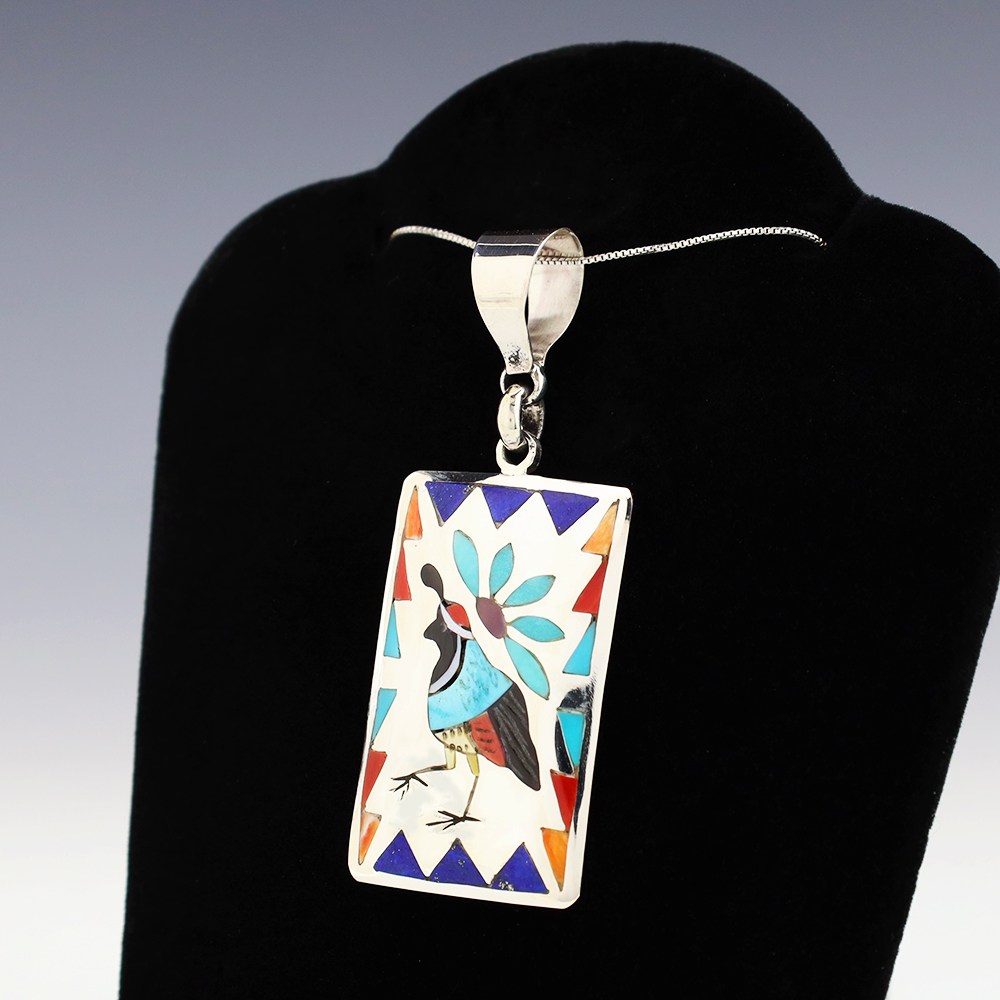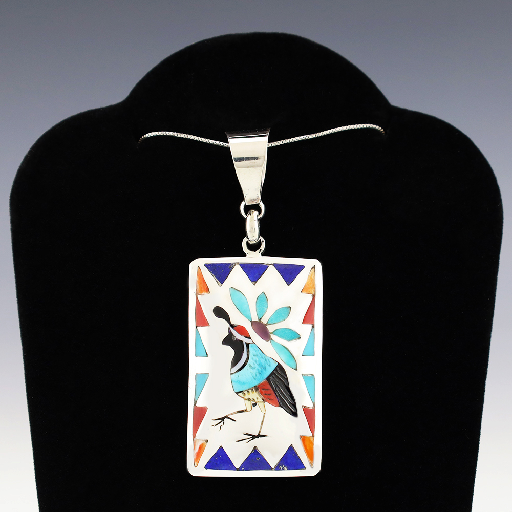 Zuni jeweler Quintin Quam hand made this wonderful pendant depicting a Quail The sterling silver pendant is intricately inlaid with Turquoise, Spiny Oyster, Sugilite, Jet, Lapis, Coral, and Mother of Pearl Shell. Amazing detail! Weighs 16 grams. (Chain not included) Signed