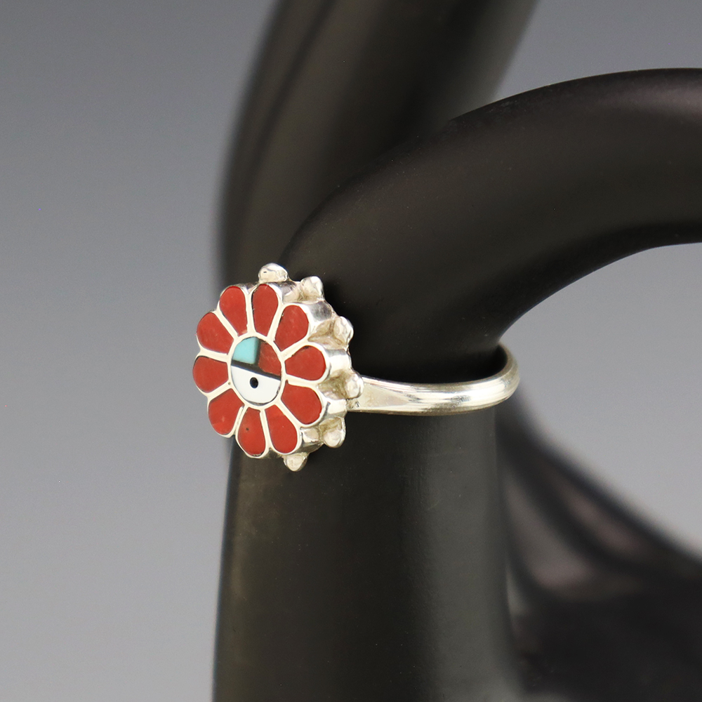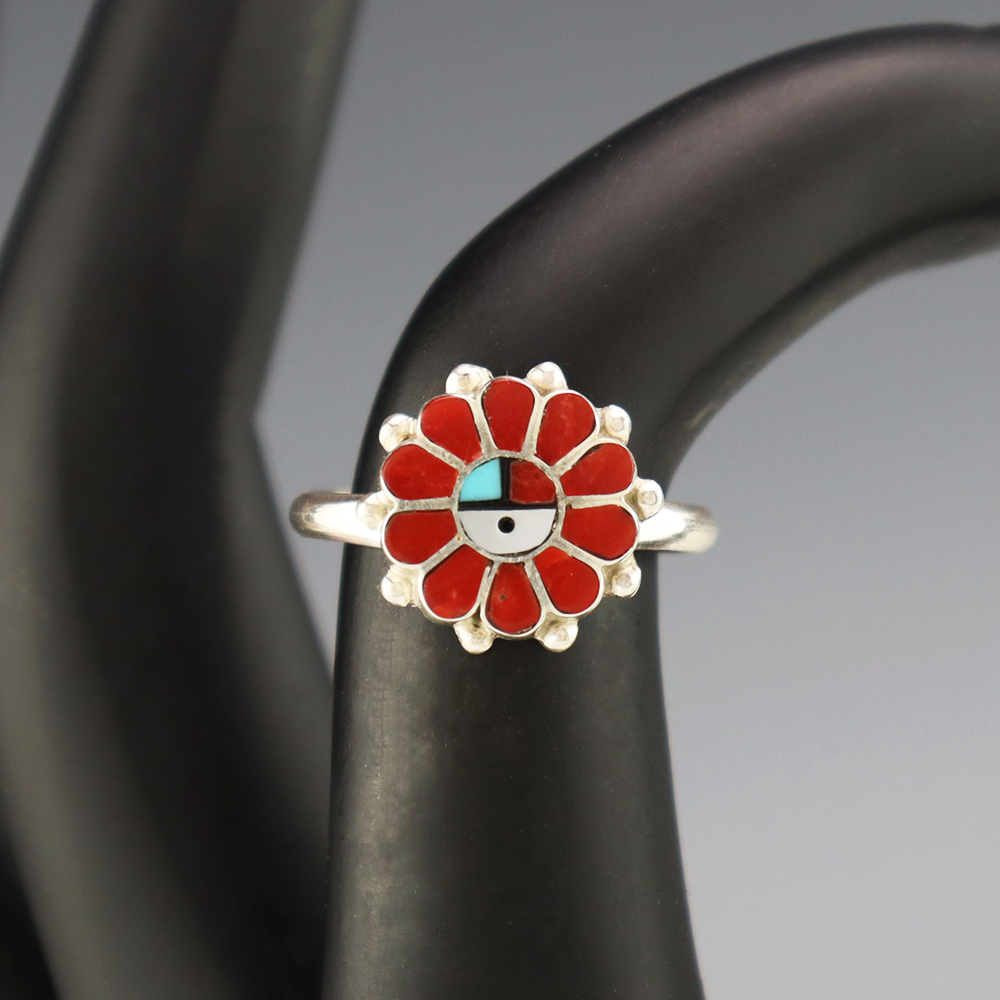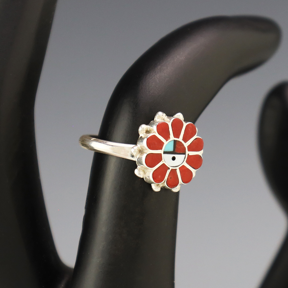 Zuni artists are known for their fine lapidary skills. Each stone is hand cut, polished, and set into a sterling silver setting. The ring is inlaid with Turquoise, Mother of Pearl Shell, Jet, and Coral stones. Weighs 2 grams. Size 5 3/4.