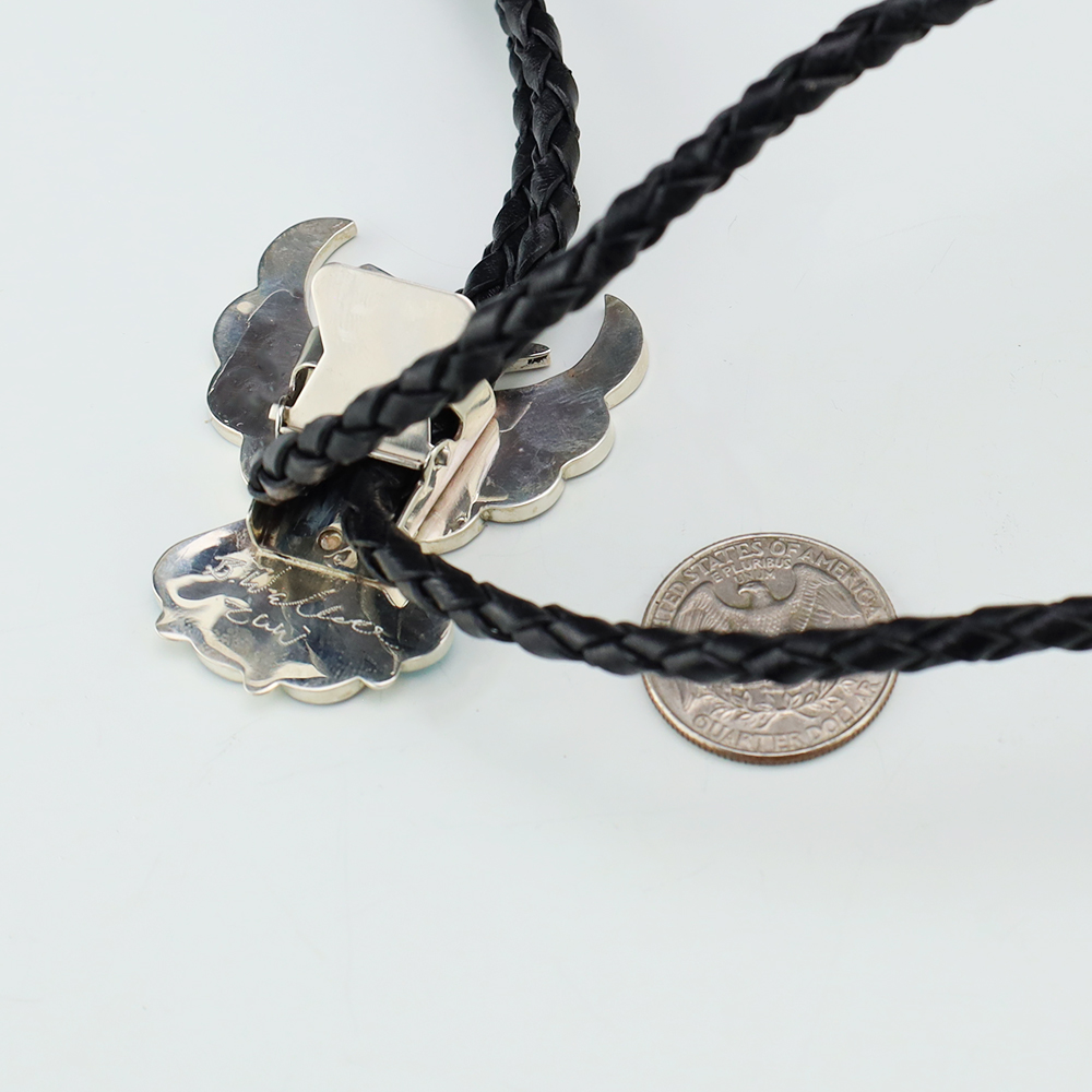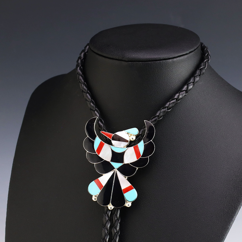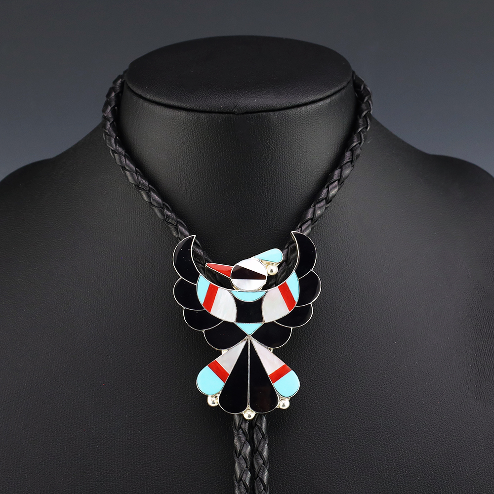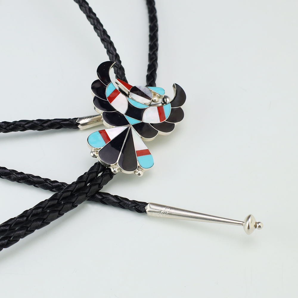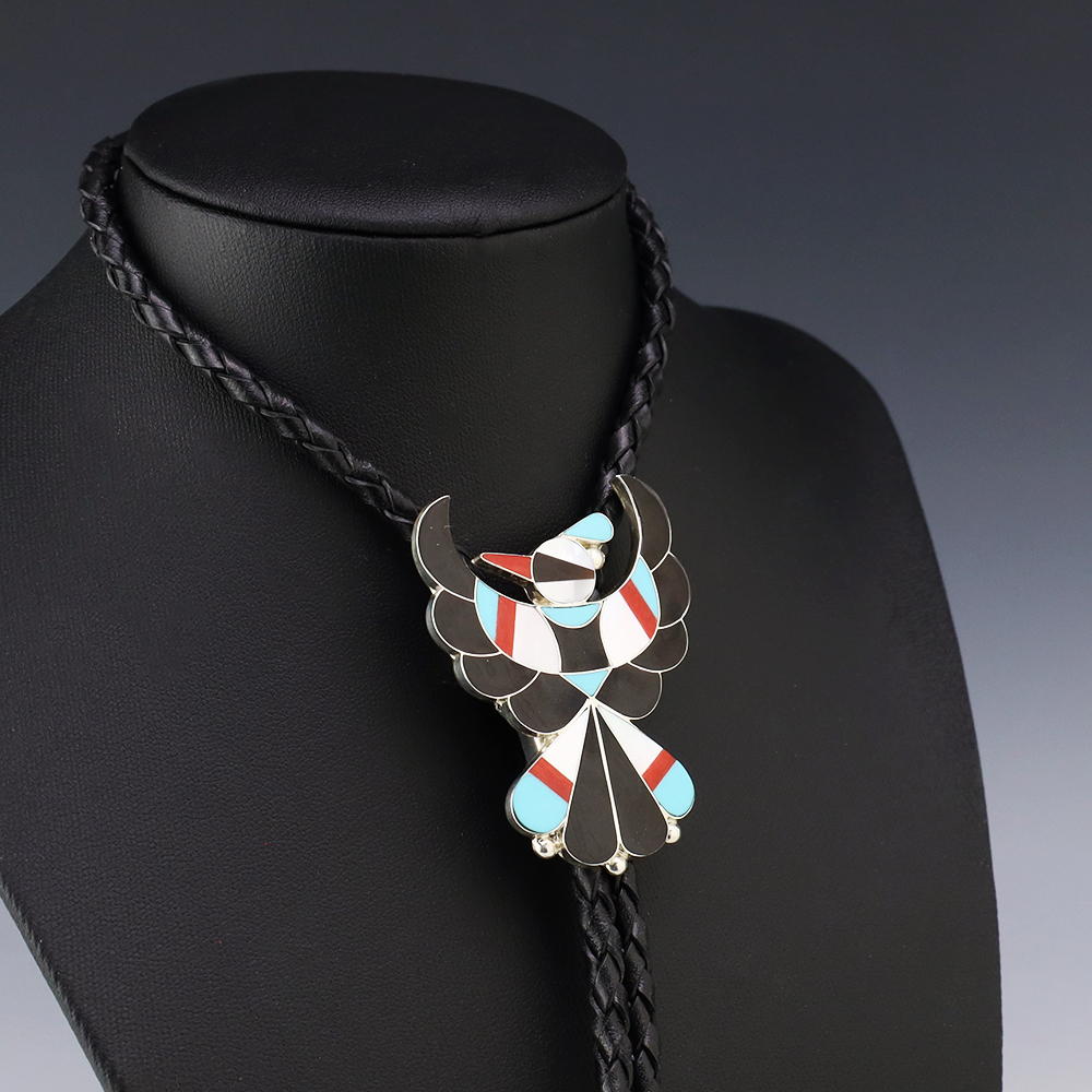 Zuni artist Breon Wallace made this outstanding Thunderbird bolo tie. Sterling silver with Turquoise, Jet, Coral, and Mother of Pearl Shell inlay. This handsome bolo tie will look great on any shirt. Weighs 28 grams. Signed