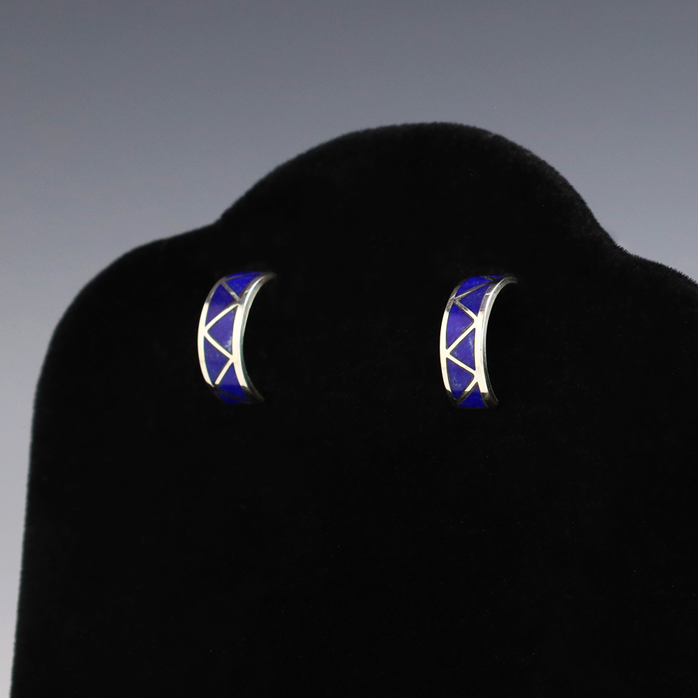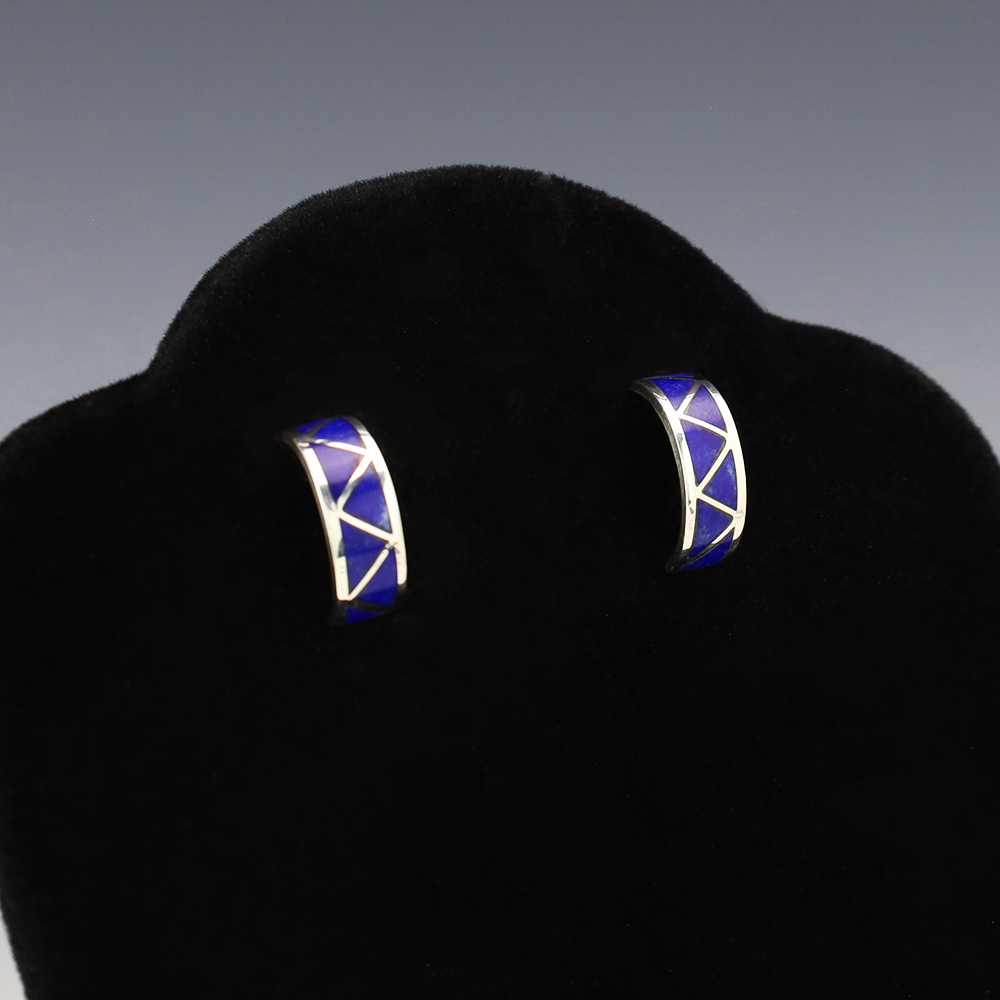 Made in the highly regarded inlay style, each earring features Lapis stones inlaid into a sterling silver setting. Hand made by Charlene Sice. Weighs 2 grams. These delightful earrings will become a versatile accessory in your jewelry collection.