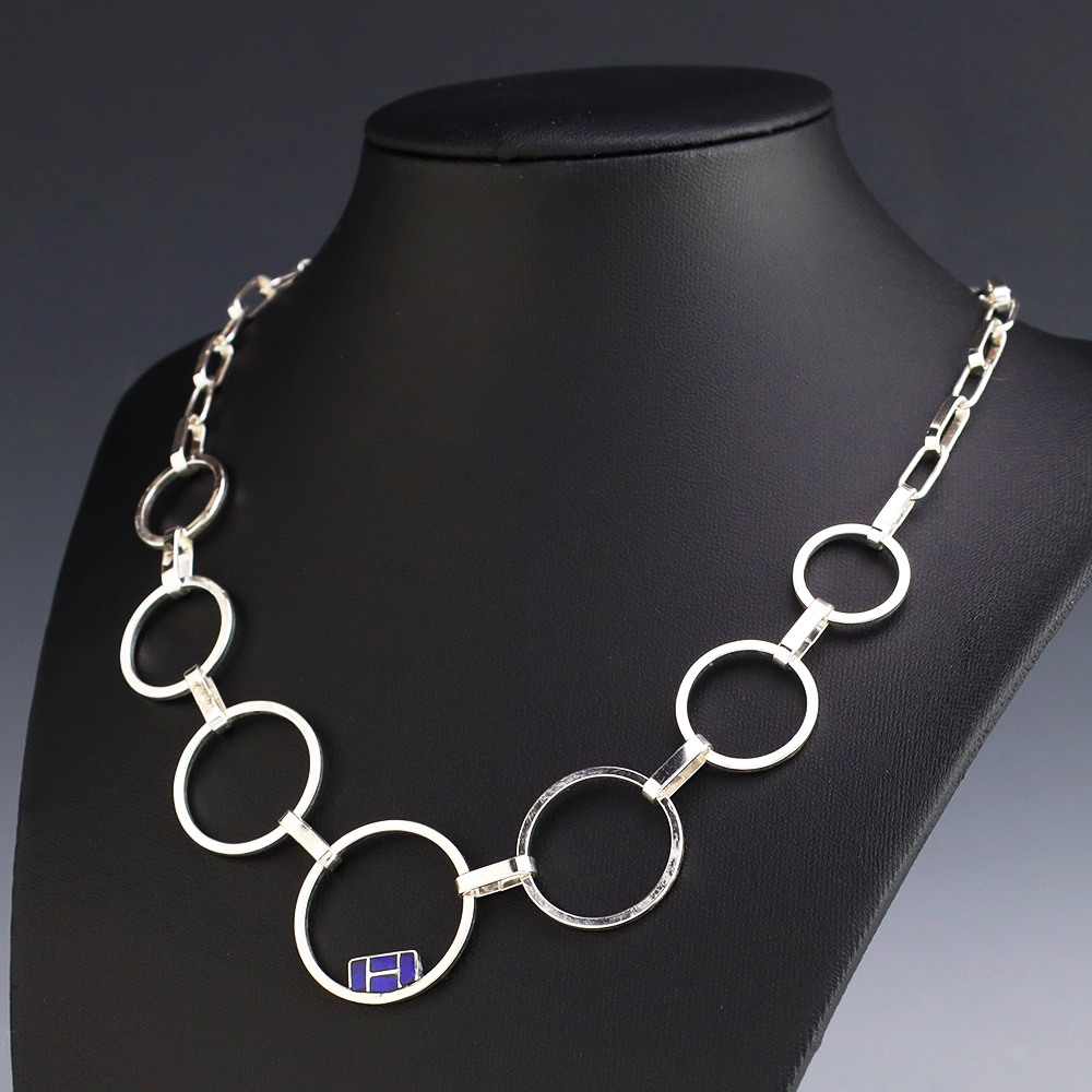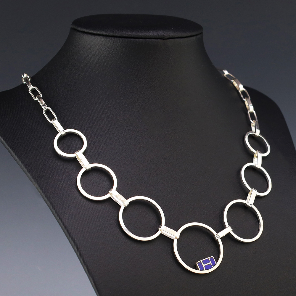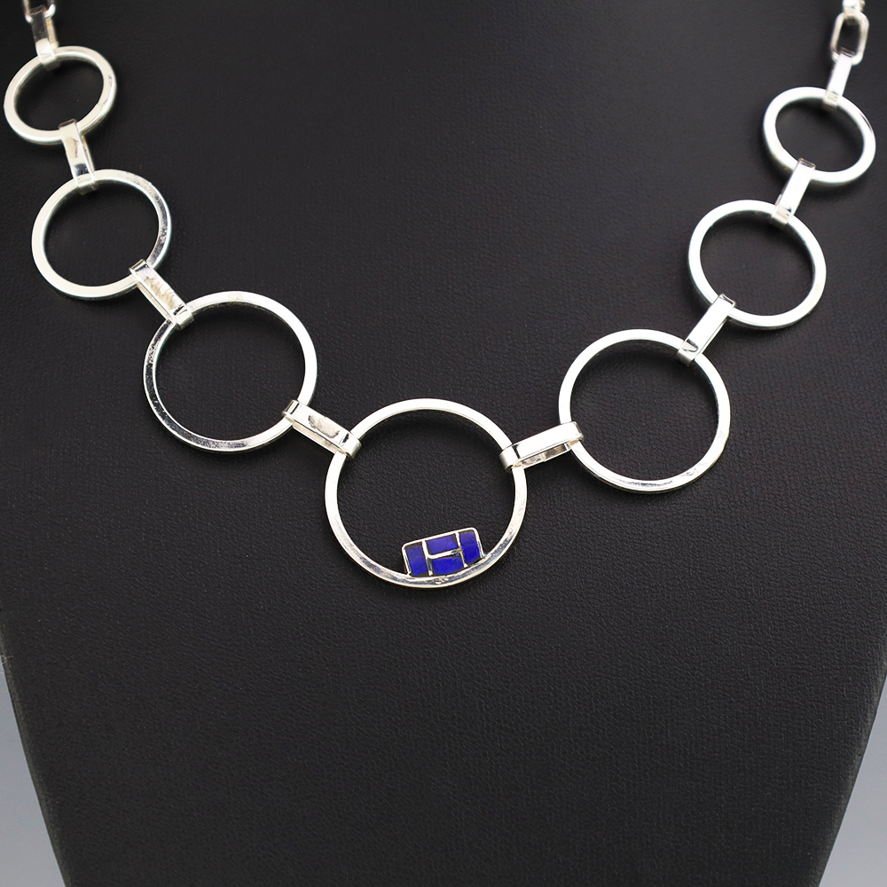 Zuni artists Nancy and Sheldon Westika made this gorgeous necklace. Sterling silver with Lapis inlay. The Westikas are know for their great channel inlay work. An exquisite statement piece that you will enjoy for many years. Weighs 20 grams. Signed