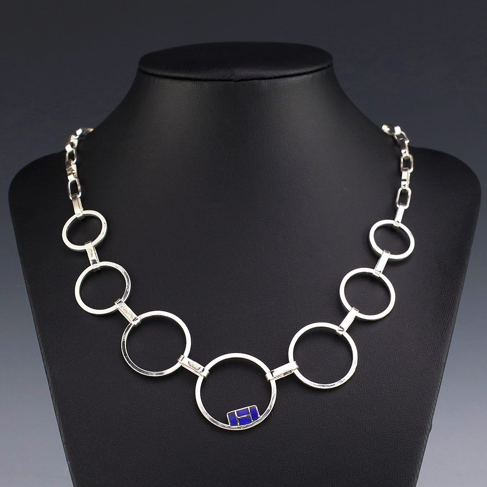 Zuni artists Nancy and Sheldon Westika made this gorgeous necklace. Sterling silver with Lapis inlay. The Westikas are know for their great channel inlay work. An exquisite statement piece that you will enjoy for many years. Weighs 20 grams. Signed