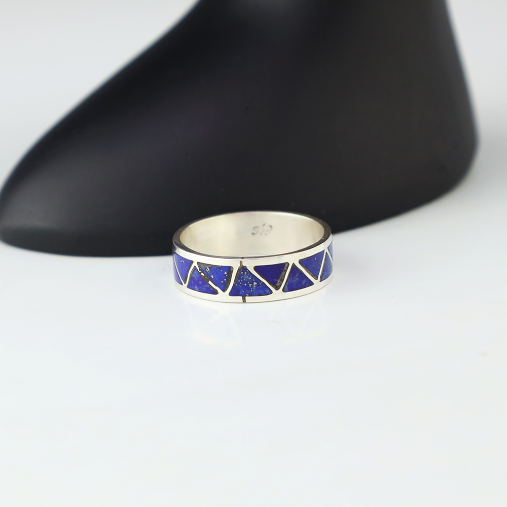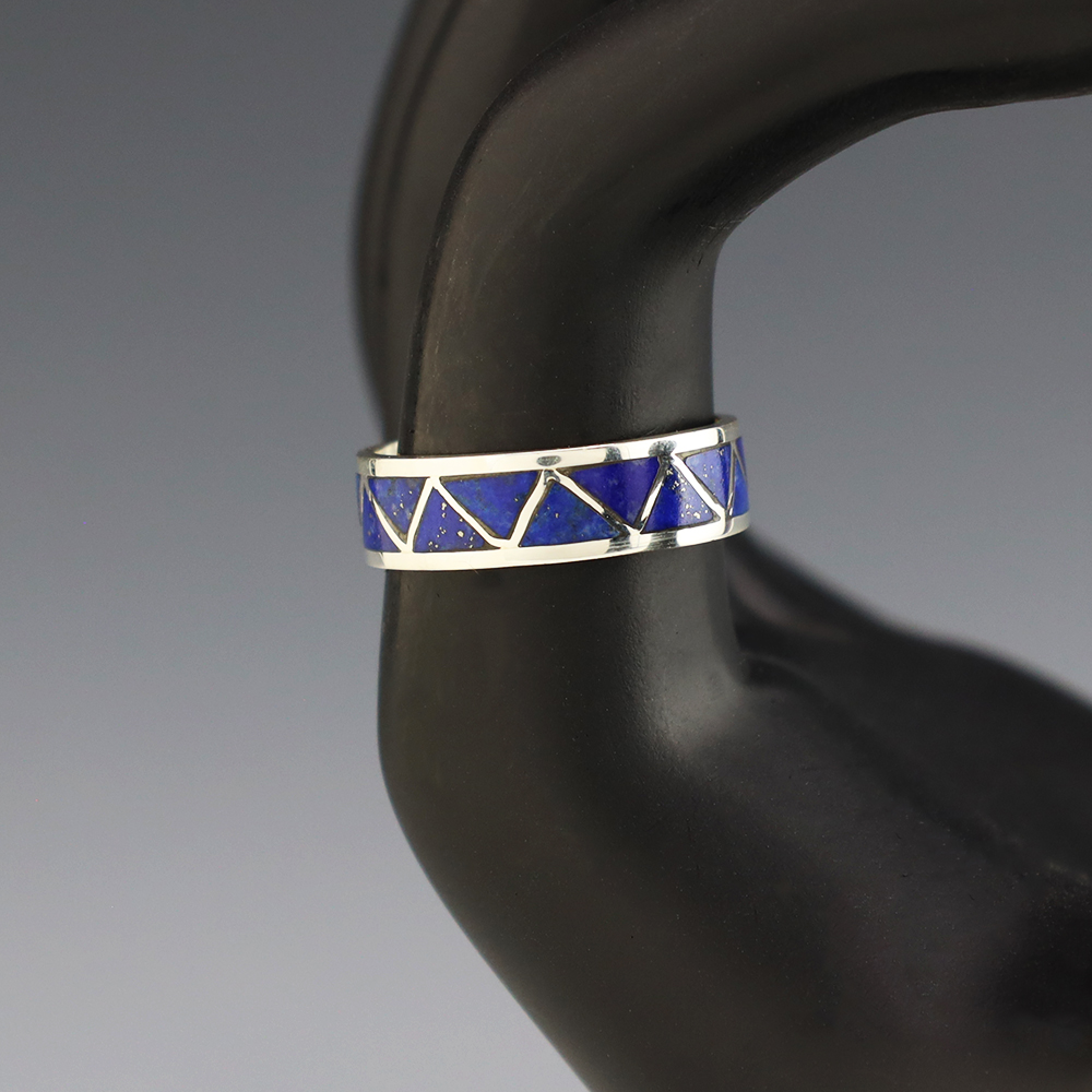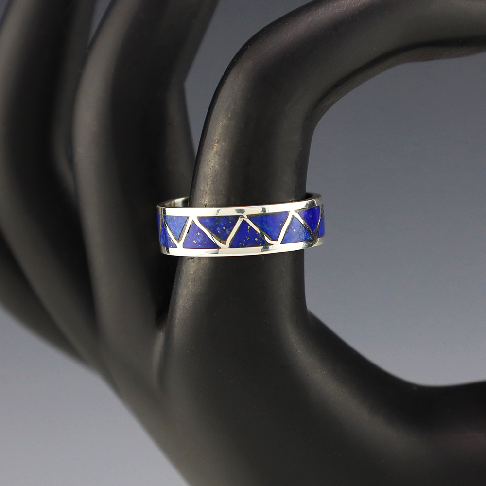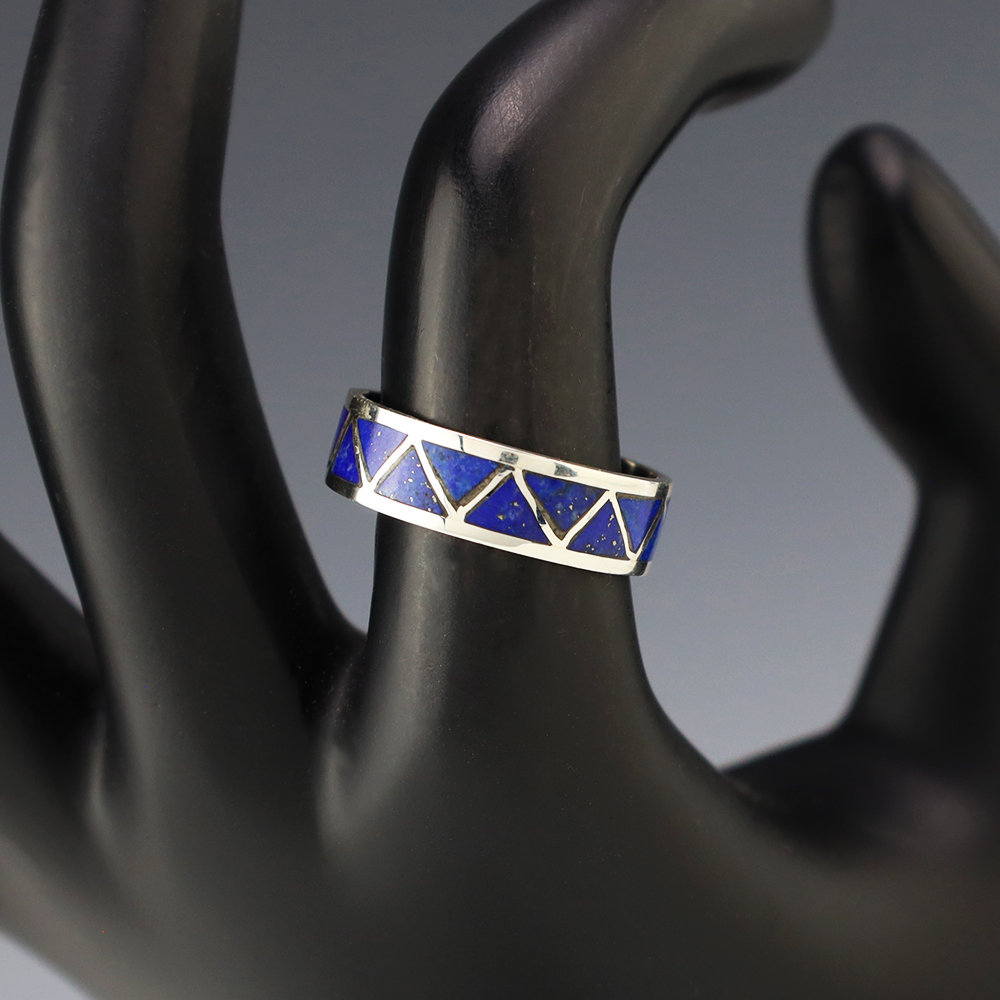 Zuni artists are known for their fine lapidary skills. Each stone is hand cut, polished, and set into a sterling silver setting. The ring is set with Lapis stones. Hand made by Zuni artist Charlene Sice. Weighs 4 grams. Size 8 1/2. Signed