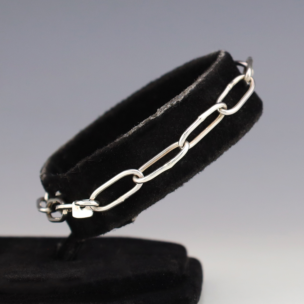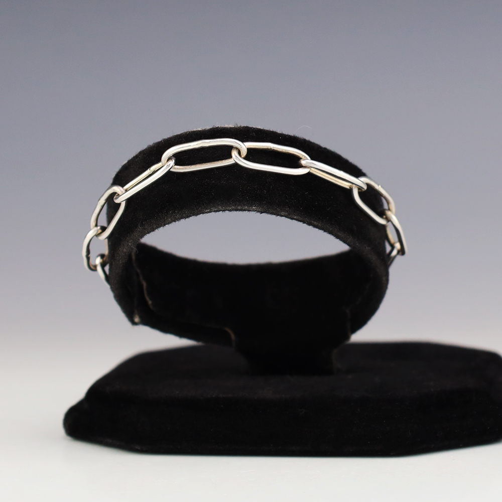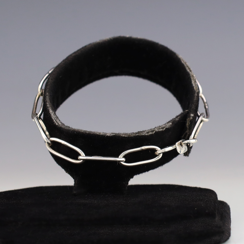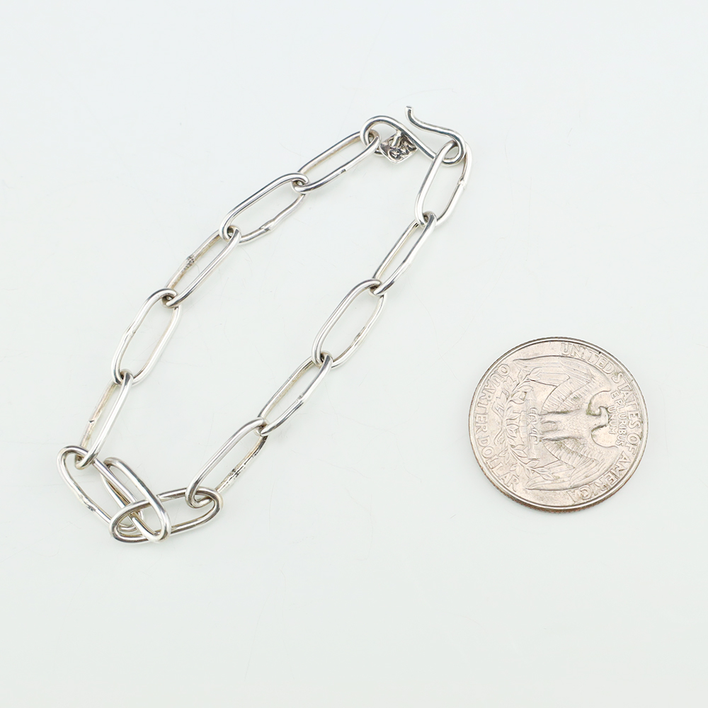 Zuni jeweler Carlo Lonjose hand crafted this lovely link bracelet. The bracelet is sterling silver. Fits up to a 6″ wrist. Weighs 6 grams. Signed.