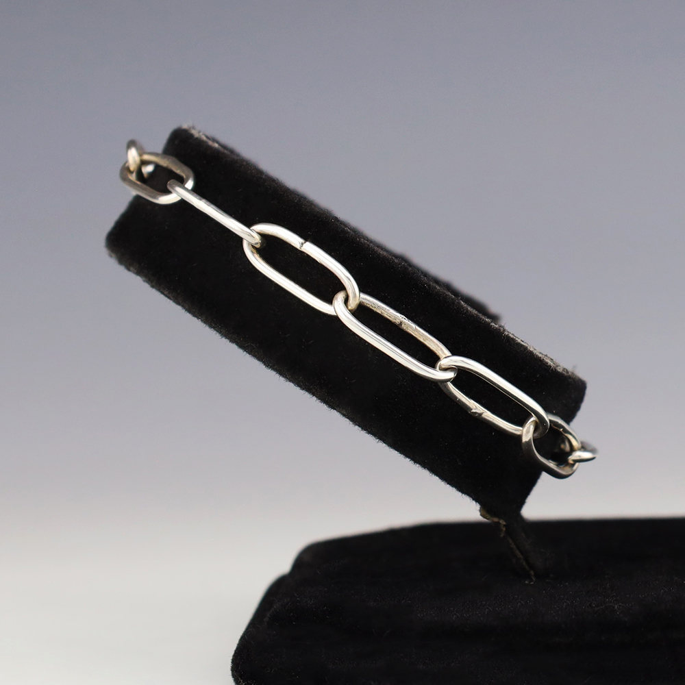 Zuni jeweler Carlo Lonjose hand crafted this lovely link bracelet. The bracelet is sterling silver. Fits up to a 6″ wrist. Weighs 6 grams. Signed.