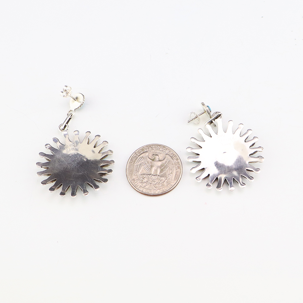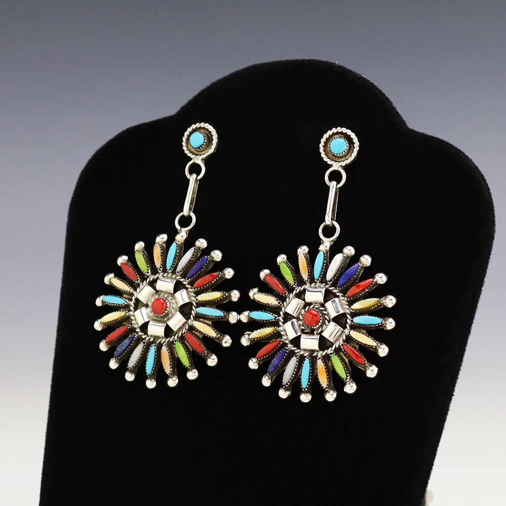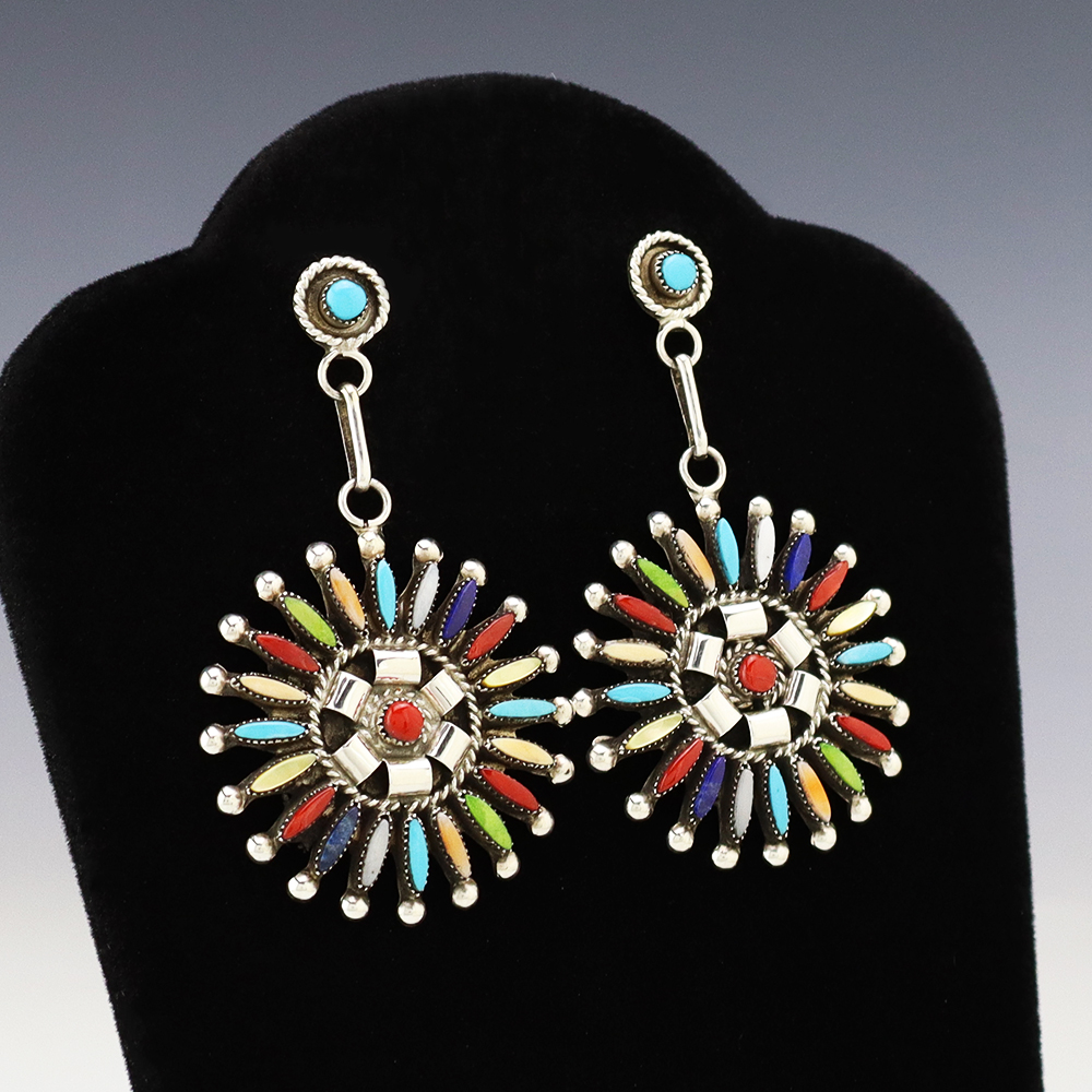 Made in the highly regarded petit point style, each earring features Turquoise, Coral, Mother of Pearl Shell, Pink Coral, Lapis, Melon Shell, and Jet stones inlaid into a sterling silver setting. Hand made by Zuni artist Dan Etsate. Weighs 12 grams. These gorgeous earrings will become a versatile accessory in your jewelry collection. Signed