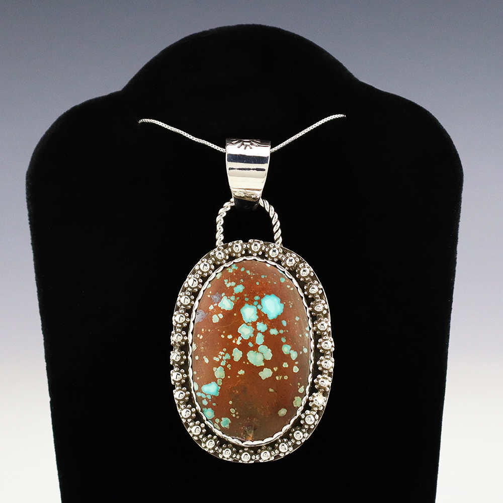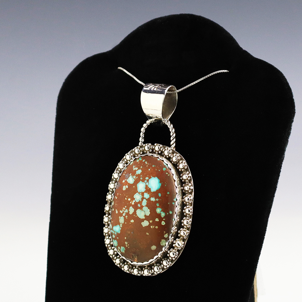 Beautiful pendant out of sterling silver and Number Eight Turquoise. Hand made by Zuni artist Brian Yatsattie. Brian cuts his own stones. A timeless beauty that you will enjoy for years to come. Weighs 26 grams. Signed