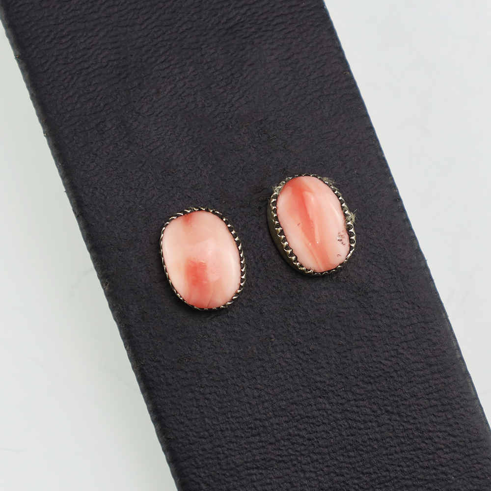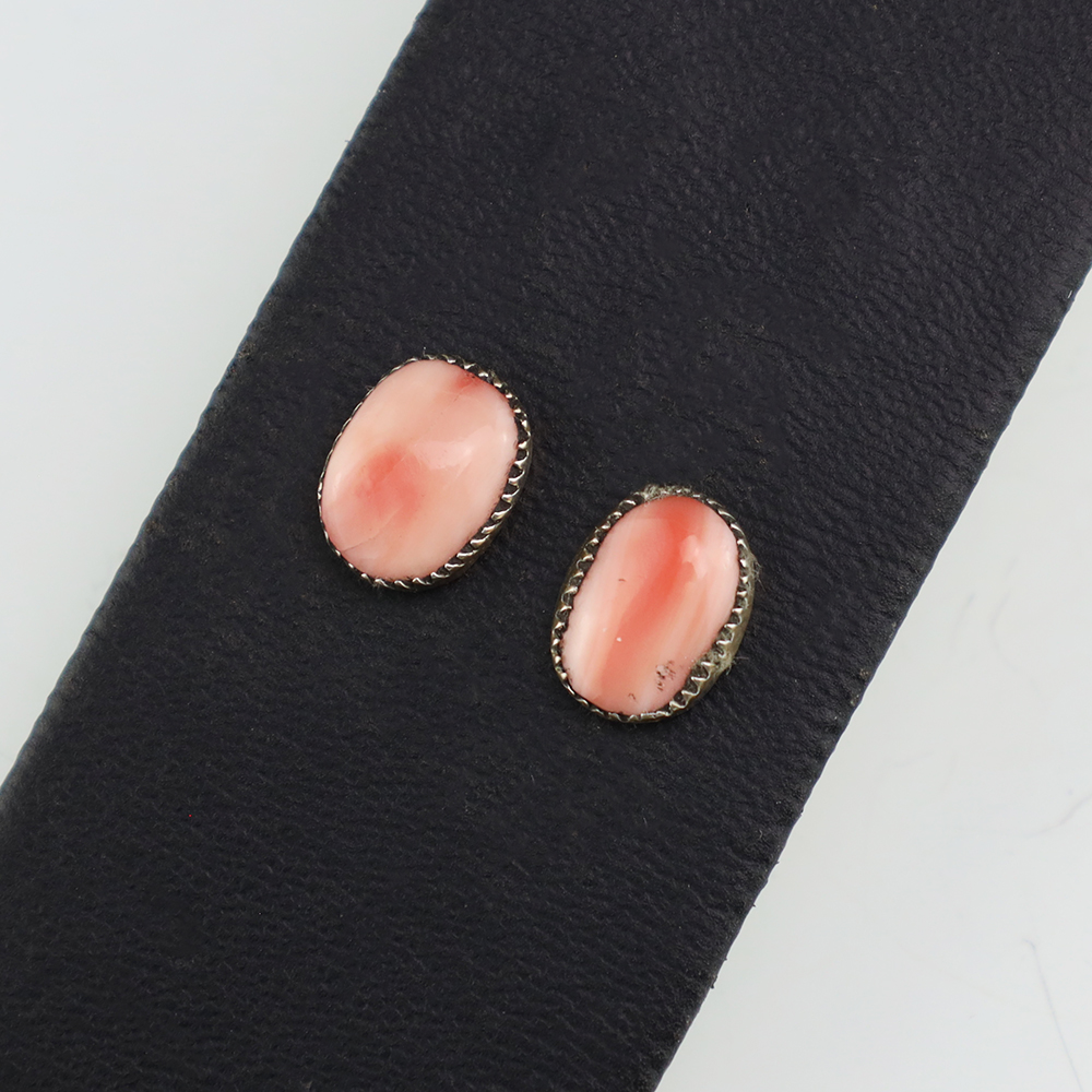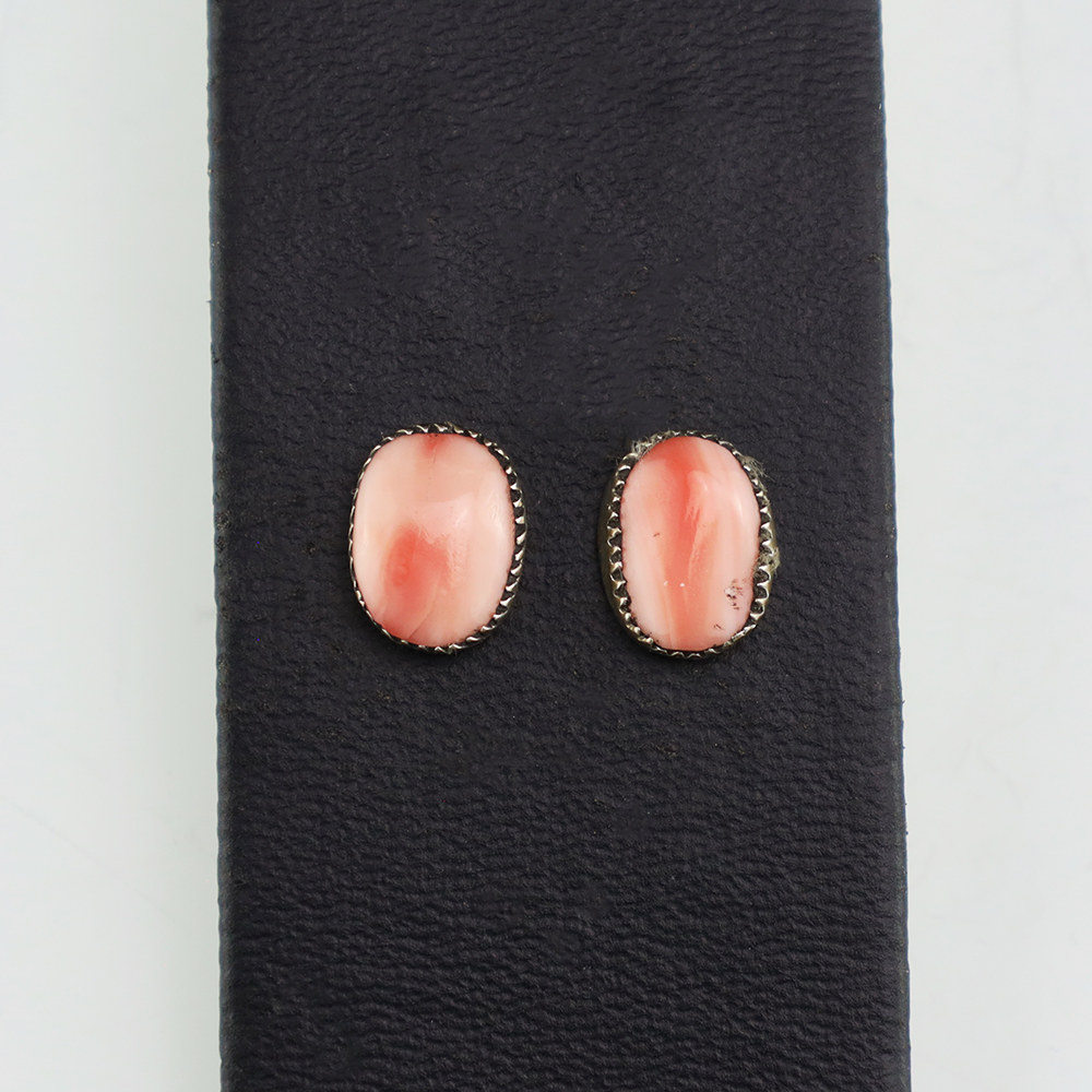 Zuni artist, Diane Lonjose created these lovely earrings. Made out of sterling silver and set with natural Pink Coral. The components are all hand fabricated and the stones are all natural. Diane comes from a family of Zuni jewelers. She is the daughter of Alice and Duane Quam, and grandchild of Doris and Wayne Ondelacy. Weighs 2 gram.