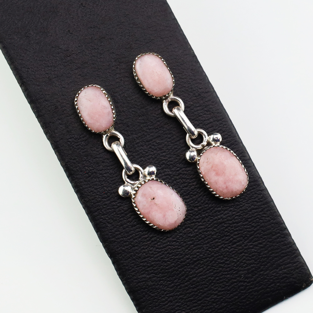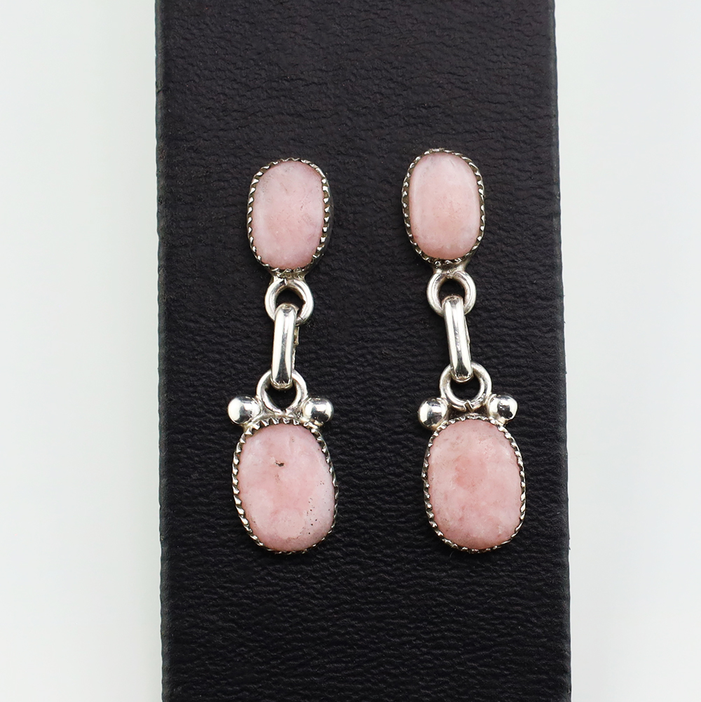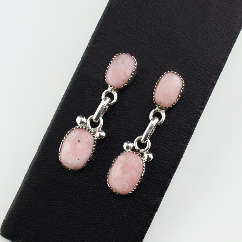Zuni artist, Diane Lonjose made these beautiful earrings. Made out of sterling silver and set with natural Pink Opal stones. The components are all hand fabricated, and the stones are all natural. Diane comes from a family of Zuni jewelers. She is the daughter of Alice and Duane Quam, and grandchild of Doris and Wayne Ondelacy. Weighs 4 grams. Signed