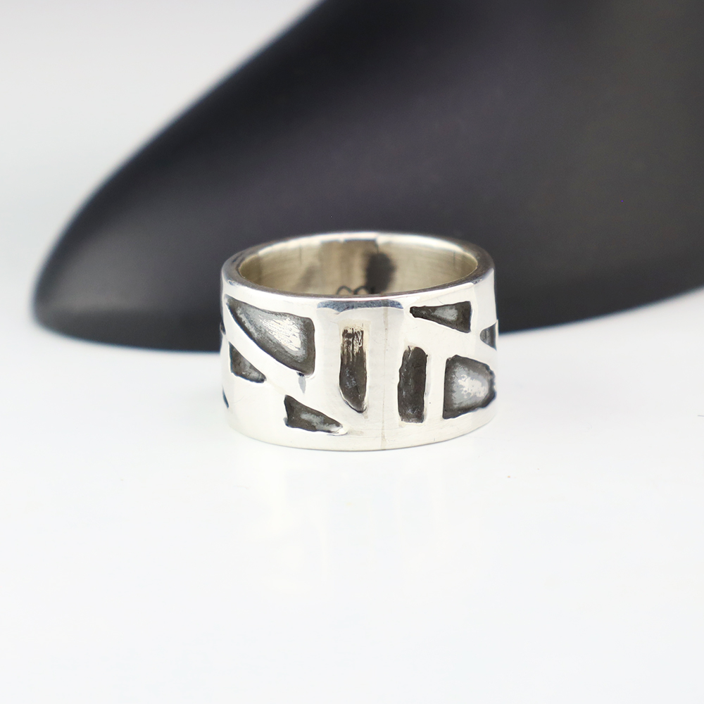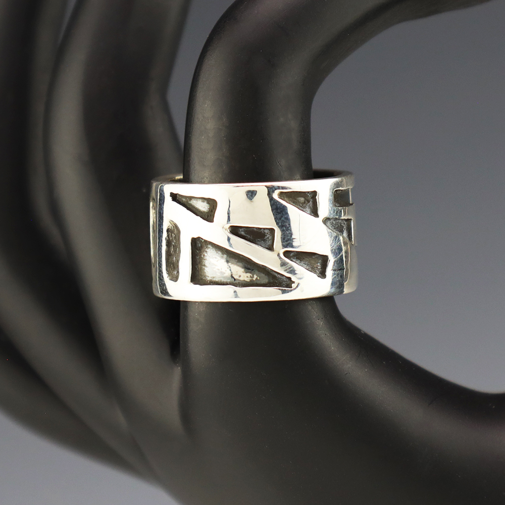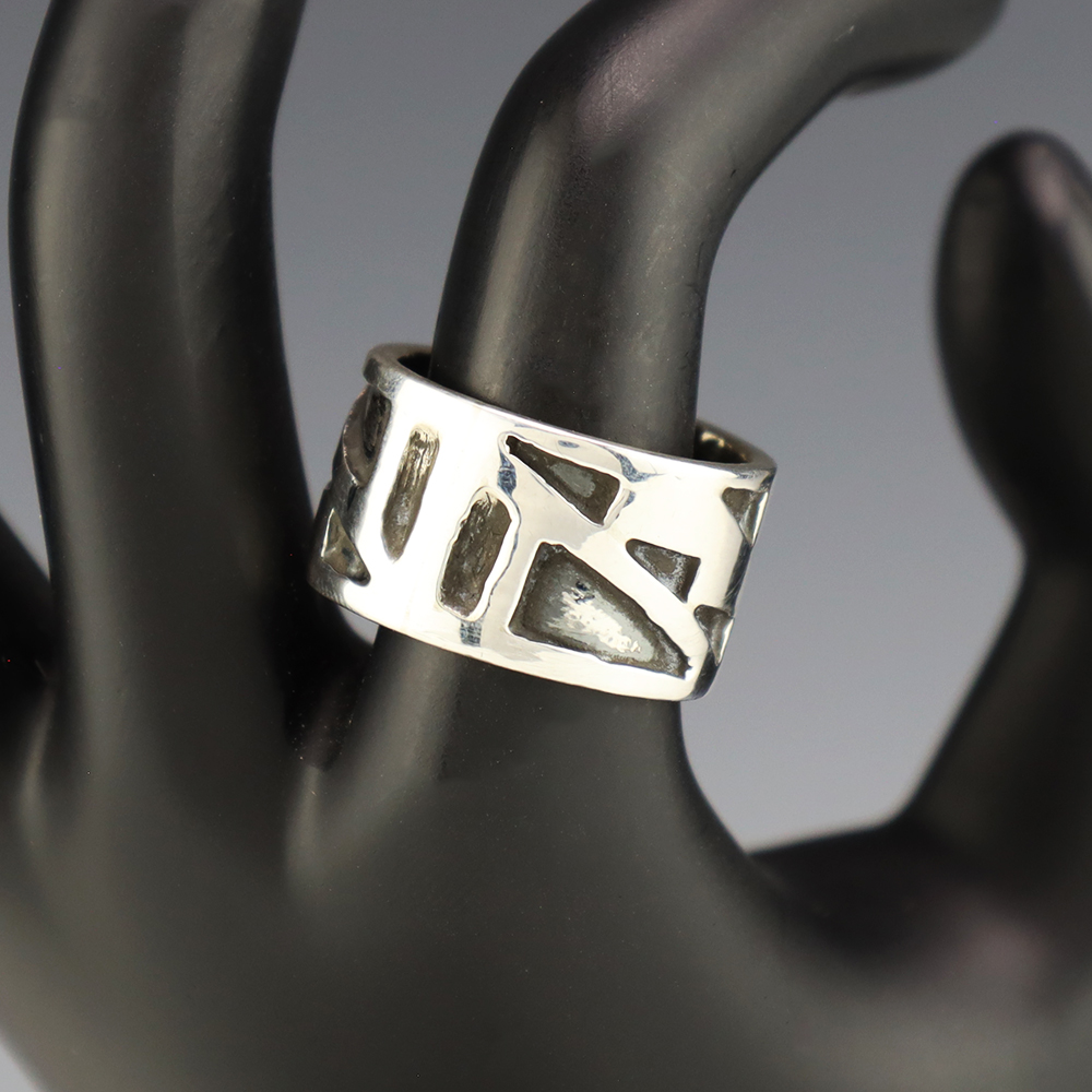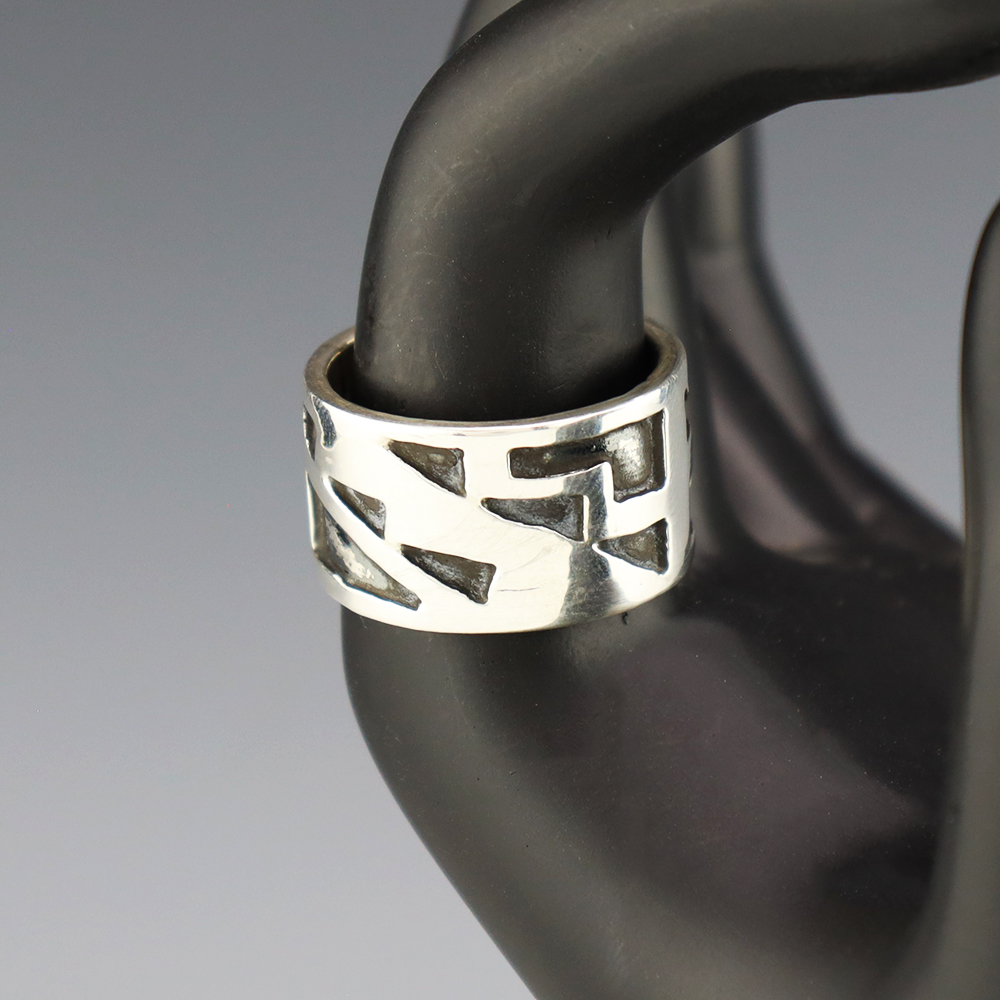 Zuni artist Carlo Lonjose hand crafted this marvelous ring. The ring is sterling silver with a great overlay design. Weighs 14 grams. Signed. Size 9. note-ring measures at size 9, but fits about 8 1/2 because of the width of the band.