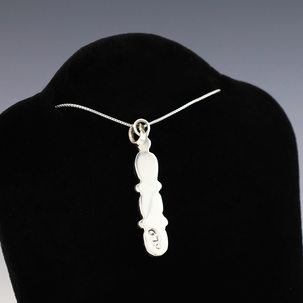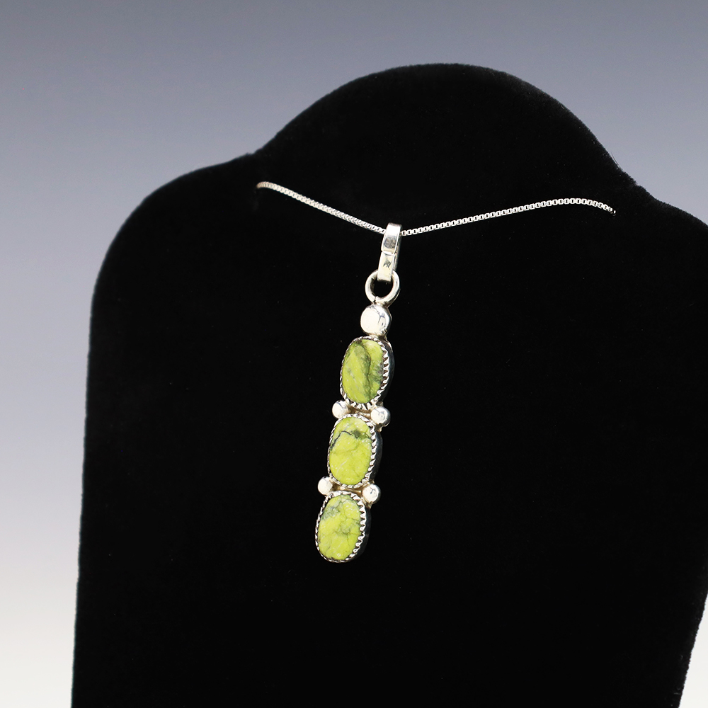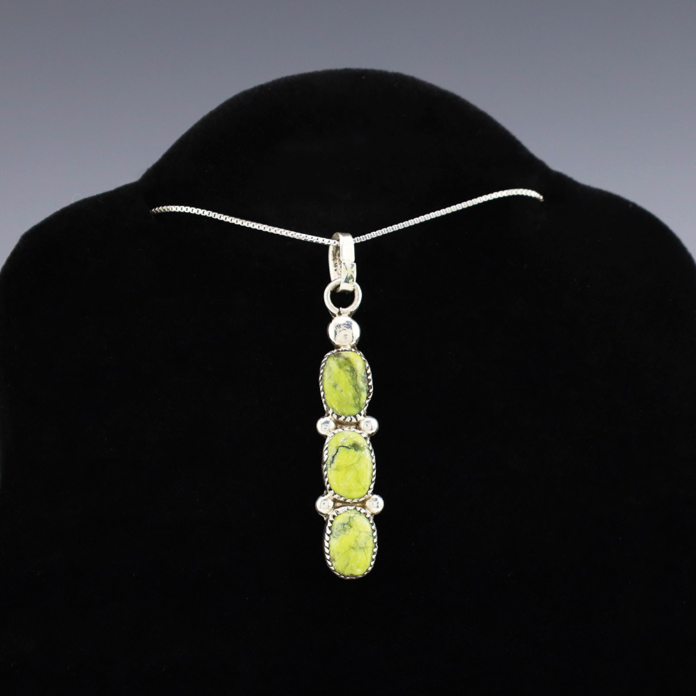 Zuni artist Diane Lonjose hand made this beautiful pendant. Made out of sterling silver and Serpentine. The components are all hand fabricated, and the stones are all natural. Diane comes from a family of Zuni jewelers. She is the daughter of Alice and Duane Quam, and grandchild of Doris and Warren Ondelacy. Weighs 4 grams. Signed (Chain not included)
