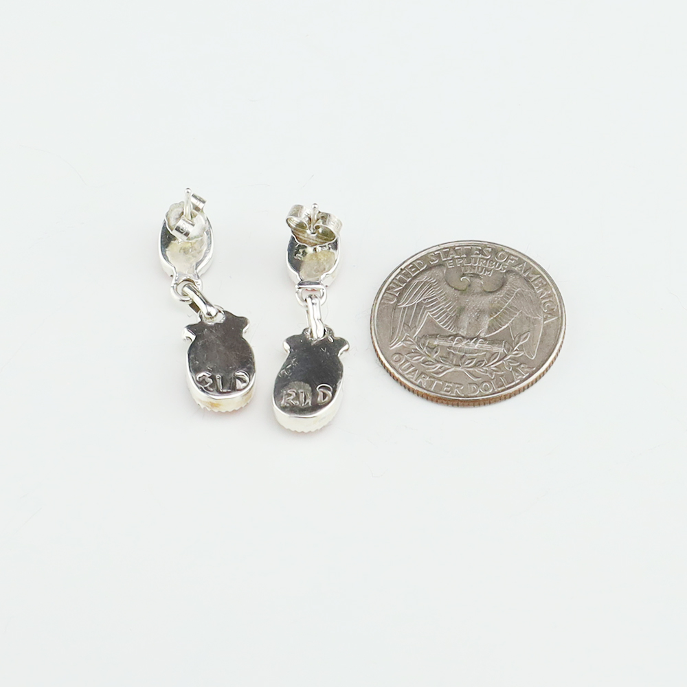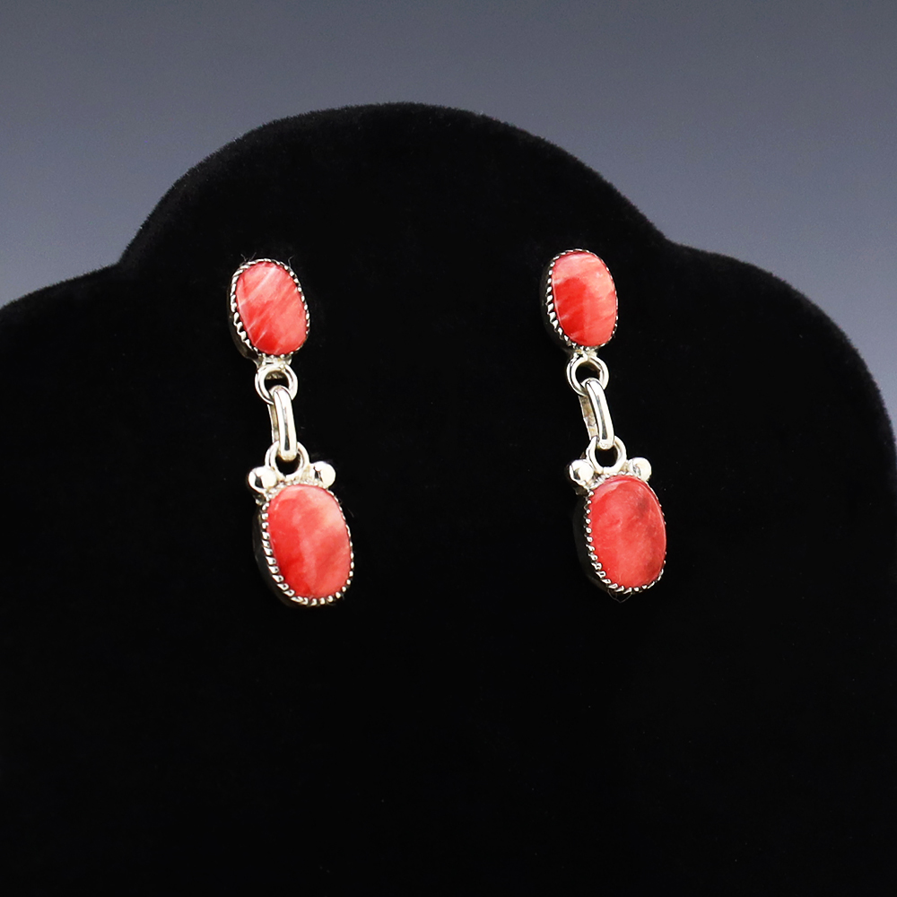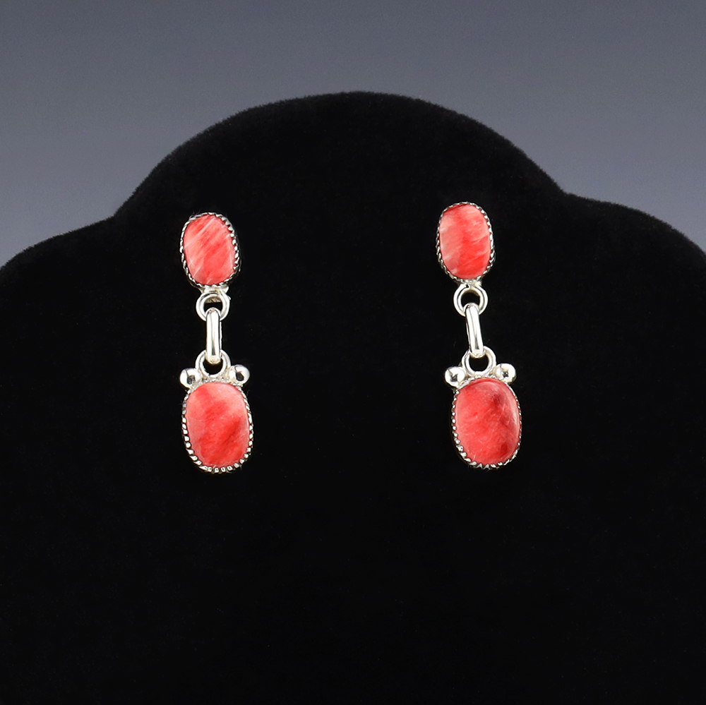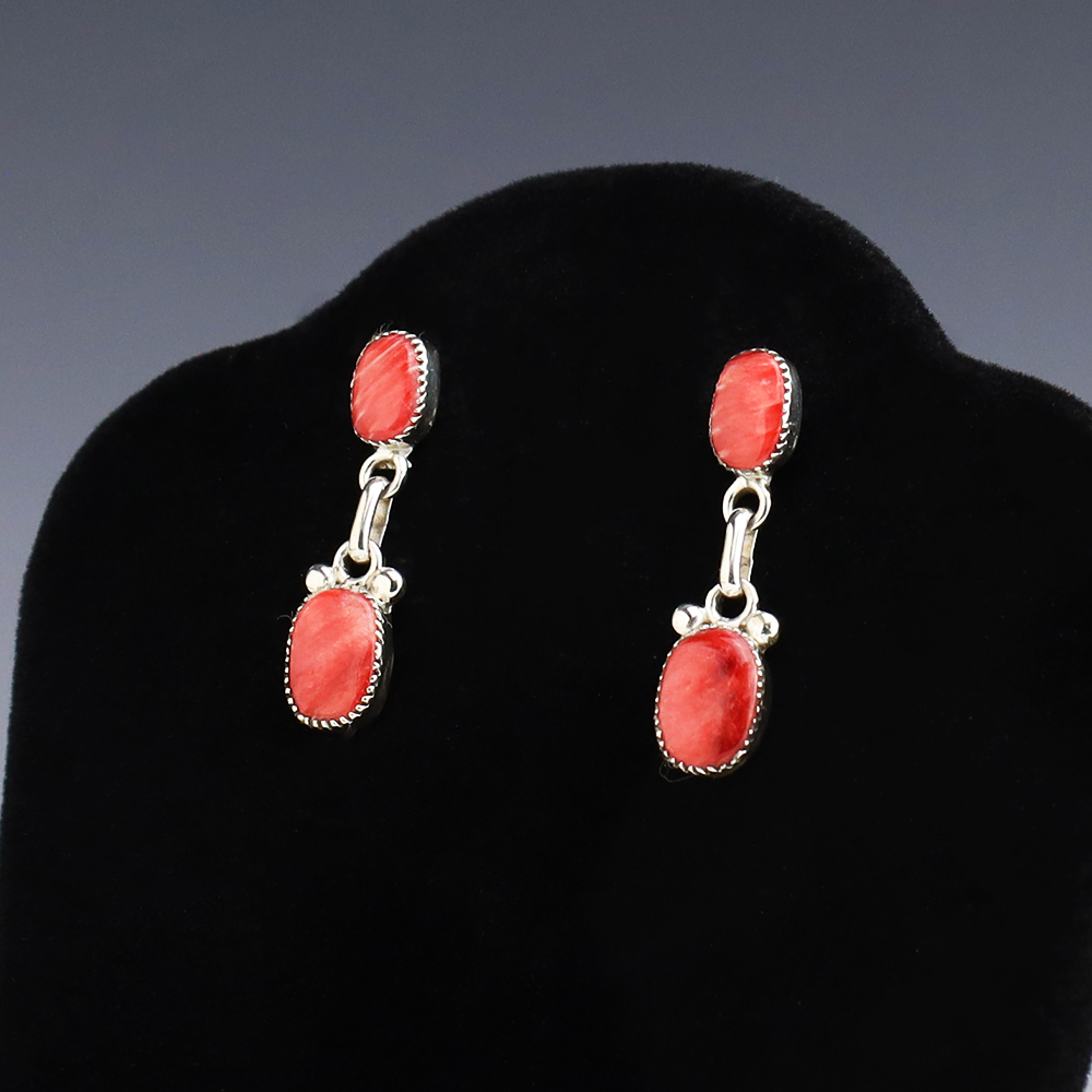 Zuni artist, Diane Lonjose made these beautiful earrings. Made out of sterling silver and set with Spiny Oyster. The components are all hand fabricated, and the stones are all natural. Diane comes from a family of Zuni jewelers. She is the daughter of Alice and Duane Quam, and grandchild of Doris and Warren Ondelacy. Weighs 4 grams. Signed
