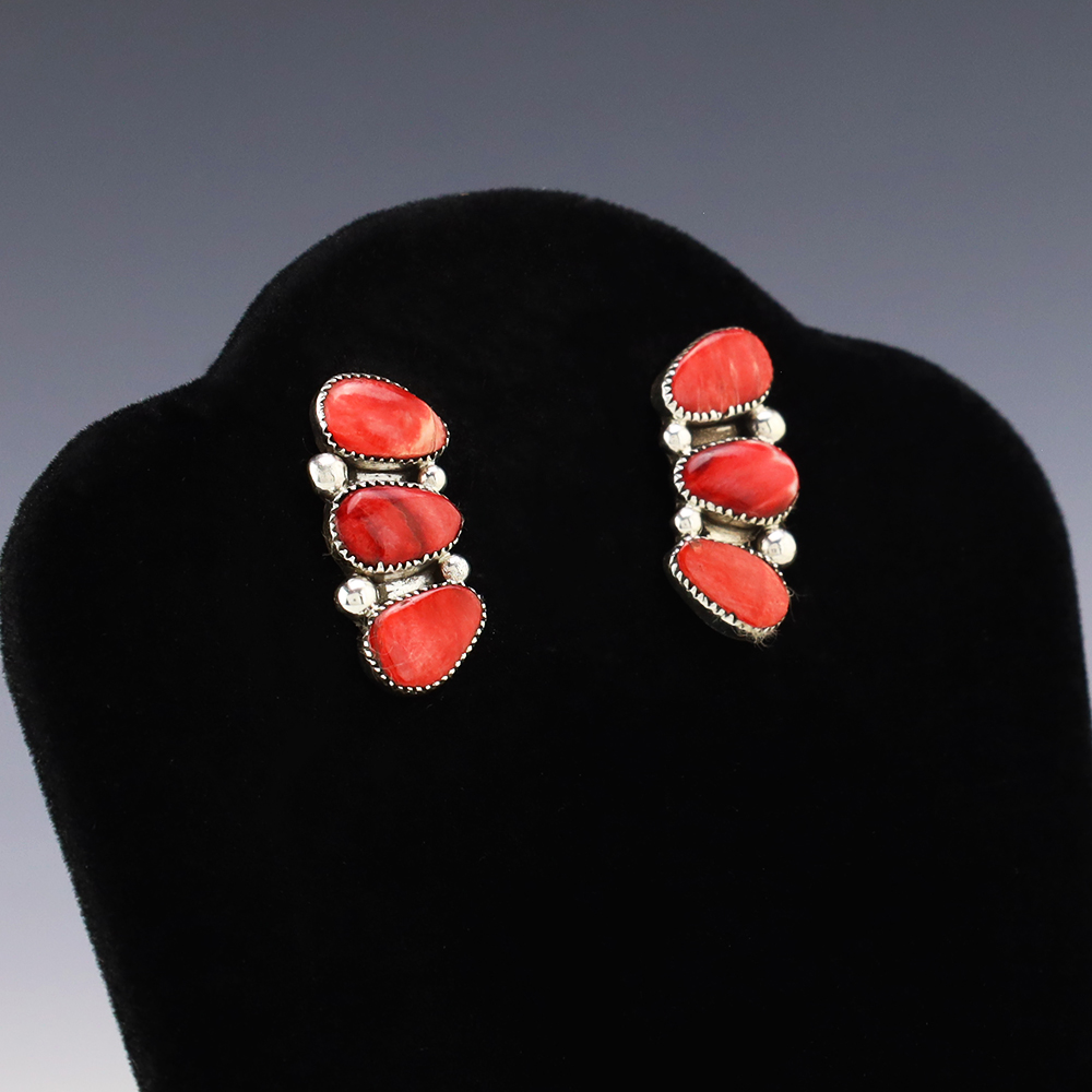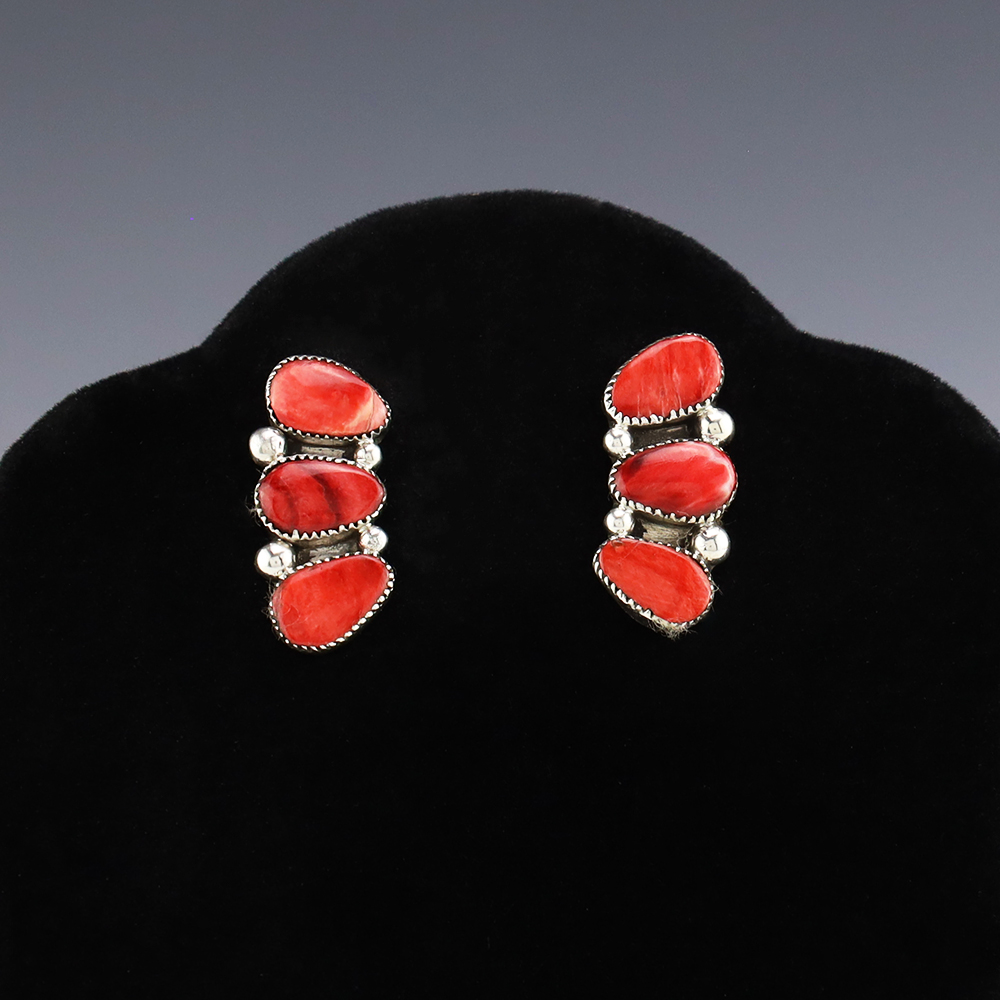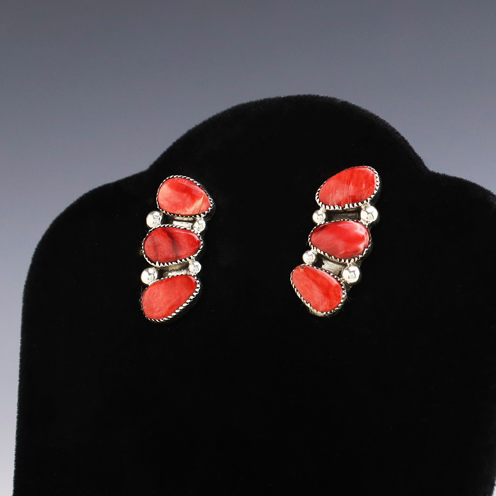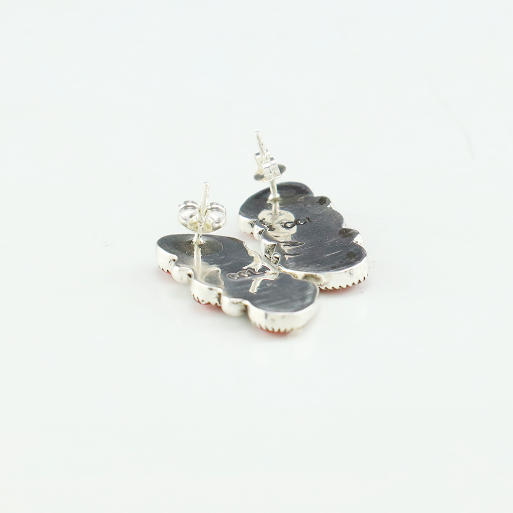 Zuni artist Carlo Lonjose made these gorgeous earrings out of sterling silver and natural Spiny Oyster. These cluster earrings will become a versatile accessory in your jewelry collection. Weighs 6 grams. Signed
