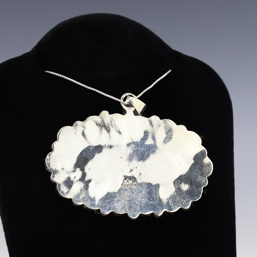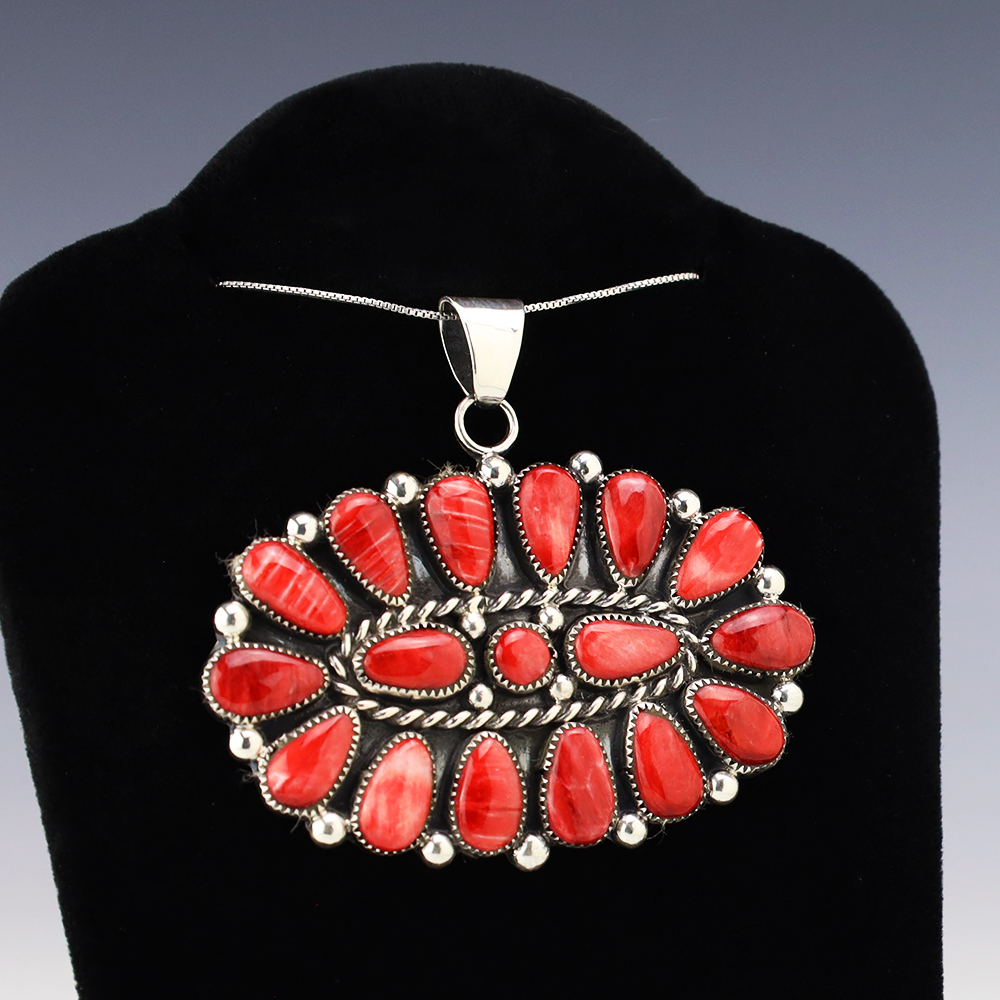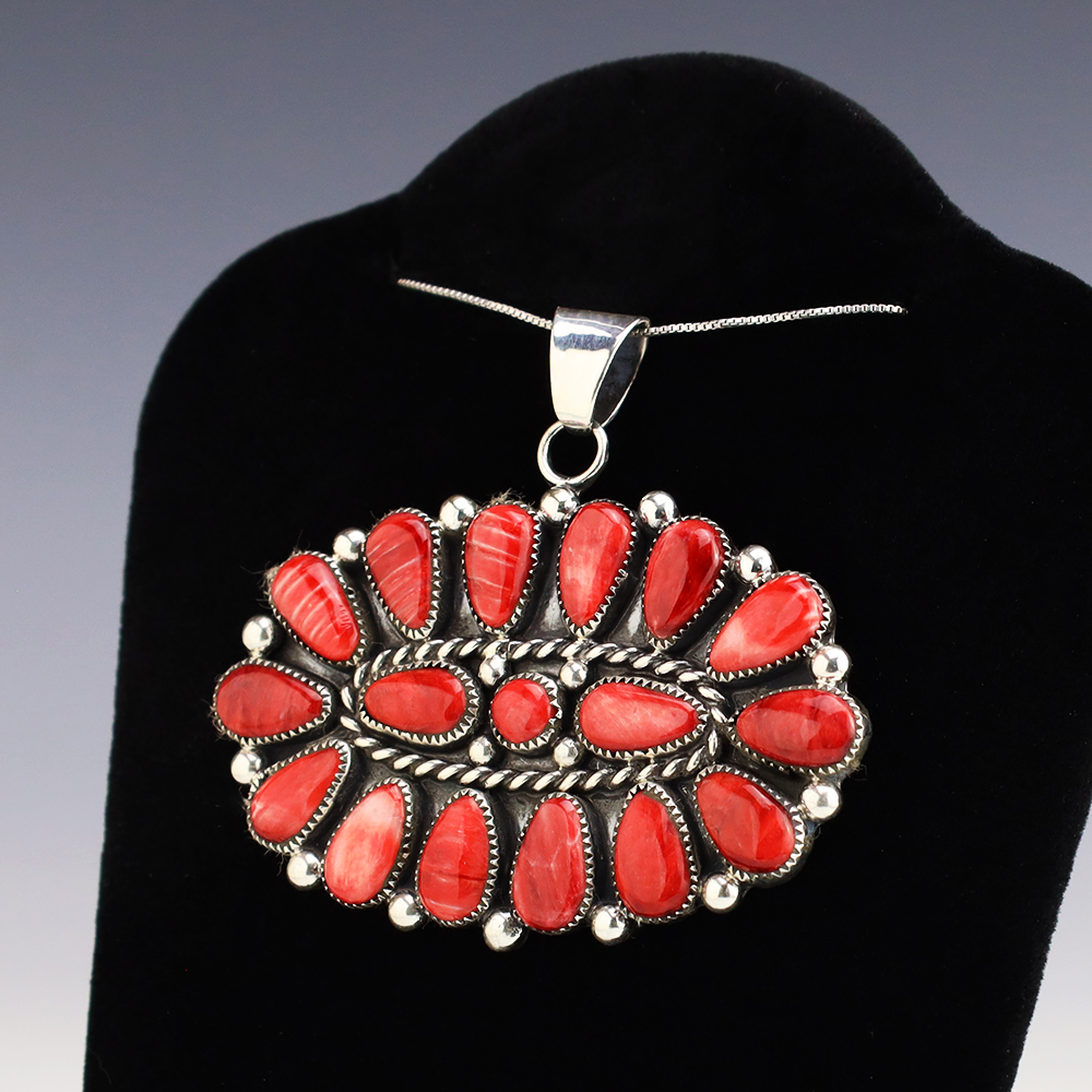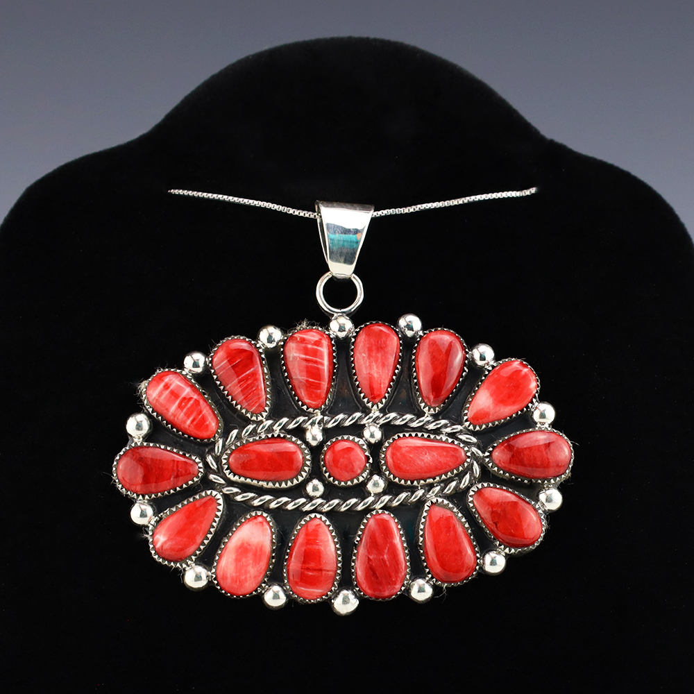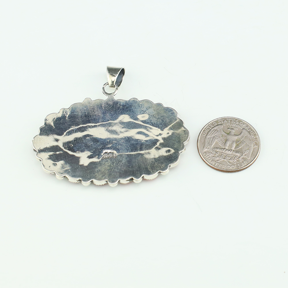 Zuni artist Carlo Lonjose hand made this beautiful pendant. Made out of sterling silver and natural Spiny Oyster. Carlo comes from a family of Zuni jewelers. Weighs 22 grams. Signed (Chain not included) Bail will accommodate up to a 5mm necklace.