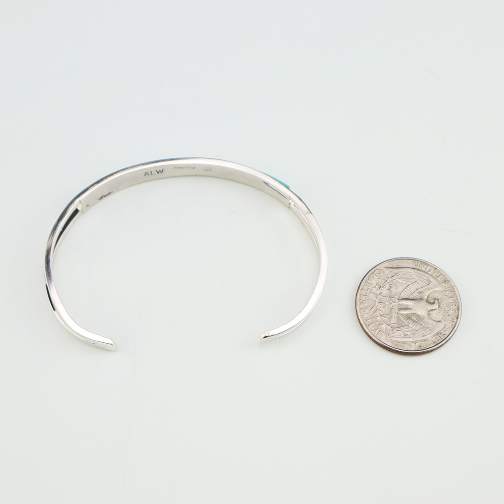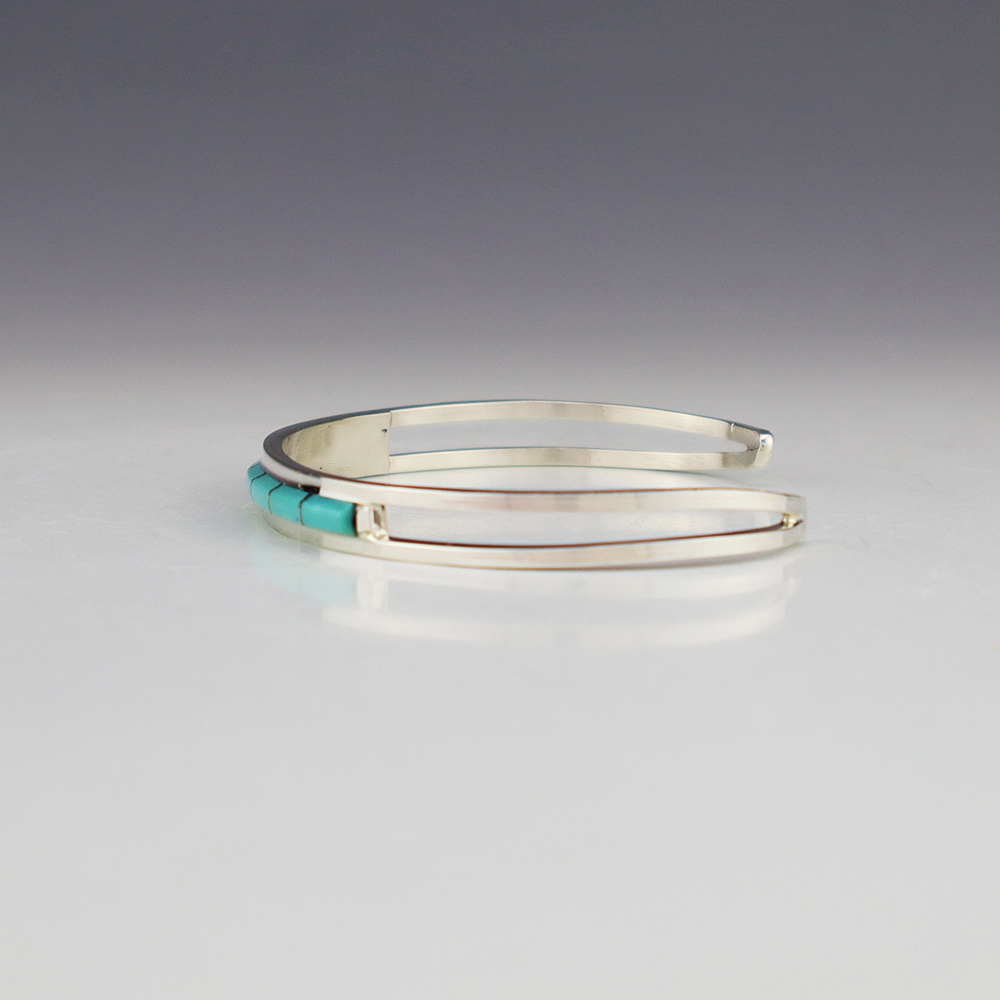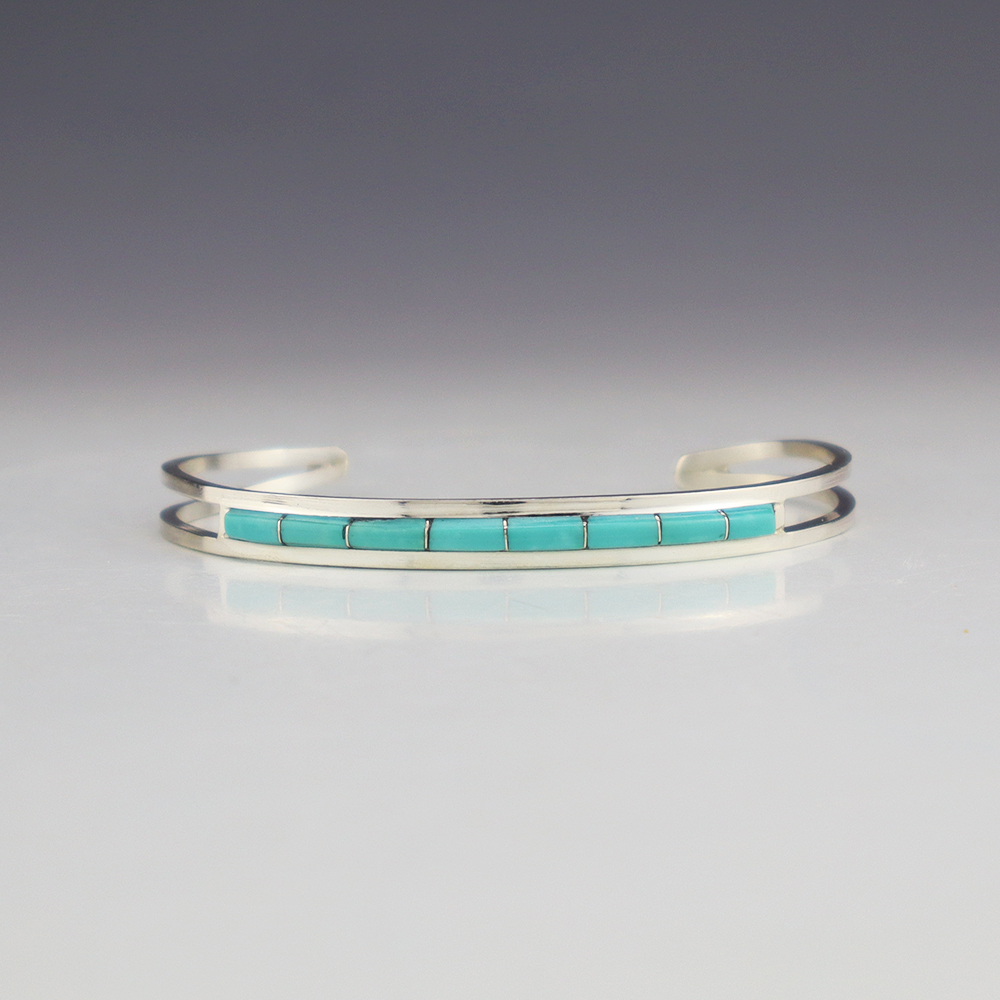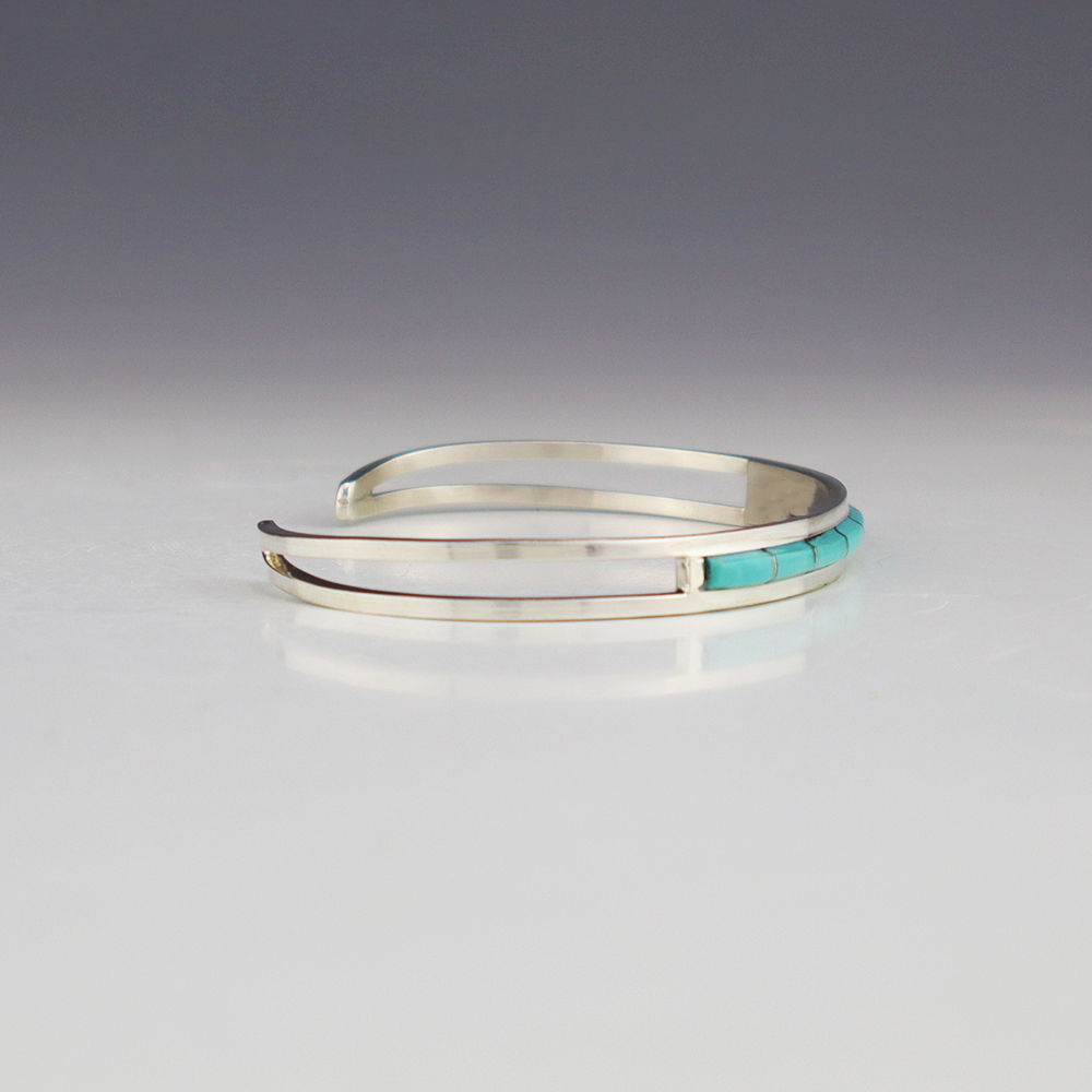 Zuni artists Anson and Leticia Wallace made this beautiful bracelet. Zuni artists are known for their fine lapidary skills. Each stone is hand cut, polished, and set into a sterling silver setting. The bracelet is sterling silver and inlaid with Turquoise. Weighs 8 grams. Signed.