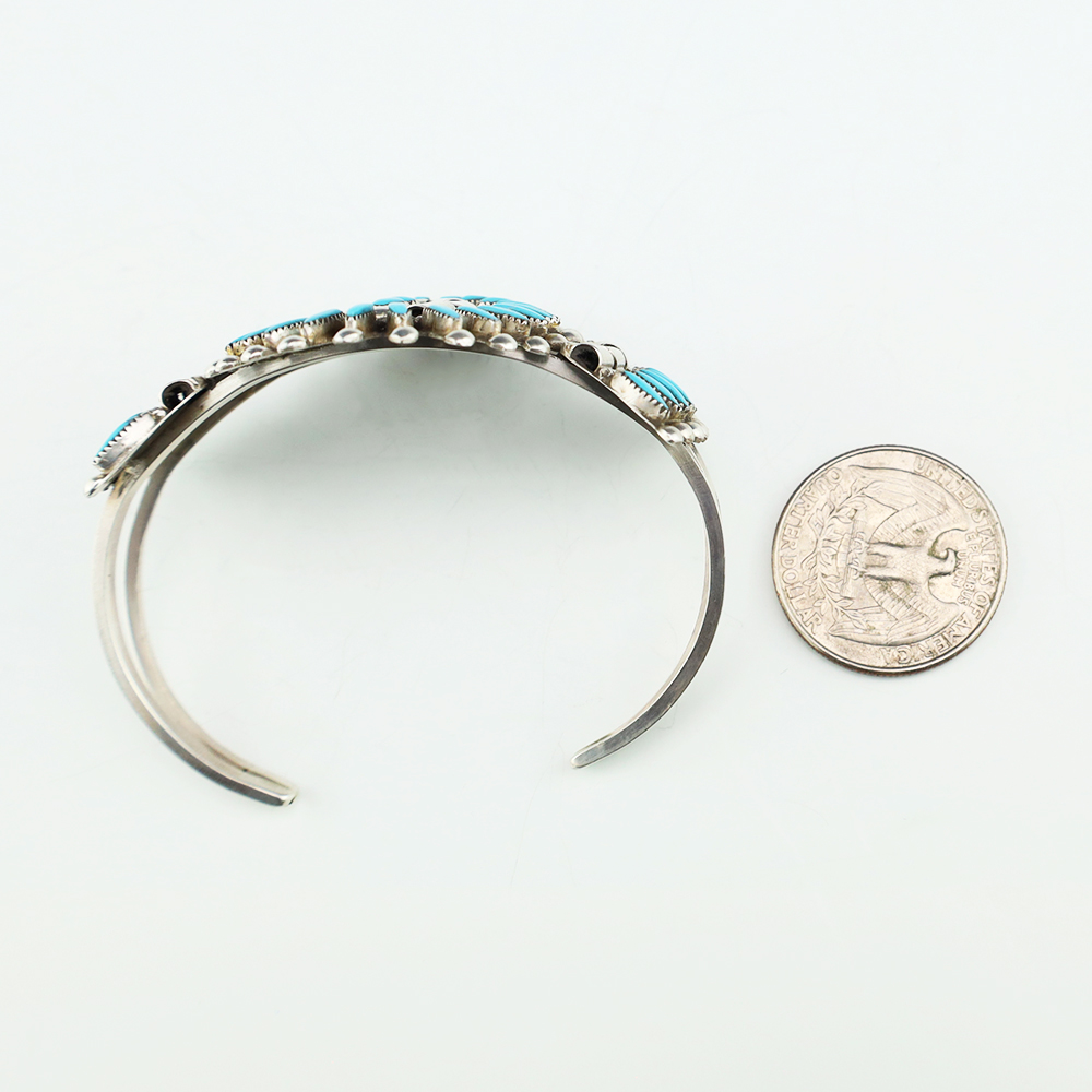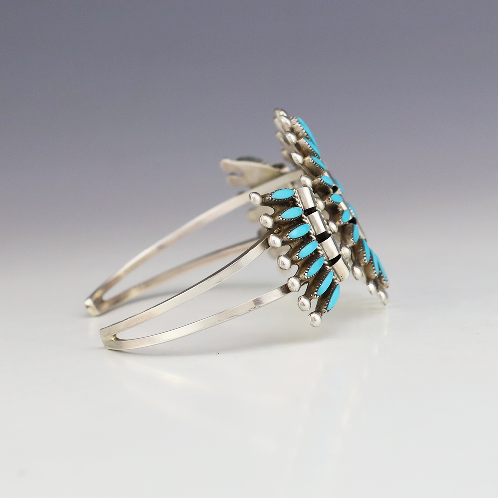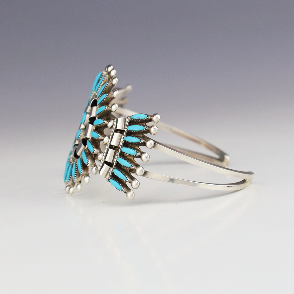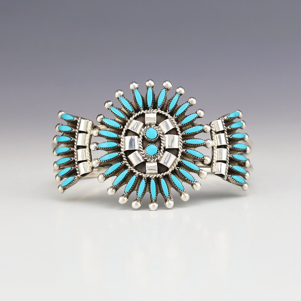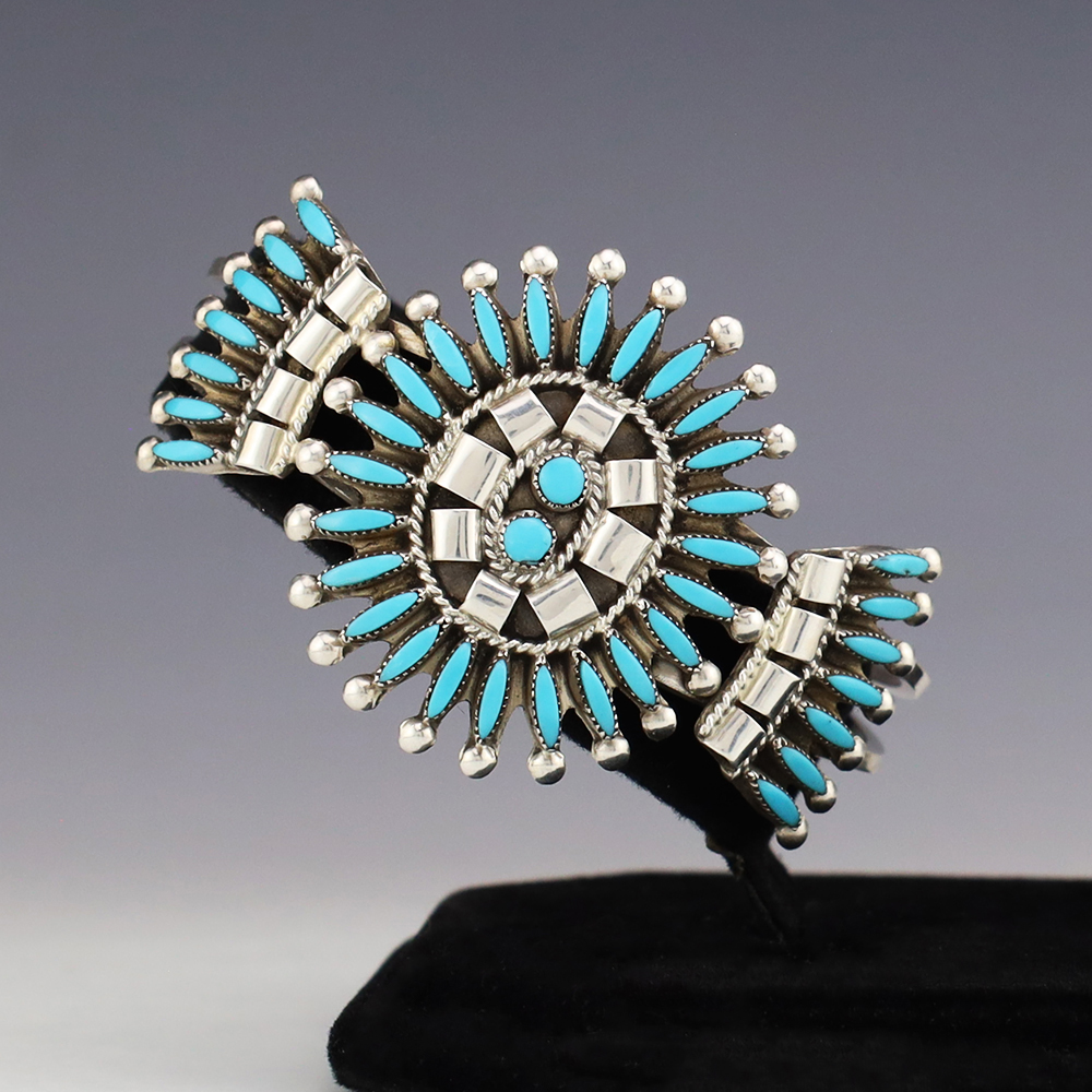 Zuni artist Dan Etsate made this gorgeous needlepoint bracelet. Zuni artists are known for their fine lapidary skills. Each stone is hand cut, polished, and set into a sterling silver setting. The bracelet is sterling silver and set with Turquoise stones. Weighs 20 grams. Signed.
