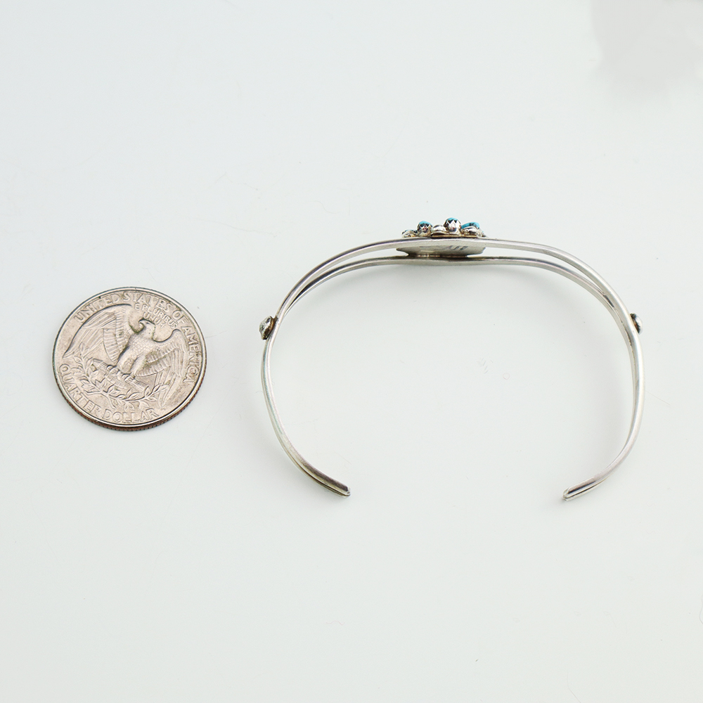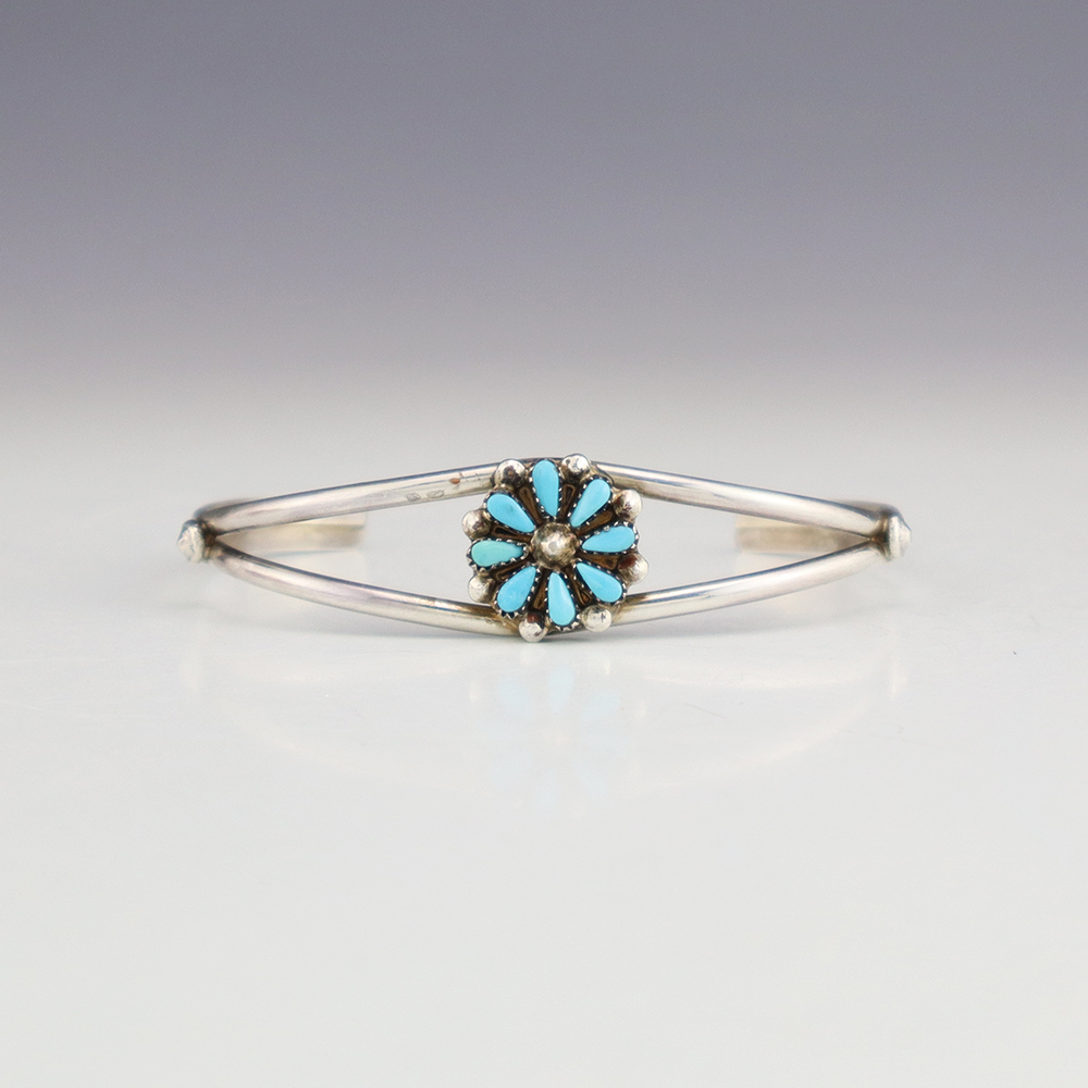 Zuni artists David and Sarita Leekity made this beautiful bracelet. Zuni artists are known for their fine lapidary skills. Each stone is hand cut, polished, and set into a sterling silver setting. The bracelet is sterling silver and inlaid with Turquoise. Weighs 8 grams.