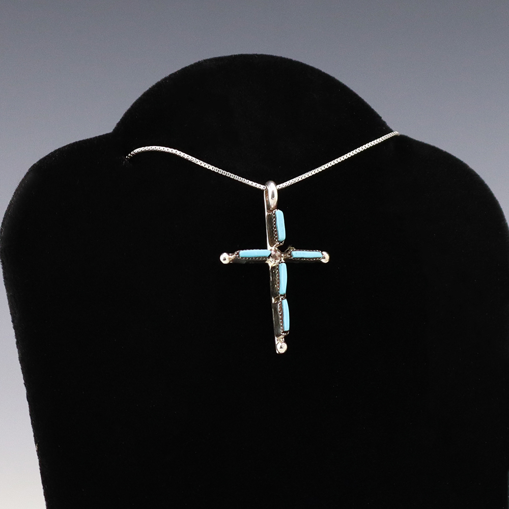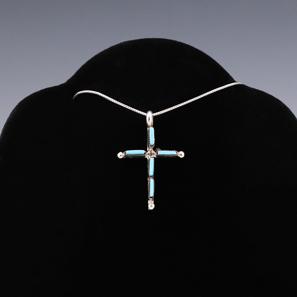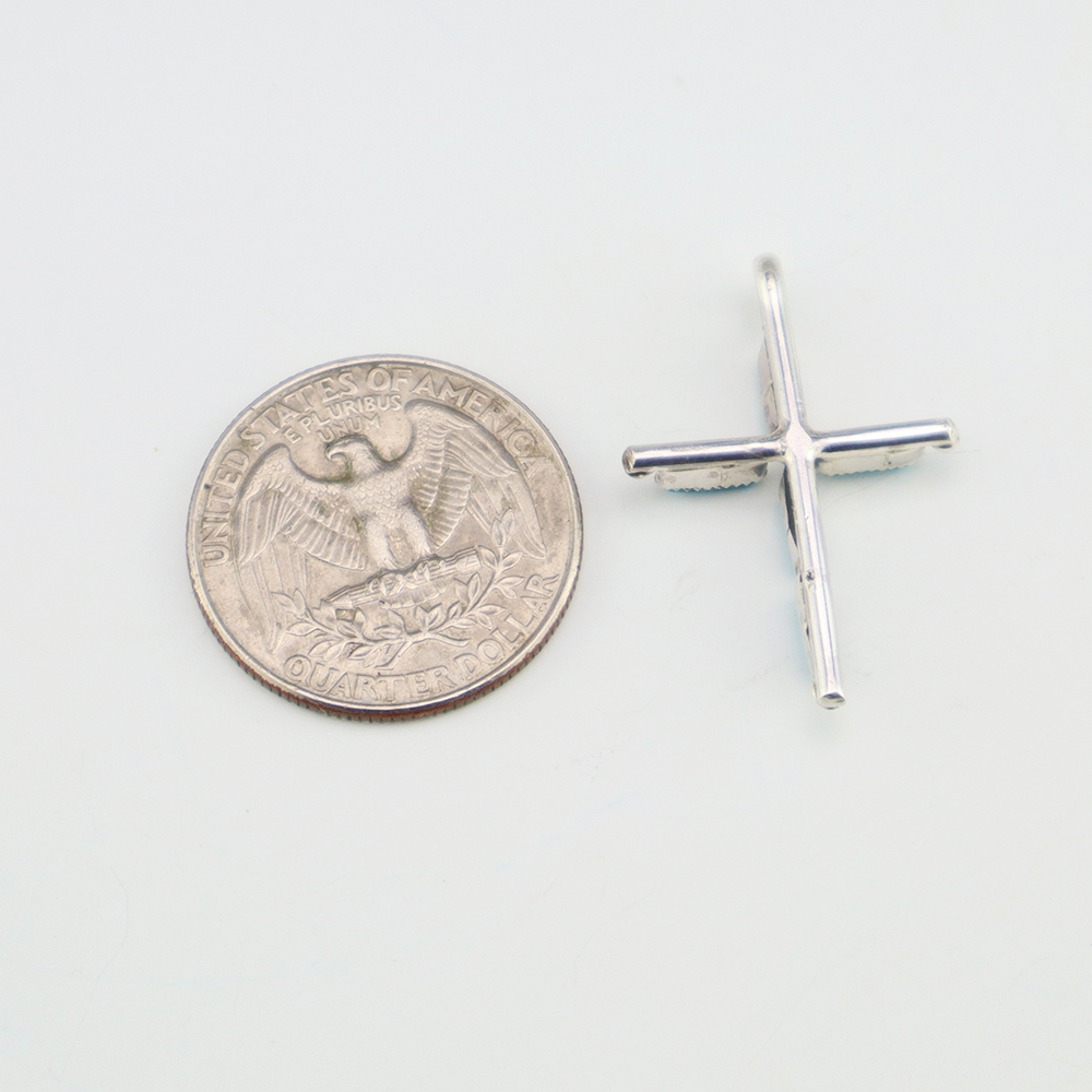 Lovely cross pendant made out of sterling silver and Turquoise by Zuni artist Jill Peywa. Zuni artists are known for their fine lapidary skills. Each stone is hand cut, polished, and set into a sterling silver setting. Weighs 2 grams. (Chain not included)