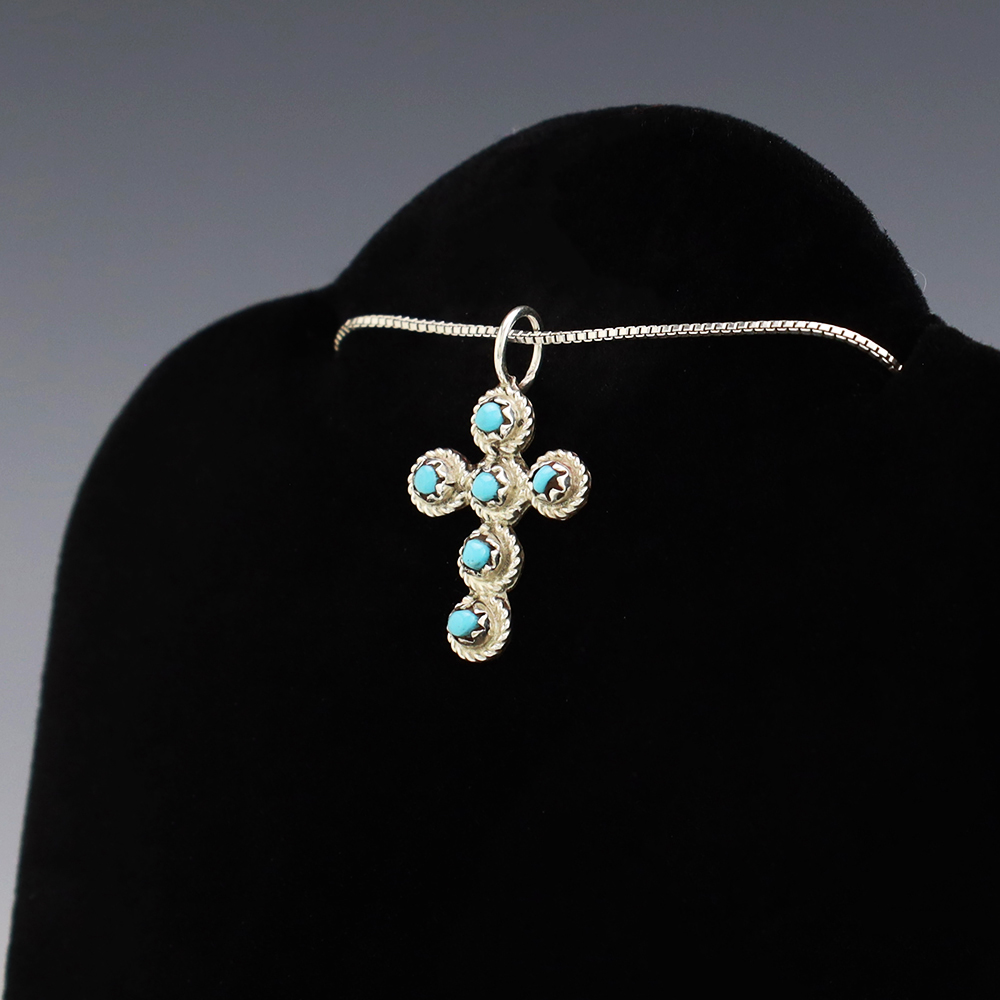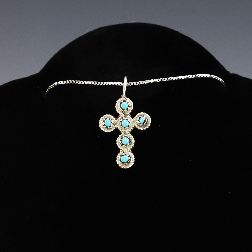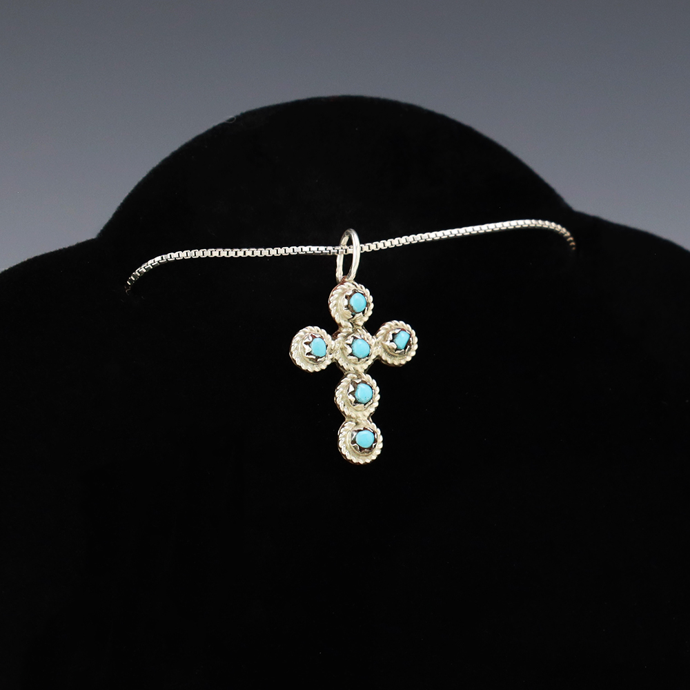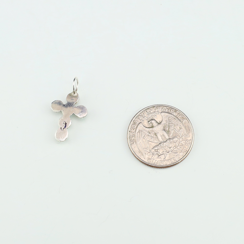 Zuni artists are known for their fine lapidary skills. This cross pendant is no exception. Lovely cross pendant made out of sterling silver and set with Turquoise. (Chain not included) Weighs 2 grams. Signed